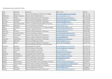 Certyfikowani trenerzy ECHOCAST Polska Imię Piotr Małgorzata Aleksandra Barbara Katarzyna Monika Magdalena Agata Elżbieta Katarzyna Agnieszka Jagoda Piotr Katarzyna Jadwiga Milena Nazwisko Adamczyk Berger-Jankowska Głowacz Gołębiowska Goźlińska Herkt-Rynarzewska Jabłońska Józefowicz Kluz Kmiotek Kozłowska-Piasta Kruszewska Lewczuk Liwak-Rybak Martyniak Mućka Katarzyna Urszula Iwona Kanga Agnieszka Helena Bożena Andrzej Magda Urszula Hanna Beata Paulina Nowicka Ostrowska Parzyńska Pierz Piórkowska Postawka-Lech Pysiewicz Rajch Robaszkiewicz Rzeszut-Baran Sabat Salamon Skorwider Instytucja Muzeum Archeologiczno-Historyczne w Elblągu Muzeum Historii Żydów Polskich Muzeum Pałacu Króla Jana III w Wilanowie Muzeum Józefa Piłsudskiego w Sulejówku Muzeum Łazienki Królewskie w Warszawie Centrum Turystyki Kulturowej TRAKT w Poznaniu Muzeum Narodowe w Krakowie Muzeum Ziemi Kępińskiej im. T.P. Potworowskiego Muzeum - Zamek w Łańcucie Muzeum Łazienki Królewskie w Warszawie Muzeum Narodowe w Kielcach Muzeum Pałacu Króla Jana III w Wilanowie Muzeum Łazienki Królewskie w Warszawie Muzeum Pałacu Króla Jana III w Wilanowie Muzeum w Nieborowie i Arkadii Muzeum Łazienki Królewskie w Warszawie Muzeum Narodowe Rolnictwa i Przemysłu RolnoSpożywczego w Szreniawie Zamek Królewski w Warszawie Muzeum Narodowe w Krakowie Zamek Królewski w Warszawie Europejskie Centrum Solidarności Międzynarodowe Centrum Kultury Muzeum Narodowe w Warszawie Muzeum Narodowe w Krakowie Muzeum Początków Państwa Polskiego w Gnieźnie Muzeum Kultury Ludowej w Kolbuszowej Muzeum Sztuki Nowoczesnej w Warszawie Muzeum Narodowe w Poznaniu Muzeum Pałacu Króla Jana III w Wilanowie Adres e-mail [email protected] [email protected] [email protected] [email protected] [email protected] [email protected] [email protected] [email protected] [email protected] [email protected] [email protected] [email protected] [email protected] [email protected] [email protected] [email protected] [email protected] [email protected] [email protected] [email protected] [email protected] [email protected] [email protected] [email protected] [email protected] [email protected] [email protected] [email protected] [email protected] Telefon 507 041 911 604 431 288 515 256 439 510 374 178 664 118 367 668 113 657 797 029 930 505 604 017 535 016 040 726071985 603 187 787 514 878 505 501 007 878 509 300 238 601 363 232 504 972 260 61 810 76 29 505 158 171 609 430 129 664 118 306 506 195 728 512 234 378 606 207 352 606 833 644 503074307 608 105 295 794 115 793 604438867 506 892 911 Jolanta Monika Paweł Marta Stasiak Tomkiel Tyszka Walewska Muzeum Historii Żydów Polskich Centrum Sztuki Współczesnej Zamek Ujazdowski Zamek Królewski w Warszawie Muzeum Pałacu Króla Jana III w Wilanowie Katarzyna Patrycja Winter-Tomaszewska Zachęta - Narodowa Galeria Sztuki Żołędowska Muzeum Pałacu Króla Jana III w Wilanowie [email protected] [email protected] [email protected] [email protected] 605 599 985 532 389 784 664 118 367 785 905 735 [email protected] [email protected] 506 081 081 506 892 793