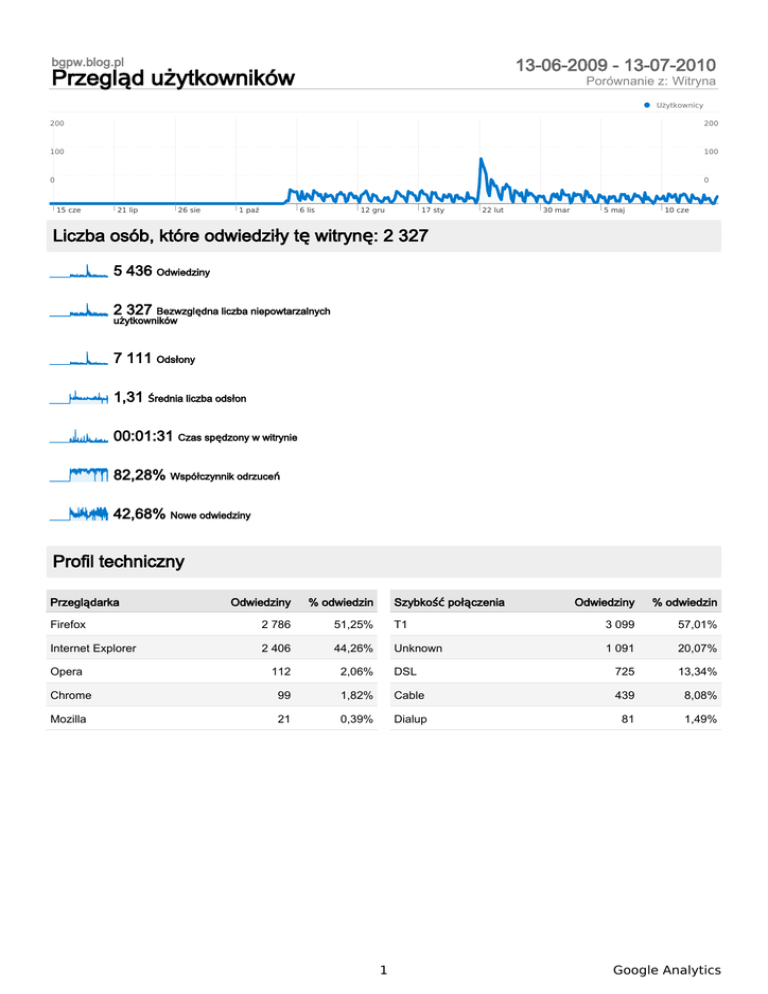 bgpw.blog.pl 13-06-2009 - 13-07-2010 Przegląd użytkowników Porównanie z: Witryna Użytkownicy 200 200 100 100 0 0 15 cze 21 lip 26 sie 1 paź 6 lis 12 gru 17 sty 22 lut 30 mar 5 maj 10 cze Liczba osób, które odwiedziły tę witrynę: 2 327 5 436 Odwiedziny 2 327 Bezwzględna liczba niepowtarzalnych użytkowników 7 111 Odsłony 1,31 Średnia liczba odsłon 00:01:31 Czas spędzony w witrynie 82,28% Współczynnik odrzuceń 42,68% Nowe odwiedziny Profil techniczny Przeglądarka Odwiedziny % odwiedzin Firefox 2 786 51,25% Internet Explorer 2 406 44,26% 112 2,06% Chrome 99 Mozilla 21 Opera Szybkość połączenia Odwiedziny % odwiedzin T1 3 099 57,01% Unknown 1 091 20,07% DSL 725 13,34% 1,82% Cable 439 8,08% 0,39% Dialup 81 1,49% 1 Google Analytics