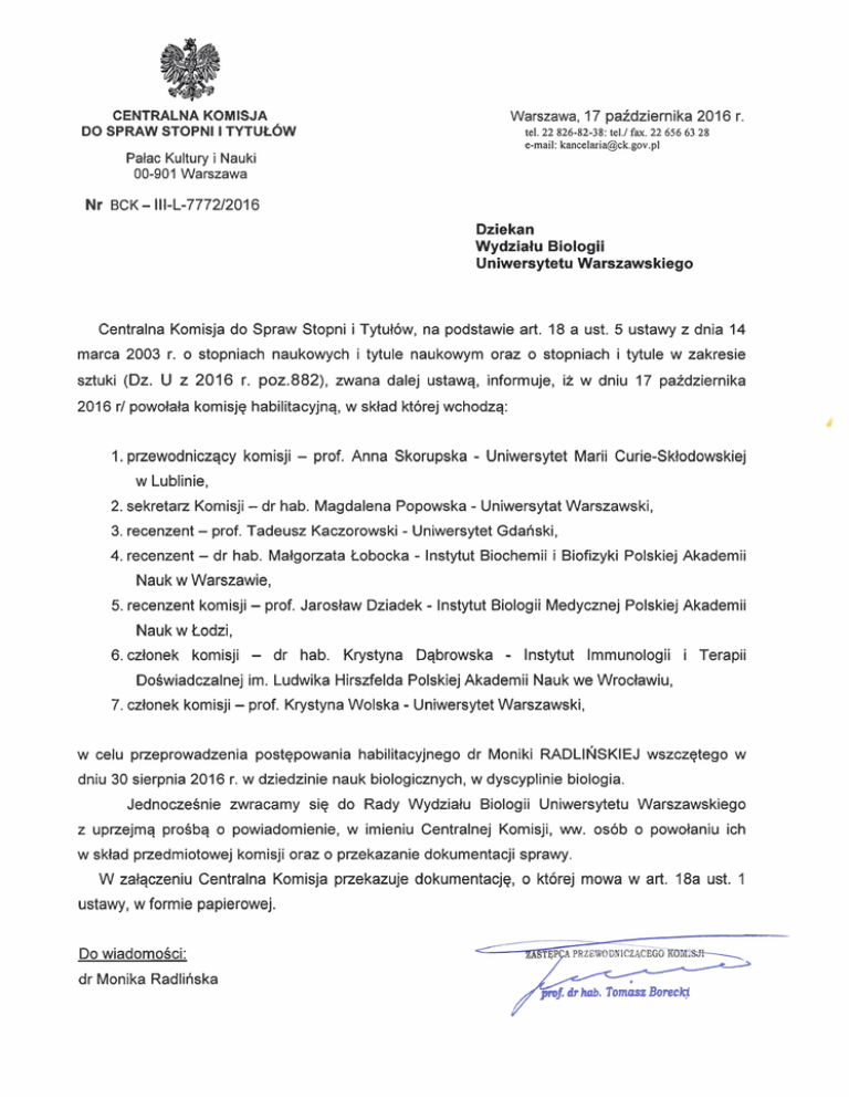 Warszawa, 17 pazdziernika 2016 r. CENTRALNA KOMISJA DO SPRAW STOPNI I T Y T U L ~ W tel. 22 826-82-38: tel.1 fax. 22 656 63 28 e-mail: [email protected] Pajac Kultury i Nauki 00-901 Warszawa Nr BCK- 111-L-777212016 Dziekan Wydzialu Biologii Uniwersytetu Warszawskiego Centralna Komisja do Spraw Stopni i Tytu~ow,na podstawie art. 18 a ust. 5 ustawy z dnia 14 marca 2003 r. o stopniach naukowych i tytule naukowym oraz o stopniach i tytule w zakresie sztuki (Dz. U z 2016 r. poz.882), zwana dalej ustawq, informuje, iz w dniu 17 pazdziernika 2016 r l powolala komisjq habilitacyjnq, w sklad ktorej wchodzq: I. przewodniczqcy komisji - prof. Anna Skorupska - Uniwersytet Marii Curie-Sklodowskiej w Lublinie, 2. sekretarz Komisji - dr hab. Magdalena Popowska - Uniwersytat Warszawski, 3. recenzent - prof. Tadeusz Kaczorowski - Uniwersytet Gdanski, 4. recenzent - dr hab. Malgorzata lobocka - lnstytut Biochemii i Biofizyki Polskiej Akademii Nauk w Warszawie, 5,recenzent komisji - prof. Jaroslaw Dziadek - lnstytut Biologii Medycznej Polskiej Akademii Nauk w lodzi, 6. czlonek komisji - dr hab. Krystyna Dqbrowska - lnstytut lmmunologii i Terapii Doswiadczalnej im. Ludwika Hirszfelda Polskiej Akademii Nauk we Wroclawiu, 7. czlonek komisji - prof. Krystyna Wolska - Uniwersytet Warszawski, w celu przeprowadzenia postqpowania habilitacyjnego dr Moniki RADLI~SKIEJwszczqtego w dniu 30 sierpnia 2016 r. w dziedzinie nauk biologicznych, w dyscyplinie biologia. Jednoczesnie zwracamy siq do Rady Wydzialu Biologii Uniwersytetu Warszawskiego z uprzejmq prosbq o powiadomienie, w imieniu Centralnej Komisji, ww. osob o powolaniu ich w sklad przedmiotowej komisji oraz o przekazanie dokumentacji sprawy. W zatqczeniu Centralna Komisja przekazuje dokumentacjq, o ktorej mowa w art. 18a ust. 1 ustawy, w formie papierowej. Do wiadomosci: dr Monika Radlinska prof,dr hab. Tomasz Borecw /@-- Centralna Komisja prosi wszystkich PT Czlonk6w Komisji wyszczeg6lnionych na stronie gl6wnej tego pisma o zapoznanie sig z nastgpujqcymi aktami prawnymi: - Ustawa z dnia 14 rnarca 2003 r. o stopniach... (Dz. U. z 20 14 r. poz. 1852 ze m.): zwlaszcza - art. 16, 18%2 1 - Rozporqdzenie Ministra Nauki i Szkolnictwa Wytszego z dnia 30 paidziernika 2015 r. w sprawie szczeg6iowego trybu i warunkdw przeprowadzania czynnoici w przewodach doktorskich, w postepowaniu habilitacyjnym oraz w postepowaniu o nadanie tytulu profesora - Rozporqdzenie Ministra Nauki i Szkolnictwa Wytszego z dnia 1 wrzeSnia 201 1 r. w sprawie kryteri6w oceny osiitgnieC osoby ubiegajqcej siq o nadanie stopnia doktora habilitowanego hffp://isa~.seim.eov.~VDetailsSe~let?id=WDU20111961165 oraz Komunikatem nr 1/2015 Centralnej Komisji dotyczqcym toku postqpowania habilitacyjnego Centralna Komisja ponihj podkreSla najwakniejsze dzialania stron postgpowania: Czlonkiem Komisji nie powinna by6 osoba posiadajqca wsp6lny dorobek publikacyjny oraz wsp6lne prace badawcze z Habilitantem, a takte osoba bqdqca recenzentem wydawniczym ocenianego dorobku Kandydata. JeSli wyznaczajqc sklad komisji naruszono ten obyczaj - prosimy o natychmiastowe zgloszenie do CK - Sekcja dokona zmiany skladu komisji. Habilitant mote by6 proszony o pilne dostarczenie do jednostki realizujqcej przew6d 7 komplet6w kserokopii dorobku publikacyjnego (wybranych, najlepszych 8 - 10 prac nie wchodqcych w sklad osiqgniqcia naukowego) do oceny ,,istotnej aktywnoSci naukowej". Material ten powinien by6 rozeslany przez jednostkq realizujqcq przew6d do wszystkich czionk6w komisji - razem z pozostaiq dokumentacjq wniosku w formie papierowej i elektronicznej. Komisja ma r6wniet prawo za@da6 (za poSrednictwem przewodnicqcego rady) udostqpnienia przez Habilitanta rozprawy doktorskiej i innych wyszczeg6lnionych prac z dorobku. Jeteli Habilitant nie przedstawi Qdanych prac w wyznaczonym terminie, przewodnicqcy lub z jego upowatnienia sekretarz komisji zawiadamia habilitanta o niemohobci rozpatrzenia wniosku do czasu spehienia Qdania. Umowy z recenzentami winny by6 zawarte przez dziekana 1 przewodnicqcego rady - przed przekazaniem materiai6w do zaopiniowania. PT Recenzenci powinni sporqdziC recenzje, w kt6rych zostanie wyratnie zaznaczona (1) ocena osiqgniqcia naukowego oraz (2) ocena istotnej aktywnoSci naukowej. Oceny dokonuje siq (art. 16 ust. 4 Ustawy) zgodnie z Rozporqdzeniem MNiSzW z dnia 1 wrzeSnia 201 1. TreS6 recenzji udostqpnia siq w jednej przesyice wszystkim czionkom Komisji dopier0 po wplyniqciu ostatniej z nich. Recenzje spomdzone niezgodnie z niniejszyrni przepisami nie mogq by6 przyjqte przez dziekana/przewodnicqcegorady. W celu sprawnego przebiegu postqpowania uprasza siq sekretarza komisji o nawiqzanie kontaktu (emailowego, telefonicznego) z przewodnicqcym, bezpobrednio po otrzymaniu tego pisma i podejmowanie bieQcych decyzji organizacyjnych w istotnych sprawach dotycqcych postqpowania habilitacyjnego. Posiedzenia komisji zwoiuje, za poSrednictwem sekretarza, przewodnicqcy komisji. Sekretarz komisji zapewnia obsiugq technicznq posiedzeh komisji. 0 organizacji i trybie pracy komisji decyduje jej Przewodnicqcy, kt6ry korzysta z pomocy sekretarza komisji. Przewodnicqcy komisji jest zobowiqzany do zapoznania wszystkich czlonk6w komisji z materiaiami dostarczonymi przez Habilitanta. Przewodnicqcy w porozumieniu z sekretarzem udostqpnia czlonkom komisji opinie sporqdzone przez recenzent6w. Przewodnicqcy komisji mote kontaktowat siq z czlonkami komisji drogq elektronicznq. 0 Tekst uchwaly, o kt6rej mowa w art. 18a ust. 8 i 11 Ustawy, podjqtej w skladzie wskazanym w 9 15 ust. 1 Rozporqdzenia, wraz z uzasadnieniem, recenzje i protokd posiedzenia komisji oraz wyniki glosowania przewodnicqcy komisji przekazuje, za poSrednictwem sekretarza, dziekanowi (przewodnicqcemu rady) - w celu podjqcia przez radq uchwaly o kt6rej mowa w art. 18a ust. 11 Ustawy, podejmowanej w trybie art. 20 ust. 1 i 2 Ustawy. Po zakonczeniu postqpowania o nadanie stopnia doktora habilitowanego dziekan (przewodnicqcy rady) przekazuje Centralnej Komisji, w ter