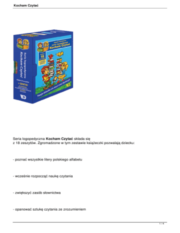 Kocham Czytać Seria logopedyczna Kocham Czytać składa się z 18 zeszytów. Zgromadzone w tym zestawie książeczki pozwalają dziecku: - poznać wszystkie litery polskiego alfabetu - wcześnie rozpocząć naukę czytania - zwiększyć zasób słownictwa - opanować sztukę czytania ze zrozumieniem 1/4 Kocham Czytać - uczyć się języków obcych - nauczyć się w przyszłości pisowni trudnych wyrazów Zaprezentowana w książeczkach metoda symultaniczno-sekwencyjna (sylabowa) pozwala nauczyć czytać już trzyletnie dziecko. Metoda ta sprawdzona jest w praktyce i oparta na najnowszych badaniach neuropsychologicznych. Jest najłatwiejszym sposobem opanowania i usprawnienia techniki czytania, ponieważ uwzględnia etapy rozwoju mowy i możliwości percepcyjne dziecka. Język proponowany w książeczkach jest prostym codziennym językiem, ilustrowanym obrazkami pełnymi kolory i ekspresji. Seria Kocham Czytać przeznaczona jest do wczesnej nauki czytania dzieci w wieku przedszkolnym, jest również doskonałą pomocą dla dzieci z wadami wymowy lub/i niezakończonym rozwojem mowy, oraz dla dzieci z dysleksją. Seria ta jest także nieocenioną pomocą w pracy każdego logopedy z dziećmi z dyslalią, alalią i afazją. Sprawdza się również w pracy z dziećmi nadpobudliwymi, niesłyszącymi oraz o obniżonych zdolnościach intelektualnych. 2/4 Kocham Czytać Dzięki serii Kocham czytać mogą Państwo już od najmłodszych lat wpływać na prawidłowy rozwój wszystkich funkcji psychicznych dziecka. Wspomagać spostrzeganie, myślenie, pamięć oraz rozumowanie przyczynowo-skutkowe. Kontynuacją 18 zeszytów jest seria książeczek o podróżach Jagody i Janka. Zeszyty od 19-30 o różnym stopniu trudności pomagają dzieciom doskonalić trudną umiejętność czytania ze zrozumienie. Dzięki lekturze poznają nazwy państw, miast, uczą się zadawać pytania, rozmawiać. Zdobyta w ten sposób wiedza to najefektywniejszy sposób 3/4 Kocham Czytać utrwalenia zdobytych informacji. Umiejętność czytania w języku ojczysty pozwala dzieciom zwiększać zasób słownictwa, wyszukiwać wiadomości, korzystać z Internetu. 4/4