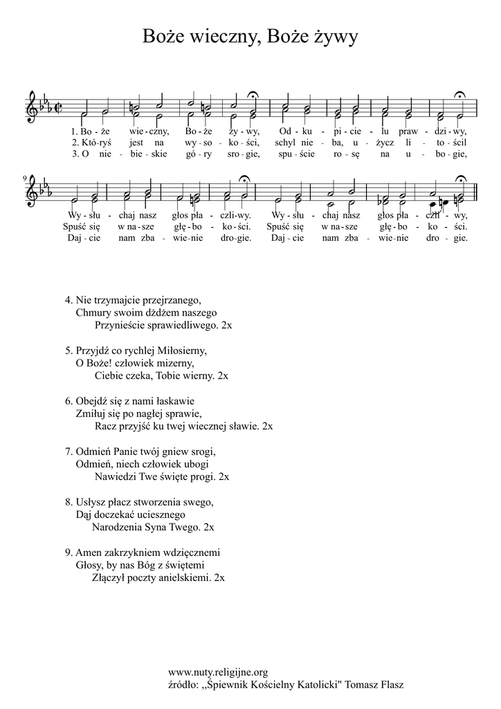 Boże wieczny, Boże żywy 1. Bo że 2. Któ ryś 3. O nie 9 Wy słu Spuść się Daj cie wie czny, jest na bie skie chaj nasz w na sze nam zba Bo że wy so gó ry głos pła głę bo wie nie ży wy, ko ści, sro gie, czli wy. ko ści. dro gie. Od ku schyl nie spu ście Wy słu Spuść się Daj cie pi cie ba, u ro sę chaj nasz w na sze nam zba lu praw życz li na u głos pła głę bo wie nie 4. Nie trzymajcie przejrzanego, Chmury swoim dżdżem naszego Przynieście sprawiedliwego. 2x 5. Przyjdź co rychlej Miłosierny, O Boże! człowiek mizerny, Ciebie czeka, Tobie wierny. 2x 6. Obejdź się z nami łaskawie Zmiłuj się po nagłej sprawie, Racz przyjść ku twej wiecznej sławie. 2x 7. Odmień Panie twój gniew srogi, Odmień, niech człowiek ubogi Nawiedzi Twe święte progi. 2x 8. Usłysz płacz stworzenia swego, Dąj doczekać uciesznego Narodzenia Syna Twego. 2x 9. Amen zakrzykniem wdzięcznemi Głosy, by nas Bóg z świętemi Złączył poczty anielskiemi. 2x www.nuty.religijne.org źródło: ,,Śpiewnik Kościelny Katolicki" Tomasz Flasz dzi wy, to ścil bo gie, czli ko dro wy, ści. gie.