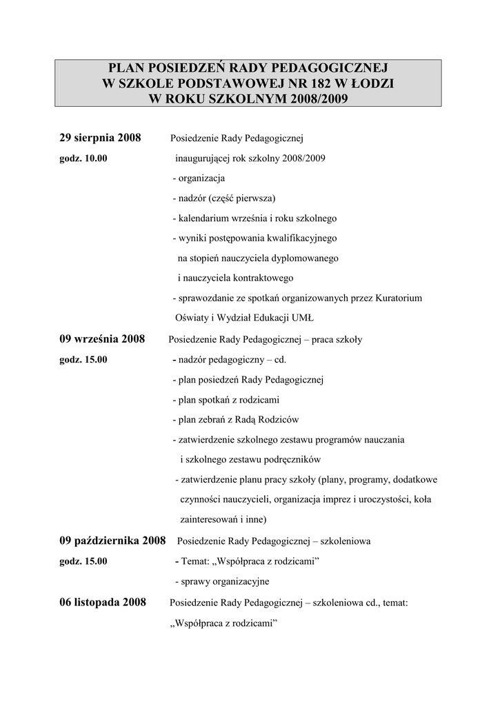 PLAN POSIEDZEŃ RADY PEDAGOGICZNEJ W SZKOLE PODSTAWOWEJ NR 182 W ŁODZI W ROKU SZKOLNYM 2008/2009 29 sierpnia 2008 godz. 10.00 Posiedzenie Rady Pedagogicznej inaugurującej rok szkolny 2008/2009 - organizacja - nadzór (część pierwsza) - kalendarium września i roku szkolnego - wyniki postępowania kwalifikacyjnego na stopień nauczyciela dyplomowanego i nauczyciela kontraktowego - sprawozdanie ze spotkań organizowanych przez Kuratorium Oświaty i Wydział Edukacji UMŁ 09 września 2008 godz. 15.00 Posiedzenie Rady Pedagogicznej – praca szkoły - nadzór pedagogiczny – cd. - plan posiedzeń Rady Pedagogicznej - plan spotkań z rodzicami - plan zebrań z Radą Rodziców - zatwierdzenie szkolnego zestawu programów nauczania i szkolnego zestawu podręczników - zatwierdzenie planu pracy szkoły (plany, programy, dodatkowe czynności nauczycieli, organizacja imprez i uroczystości, koła zainteresowań i inne) 09 października 2008 Posiedzenie Rady Pedagogicznej – szkoleniowa godz. 15.00 - Temat: „Współpraca z rodzicami” - sprawy organizacyjne 06 listopada 2008 Posiedzenie Rady Pedagogicznej – szkoleniowa cd., temat: „Współpraca z rodzicami” godz. 14.00 - sprawy organizacyjne 11 grudnia 2008 Posiedzenie Rady Pedagogicznej – śródsemestralna godz. 15.00 - ocena osiągnięć edukacyjnych uczniów (analiza groŜących ocen niedostatecznych oraz groŜących ocen nagannych z zachowania) - informacja dla rodziców o przewidywanych ocenach klasyfikacyjnych - Święta BoŜego Narodzenia 20 stycznia 2009 godz. 15.00 Posiedzenie Rady Pedagogicznej – klasyfikacja po I semestrze - realizacja planów nauczania i planów pracy wychowawców - przedstawienie ocen 22 stycznia 2009 godz. 13.00 Posiedzenie Rady Pedagogicznej – plenarna po I semestrze - zatwierdzenie ocen - przyjęcie sprawozdania z działalności wychowawczej oraz profilaktycznej - sprawozdanie z nadzoru pedagogicznego - ocena działań na rzecz wykonania planu pracy szkoły 05 marca 2009 Posiedzenie Rady Pedagogicznej – organizacyjna godz. 15.00 - przygotowania do sprawdzianu kompetencji po klasie VI - sprawy organizacyjne 07 kwietnia 2009 Posiedzenie Rady Pedagogicznej – śródsemestralna godz. 15.00 - ocena osiągnięć edukacyjnych uczniów (analiza groŜących ocen niedostatecznych oraz groŜących ocen nagannych z zachowania) - informacja dla rodziców o przewidywanych ocenach klasyfikacyjnych 07 maja 2009 godz. 15.00 Posiedzenie Rady Pedagogicznej – organizacyjna - przedstawienie nauczycielom harmonogramu prac związanych z: - zakończeniem roku szkolnego - nowym naborem - aktualność programów nauczania 04 czerwca 2009 Posiedzenie Rady Pedagogicznej – klasyfikacyjna końcoworoczna godz. 13.00 - przedstawienie ocen (klasyfikacja i promowanie uczniów) - realizacja programów nauczania - nagrody i wyróŜnienia - organizacja zakończenia roku szkolnego - bezpieczeństwo uczniów podczas wakacji 09 czerwca 2009 Posiedzenie Rady Pedagogicznej – plenarna końcoworoczna godz. 15.00 Podsumowanie pracy szkoły w roku szkolnym 2008/2009 - sprawozdanie z prowadzonego nadzoru pedagogicznego - ocena realizacji pracy szkoły - sprawozdanie z działalności wychowawczej i profilaktycznej szkoły - wnioski do planu pracy szkoły na rok szkolny 2008/2009 MoŜliwe niewielkie zmiany z powodu terminów rekolekcji.