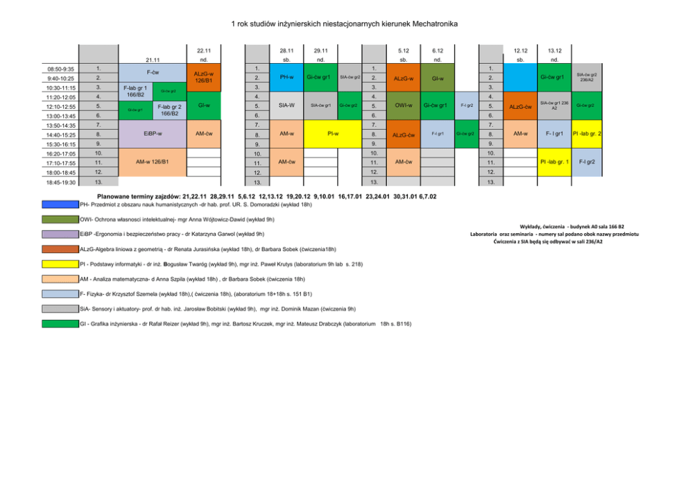 1 rok studiów inżynierskich niestacjonarnych kierunek Mechatronika 21.11 22.11 28.11 29.11 5.12 6.12 12.12 13.12 nd. sb. nd. sb. nd. sb. nd. 08:50-9:35 1. 9:40-10:25 2. 10:30-11:15 3. 11:20-12:05 4. 12:10-12:55 5. 13:00-13:45 6. 13:50-14:35 7. 14:40-15:25 8. 15:30-16:15 9. 16:20-17:05 10. 17:10-17:55 11. 18:00-18:45 12. 12. 12. 12. 18:45-19:30 13. 13. 13. 13. F-ćw F-lab gr 1 166/B2 Gi-ćw gr1 ALzG-w 126/B1 Gi-ćw gr2 F-lab gr 2 166/B2 GI-w 1. 2. 1. PH-w Gi-ćw gr1 SIA-ćw gr2 3. 3. 4. 4. 5. SIA-W SIA-ćw gr1 Gi-ćw gr2 6. AM-ćw 8. PI-w 11. ALzG-ćw SIA-ćw gr1 236 A2 Gi-ćw gr2 AM-w F- l gr1 PI -lab gr. 2 PI -lab gr. 1 F-l gr2 4. OWI-w Gi-ćw gr1 F-l gr2 5. 6. 7. ALzG-ćw F-l gr1 Gi-ćw gr2 8. 9. 10. AM-ćw SIA-ćw gr2 236/A2 3. 9. 10. 11. 8. Gi-ćw gr1 2. GI-w 7. AM-w 9. AM-w 126/B1 5. ALzG-w 6. 7. EiBP-w 2. 1. 10. AM-ćw 11. Planowane terminy zajzdów: 21,22.11 28,29.11 5,6.12 12,13.12 19,20.12 9,10.01 16,17.01 23,24.01 30,31.01 6,7.02 PH- Przedmiot z obszaru nauk humanistycznych -dr hab. prof. UR. S. Domoradzki (wykład 18h) OWI- Ochrona własnosci intelektualnej- mgr Anna Wójtowicz-Dawid (wykład 9h) EiBP -Ergonomia i bezpieczeństwo pracy - dr Katarzyna Garwol (wykład 9h) ALzG-Algebra liniowa z geometrią - dr Renata Jurasińska (wykład 18h), dr Barbara Sobek (ćwiczenia18h) PI - Podstawy informatyki - dr inż. Bogusław Twaróg (wykład 9h), mgr inż. Paweł Krutys (laboratorium 9h lab s. 218) AM - Analiza matematyczna- d Anna Szpila (wykład 18h) , dr Barbara Sobek (ćwiczenia 18h) F- Fizyka- dr Krzysztof Szemela (wykład 18h),( ćwiczenia 18h), (aboratorium 18+18h s. 151 B1) SiA- Sensory i aktuatory- prof. dr hab. inż. Jarosław Bobitski (wykład 9h), mgr inż. Dominik Mazan (ćwiczenia 9h) GI - Grafika inżynierska - dr Rafał Reizer (wykład 9h), mgr inż. Bartosz Kruczek, mgr inż. Mateusz Drabczyk (laboratorium 18h s. B116) Wykłady, ćwiczenia - budynek A0 sala 166 B2 Laboratoria oraz seminaria - numery sal podano obok nazwy przedmiotu Ćwiczenia z SIA będą się odbywać w sali 236/A2