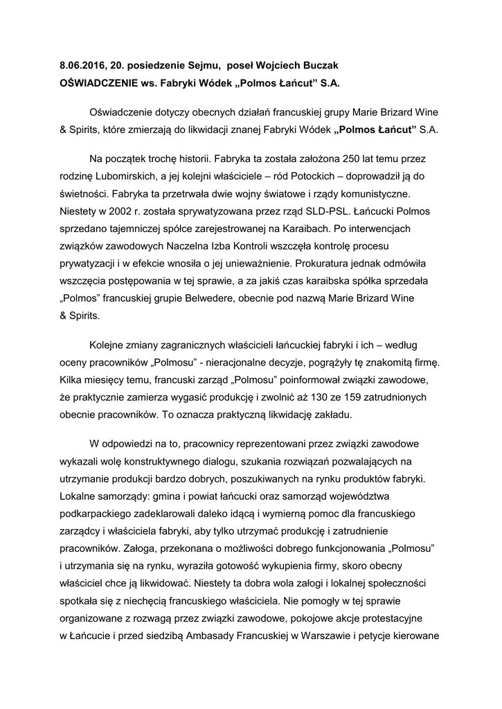 8.06.2016, 20. posiedzenie Sejmu, poseł Wojciech Buczak OŚWIADCZENIE ws. Fabryki Wódek „Polmos Łańcut” S.A. Oświadczenie dotyczy obecnych działań francuskiej grupy Marie Brizard Wine & Spirits, które zmierzają do likwidacji znanej Fabryki Wódek „Polmos Łańcut” S.A. Na początek trochę historii. Fabryka ta została założona 250 lat temu przez rodzinę Lubomirskich, a jej kolejni właściciele – ród Potockich – doprowadził ją do świetności. Fabryka ta przetrwała dwie wojny światowe i rządy komunistyczne. Niestety w 2002 r. została sprywatyzowana przez rząd SLD-PSL. Łańcucki Polmos sprzedano tajemniczej spółce zarejestrowanej na Karaibach. Po interwencjach związków zawodowych Naczelna Izba Kontroli wszczęła kontrolę procesu prywatyzacji i w efekcie wnosiła o jej unieważnienie. Prokuratura jednak odmówiła wszczęcia postępowania w tej sprawie, a za jakiś czas karaibska spółka sprzedała „Polmos” francuskiej grupie Belwedere, obecnie pod nazwą Marie Brizard Wine & Spirits. Kolejne zmiany zagranicznych właścicieli łańcuckiej fabryki i ich – według oceny pracowników „Polmosu” - nieracjonalne decyzje, pogrążyły tę znakomitą firmę. Kilka miesięcy temu, francuski zarząd „Polmosu” poinformował związki zawodowe, że praktycznie zamierza wygasić produkcję i zwolnić aż 130 ze 159 zatrudnionych obecnie pracowników. To oznacza praktyczną likwidację zakładu. W odpowiedzi na to, pracownicy reprezentowani przez związki zawodowe wykazali wolę konstruktywnego dialogu, szukania rozwiązań pozwalających na utrzymanie produkcji bardzo dobrych, poszukiwanych na rynku produktów fabryki. Lokalne samorządy: gmina i powiat łańcucki oraz samorząd województwa podkarpackiego zadeklarowali daleko idącą i wymierną pomoc dla francuskiego zarządcy i właściciela fabryki, aby tylko utrzymać produkcję i zatrudnienie pracowników. Załoga, przekonana o możliwości dobrego funkcjonowania „Polmosu” i utrzymania się na rynku, wyraziła gotowość wykupienia firmy, skoro obecny właściciel chce ją likwidować. Niestety ta dobra wola załogi i lokalnej społeczności spotkała się z niechęcią francuskiego właściciela. Nie pomogły w tej sprawie organizowane z rozwagą przez związki zawodowe, pokojowe akcje protestacyjne w Łańcucie i przed siedzibą Ambasady Francuskiej w Warszawie i petycje kierowane do Ambasadora Republiki Francuskiej w Warszawie. Nie zmieniły też negatywnego nastawienia francuskiego właściciela do wszelkich konstruktywnych rozwiązań rozmowy przeprowadzone z nim 7 czerwca br. w siedzibie Sejmu RP z prezydium Polsko-Francuskiej Grupy Parlamentarnej. Z przeprowadzonych rozmów widać wyraźnie, że celem MBW&S jest wyeliminowanie Fabryki Wódek „Polmos Łańcut” S.A. z rynku. Przypadek łańcuckiego „Polmosu” nie jest pierwszym w Polsce przykładem nie wywiązywania się francuskich inwestorów z deklaracji składanych przed wejściem na polski rynek. Przed kilkoma laty polski rząd zdecydował się na zakup francuskich śmigłowców dla Lotniczego Pogotowia Ratunkowego, ponieważ padały deklaracje francuskiego oferenta o utworzeniu w związku z tym, nowych miejsc pracy w Polsce. Żadne miejsca pracy, w związku z tym kontraktem nie zostały utworzone. Obecnie trwają negocjacje polskiego rządu z francuskim partnerem na temat offsetu przy ewentualnych dostawach francuskich śmigłowców dla polskiej armii. Z powodu dotychczasowych złych doświadczeń, jeżeli chodzi o wiarygodność francuskich inwestorów, jak np. w łańcuckim „Polmosie”, apeluję do przedstawicieli polskiego rządu, którzy prowadzą negocjacje o podchodzenie z wielką rezerwą do deklaracji składach przez francuskich oferentów. Do wszystkich ludzi dobrej woli apeluję o solidarne wsparcie dla załogi Fabryki Wódek "Polmos Łańcut" S.A., która jest zdeterminowana bronić swoich miejsc pracy przed nieuzasadnioną likwidacją. Wojciech Buczak Poseł na Sejm RP Klub Prawo i Sprawiedliwość
