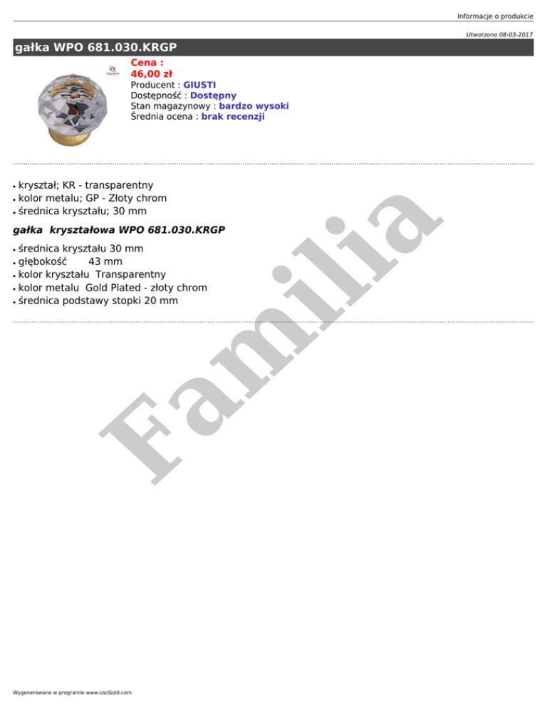 Informacje o produkcie Utworzono 08-03-2017 gałka WPO 681.030.KRGP Cena : 46,00 zł Producent : GIUSTI Dostępność : Dostępny Stan magazynowy : bardzo wysoki Średnia ocena : brak recenzji ● ● kryształ; KR - transparentny kolor metalu; GP - Złoty chrom średnica kryształu; 30 mm ● ● ● ● Fa m ● średnica kryształu 30 mm głębokość 43 mm kolor kryształu Transparentny kolor metalu Gold Plated - złoty chrom średnica podstawy stopki 20 mm ili gałka kryształowa WPO 681.030.KRGP Wygenerowano w programie www.oscGold.com a ●