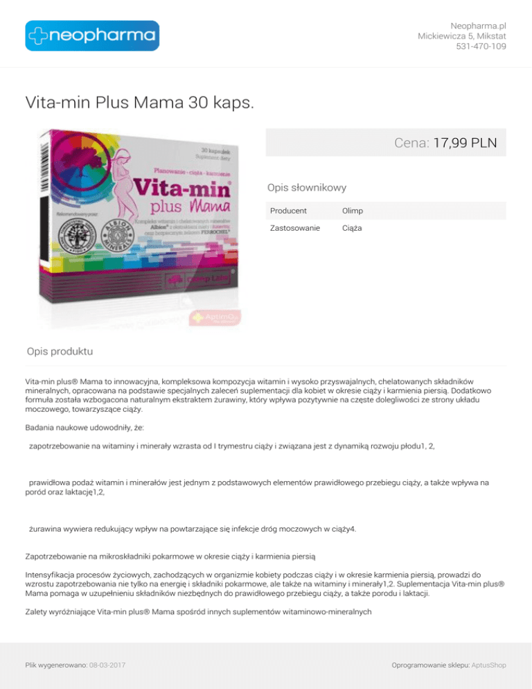Neopharma.pl Mickiewicza 5, Mikstat 531-470-109 Vita-min Plus Mama 30 kaps. Cena: 17,99 PLN Opis słownikowy Producent Olimp Zastosowanie Ciąża Opis produktu Vita-min plus® Mama to innowacyjna, kompleksowa kompozycja witamin i wysoko przyswajalnych, chelatowanych składników mineralnych, opracowana na podstawie specjalnych zaleceń suplementacji dla kobiet w okresie ciąży i karmienia piersią. Dodatkowo formuła została wzbogacona naturalnym ekstraktem żurawiny, który wpływa pozytywnie na częste dolegliwości ze strony układu moczowego, towarzyszące ciąży. Badania naukowe udowodniły, że: zapotrzebowanie na witaminy i minerały wzrasta od I trymestru ciąży i związana jest z dynamiką rozwoju płodu1, 2, prawidłowa podaż witamin i minerałów jest jednym z podstawowych elementów prawidłowego przebiegu ciąży, a także wpływa na poród oraz laktację1,2, żurawina wywiera redukujący wpływ na powtarzające się infekcje dróg moczowych w ciąży4. Zapotrzebowanie na mikroskładniki pokarmowe w okresie ciąży i karmienia piersią Intensyfikacja procesów życiowych, zachodzących w organizmie kobiety podczas ciąży i w okresie karmienia piersią, prowadzi do wzrostu zapotrzebowania nie tylko na energię i składniki pokarmowe, ale także na witaminy i minerały1,2. Suplementacja Vita-min plus® Mama pomaga w uzupełnieniu składników niezbędnych do prawidłowego przebiegu ciąży, a także porodu i laktacji. Zalety wyróżniające Vita-min plus® Mama spośród innych suplementów witaminowo-mineralnych Plik wygenerowano: 08-03-2017 Oprogramowanie sklepu: AptusShop Neopharma.pl Mickiewicza 5, Mikstat 531-470-109 Składniki mineralne zawarte w Vita-min plus® Mama występują w postaci wysoko przyswajalnych chelatów aminokwasowych, które produkowane są przez lidera rynku farmaceutycznych surowców mineralnych – amerykańską firmę ALBION®. W tej formie biopierwiastki dobrze wchłaniają się z przewodu pokarmowego, pozostają całkowicie bezpieczne w dawkowaniu, nie podrażniają żołądka, a ewentualny ich nadmiar w postaci chelatu łatwo opuszcza organizm, ponadto nie utrudniają wchłaniania innych minerałów5. Warto podkreślić, że prawidłowa struktura chelatów aminokwasowych Albion® została naukowo potwierdzona opatentowaną metodą FT-IR TRAACS®6. Dowiedz się więcej o TRAACS. Vita-min plus® Mama to także jedyny na rynku preparat witaminowo-mineralny dla kobiet w ciąży, zawierający Ferrochel® - żelazo w formie chelatu aminokwasowego. Stosowanie preparatów z żelazem może wywoływać efekty uboczne, takie jak biegunki, zaparcia czy bóle brzucha. Jednakże Ferrochel® to jedna z najłagodniejszych form żelaza, cechująca się znaczną redukcją występowania działań niepożądanych ze strony układu pokarmowego, co zostało potwierdzone w badaniach naukowych7 . Dzięki temu żelazo Ferrochel® jest zdecydowanie lepiej tolerowane w porównaniu z tradycyjnie stosowanymi preparatami żelaza, co jest szczególnie ważne w okresie ciąży. Dodatkowe korzyści ze stosowania Vita-min plus® Mama Licznym zmianom zachodzącym w organizmie kobiety podczas ciąży często towarzyszy występowanie dyskomfortu w postaci zaburzeń funkcjonowania układu moczowego, skłonność do infekcji dróg moczowych. Efektywna w niwelowaniu tych nieprzyjemnych dolegliwości jest żurawina wielkoowocowa zawarta w Vita-min plus® Mama. Żurawina wykazuje działanie wspomagające pracę układu moczowego oraz wzmacniające naturalną odporność przed infekcjami dróg moczowych. Przeznaczenie: preparat przeznaczony dla kobiet w ciąży, karmiących piersią oraz planujących potomstwo. Przeciwwskazania: nadwrażliwość na którykolwiek ze składników preparatu. Uwaga: jednoczesne stosowanie z innymi preparatami witaminowo-mineralnymi należy skonsultować z lekarzem. Składniki: składniki mineralne - diglicynian wapnia (chelat aminokwasowy wapnia Albion®), diglicynian magnezu (chelat aminokwasowy magnezu Albion®), bisglicynian żelaza (chelat aminokwasowy żelaza Albion® Ferrochel®), diglicynian cynku (chelat aminokwasowy cynku Albion®), diglicynian miedzi (chelat aminokwasowy miedzi Albion®), bisglicynian manganu (chelat aminokwasowy manganu Albion®), jodek potasu; witaminy – kwas L-askorbinowy - wit. C, octan D-alfa tokoferylu – wit. E, amid kwasu nikotynowego – niacyna, beta karoten – wit. A, D-pantotenian wapnia - kwas pantotenowy, D-biotyna, cyjanokobalamina – wit. B12, cholekalcyferol – wit. D, kwas pteroilomonoglutaminowy – foliany, chlorowodorek pirydoksyny – wit. B6, , ryboflawina – wit. B2, monoazotan tiaminy – wit. B1; ekstrakt żurawiny wielkoowocowej (Vaccinium macrocarpon), stearynian magnezu – substancja przeciwzbrylająca, celuloza mikrokrystaliczna - substancja wypełniająca, kapsułka (żelatyna – składnik otoczki, barwnik: E171). Dawkowanie Zalecana porcja do spożycia w ciągu dnia: 1 kapsułka dziennie, po posiłku głównym, popijając dużą ilością wody Plik wygenerowano: 08-03-2017 Powered by TCPDF (www.tcpdf.org) Oprogramowanie sklepu: AptusShop