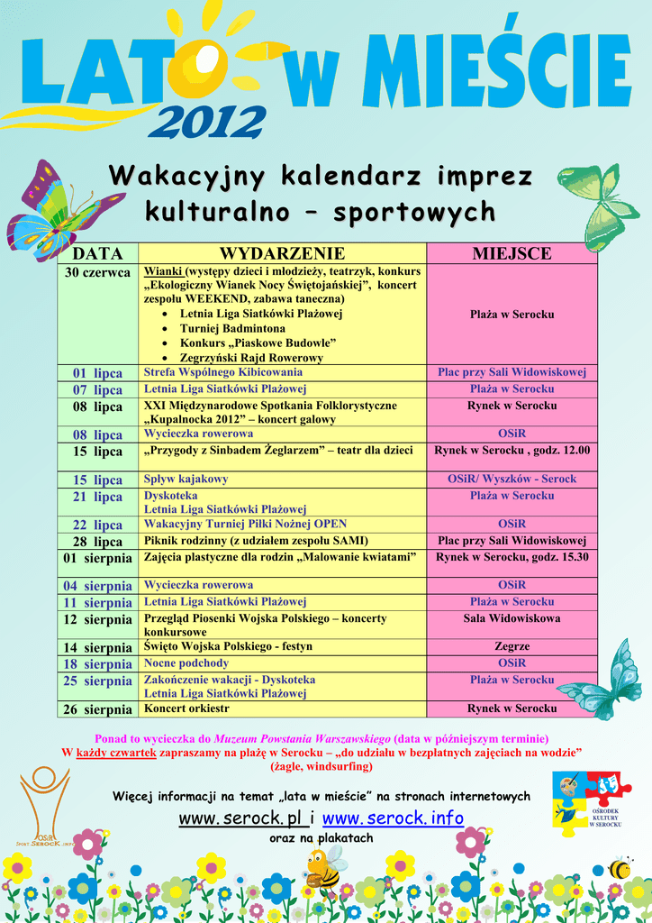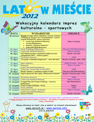 LAT , w MIESCIE Wakacyjny kalendarz imprez kulturalno – sportowych DATA WYDARZENIE MIEJSCE 30 czerwca Wianki (wystêpy dzieci i m³odzie¿y, teatrzyk, konkurs 01 lipca 07 lipca 08 lipca 08 lipca 15 lipca „Ekologiczny Wianek Nocy Œwiêtojañskiej”, koncert zespo³u WEEKEND, zabawa taneczna) · Letnia Liga Siatkówki Pla¿owej · Turniej Badmintona · Konkurs „Piaskowe Budowle” · Zegrzyñski Rajd Rowerowy Strefa Wspólnego Kibicowania Letnia Liga Siatkówki Pla¿owej XXI Miêdzynarodowe Spotkania Folklorystyczne „Kupalnocka 2012” – koncert galowy Wycieczka rowerowa „Przygody z Sinbadem ¯eglarzem” – teatr dla dzieci Sp³yw kajakowy Dyskoteka Letnia Liga Siatkówki Pla¿owej 22 lipca Wakacyjny Turniej Pi³ki No¿nej OPEN 28 lipca Piknik rodzinny (z udzia³em zespo³u SAMI) 01 sierpnia Zajêcia plastyczne dla rodzin „Malowanie kwiatami” 15 lipca 21 lipca 04 sierpnia Wycieczka rowerowa 11 sierpnia Letnia Liga Siatkówki Pla¿owej 12 sierpnia Przegl¹d Piosenki Wojska Polskiego – koncerty 14 sierpnia 18 sierpnia 25 sierpnia 26 sierpnia Pla¿a w Serocku Plac przy Sali Widowiskowej Pla¿a w Serocku Rynek w Serocku OSiR Rynek w Serocku , godz. 12.00 OSiR/ Wyszków - Serock Pla¿a w Serocku OSiR Plac przy Sali Widowiskowej Rynek w Serocku, godz. 15.30 OSiR Pla¿a w Serocku Sala Widowiskowa konkursowe Œwiêto Wojska Polskiego - festyn Nocne podchody Zakoñczenie wakacji - Dyskoteka Letnia Liga Siatkówki Pla¿owej Koncert orkiestr Zegrze OSiR Pla¿a w Serocku Rynek w Serocku Ponad to wycieczka do Muzeum Powstania Warszawskiego (data w póŸniejszym terminie) W ka¿dy czwartek zapraszamy na pla¿ê w Serocku – „do udzia³u w bezp³atnych zajêciach na wodzie” (¿agle, windsurfing) Wiêcej informacji na temat „lata w mieœcie” na stronach internetowych www. serock. pl i www. serock. info oraz na plakatach