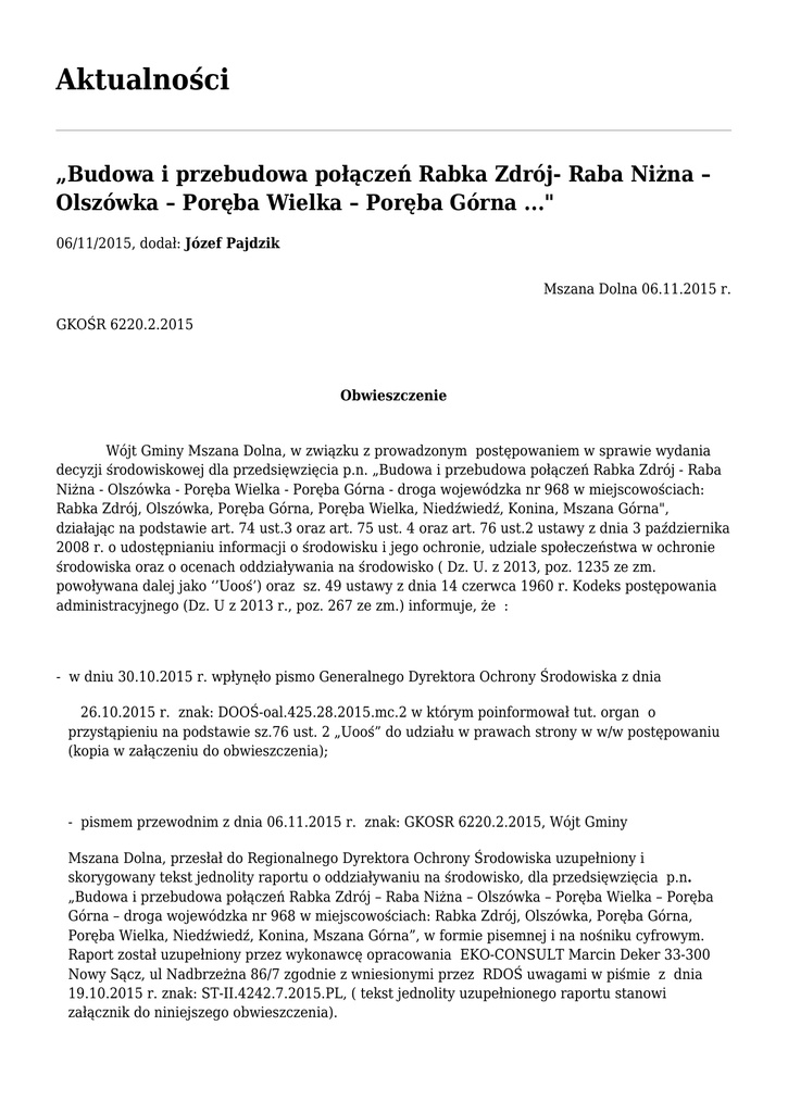 Aktualności „Budowa i przebudowa połączeń Rabka Zdrój- Raba Niżna – Olszówka – Poręba Wielka – Poręba Górna ..." 06/11/2015, dodał: Józef Pajdzik Mszana Dolna 06.11.2015 r. GKOŚR 6220.2.2015 Obwieszczenie Wójt Gminy Mszana Dolna, w związku z prowadzonym postępowaniem w sprawie wydania decyzji środowiskowej dla przedsięwzięcia p.n. „Budowa i przebudowa połączeń Rabka Zdrój - Raba Niżna - Olszówka - Poręba Wielka - Poręba Górna - droga wojewódzka nr 968 w miejscowościach: Rabka Zdrój, Olszówka, Poręba Górna, Poręba Wielka, Niedźwiedź, Konina, Mszana Górna", działając na podstawie art. 74 ust.3 oraz art. 75 ust. 4 oraz art. 76 ust.2 ustawy z dnia 3 października 2008 r. o udostępnianiu informacji o środowisku i jego ochronie, udziale społeczeństwa w ochronie środowiska oraz o ocenach oddziaływania na środowisko ( Dz. U. z 2013, poz. 1235 ze zm. powoływana dalej jako ‘’Uooś’) oraz sz. 49 ustawy z dnia 14 czerwca 1960 r. Kodeks postępowania administracyjnego (Dz. U z 2013 r., poz. 267 ze zm.) informuje, że : - w dniu 30.10.2015 r. wpłynęło pismo Generalnego Dyrektora Ochrony Środowiska z dnia 26.10.2015 r. znak: DOOŚ-oal.425.28.2015.mc.2 w którym poinformował tut. organ o przystąpieniu na podstawie sz.76 ust. 2 „Uooś” do udziału w prawach strony w w/w postępowaniu (kopia w załączeniu do obwieszczenia); - pismem przewodnim z dnia 06.11.2015 r. znak: GKOSR 6220.2.2015, Wójt Gminy Mszana Dolna, przesłał do Regionalnego Dyrektora Ochrony Środowiska uzupełniony i skorygowany tekst jednolity raportu o oddziaływaniu na środowisko, dla przedsięwzięcia p.n. „Budowa i przebudowa połączeń Rabka Zdrój – Raba Niżna – Olszówka – Poręba Wielka – Poręba Górna – droga wojewódzka nr 968 w miejscowościach: Rabka Zdrój, Olszówka, Poręba Górna, Poręba Wielka, Niedźwiedź, Konina, Mszana Górna”, w formie pisemnej i na nośniku cyfrowym. Raport został uzupełniony przez wykonawcę opracowania EKO-CONSULT Marcin Deker 33-300 Nowy Sącz, ul Nadbrzeżna 86/7 zgodnie z wniesionymi przez RDOŚ uwagami w piśmie z dnia 19.10.2015 r. znak: ST-II.4242.7.2015.PL, ( tekst jednolity uzupełnionego raportu stanowi załącznik do niniejszego obwieszczenia). Ponieważ w powyższej sprawie liczba stron przekracza 20, zgodnie z sz. 49 k.p.a. w związku z sz. 74 ust. 3 ustawy z dnia 3 października 2008 r. o udostępnianiu informacji o środowisku jego ochronie, udziale społeczeństwa w ochronie środowiska oraz ocenach oddziaływania na środowisko ( Dz. U. z 2013, poz. 1235 ze zm.) niniejsze zawiadomienie zostaje podane stronom do wiadomości poprzez zamieszczenie w Biuletynie Informacji Publicznej oraz na tablicach ogłoszeń Urzędów Gmin: Mszana Dolna – www. mszana.pl, e-urząd, ochrona środowiska, Niedźwiedź oraz Miasta Rabka Zdrój. Wójt Gminy Mszana Dolna /-/ Bolesław Żaba Załącznik 1 - pobierz Załącznik 2 - pobierz Załącznik 3 - pobierz Obwieszczenie zamieszczono w dniu: 06.11.2015 r.