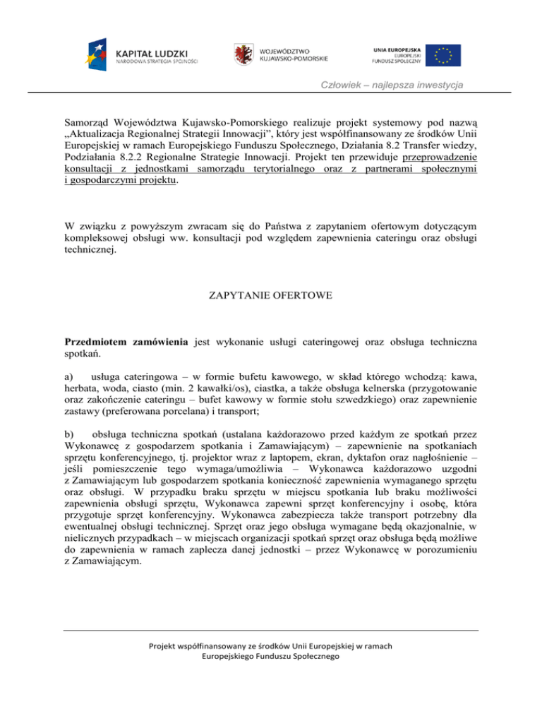 Człowiek – najlepsza inwestycja Samorząd Województwa Kujawsko-Pomorskiego realizuje projekt systemowy pod nazwą „Aktualizacja Regionalnej Strategii Innowacji”, który jest współfinansowany ze środków Unii Europejskiej w ramach Europejskiego Funduszu Społecznego, Działania 8.2 Transfer wiedzy, Podziałania 8.2.2 Regionalne Strategie Innowacji. Projekt ten przewiduje przeprowadzenie konsultacji z jednostkami samorządu terytorialnego oraz z partnerami społecznymi i gospodarczymi projektu. W związku z powyższym zwracam się do Państwa z zapytaniem ofertowym dotyczącym kompleksowej obsługi ww. konsultacji pod względem zapewnienia cateringu oraz obsługi technicznej. ZAPYTANIE OFERTOWE Przedmiotem zamówienia jest wykonanie usługi cateringowej oraz obsługa techniczna spotkań. a) usługa cateringowa – w formie bufetu kawowego, w skład którego wchodzą: kawa, herbata, woda, ciasto (min. 2 kawałki/os), ciastka, a także obsługa kelnerska (przygotowanie oraz zakończenie cateringu – bufet kawowy w formie stołu szwedzkiego) oraz zapewnienie zastawy (preferowana porcelana) i transport; b) obsługa techniczna spotkań (ustalana każdorazowo przed każdym ze spotkań przez Wykonawcę z gospodarzem spotkania i Zamawiającym) – zapewnienie na spotkaniach sprzętu konferencyjnego, tj. projektor wraz z laptopem, ekran, dyktafon oraz nagłośnienie – jeśli pomieszczenie tego wymaga/umożliwia – Wykonawca każdorazowo uzgodni z Zamawiającym lub gospodarzem spotkania konieczność zapewnienia wymaganego sprzętu oraz obsługi. W przypadku braku sprzętu w miejscu spotkania lub braku możliwości zapewnienia obsługi sprzętu, Wykonawca zapewni sprzęt konferencyjny i osobę, która przygotuje sprzęt konferencyjny. Wykonawca zabezpiecza także transport potrzebny dla ewentualnej obsługi technicznej. Sprzęt oraz jego obsługa wymagane będą okazjonalnie, w nielicznych przypadkach – w miejscach organizacji spotkań sprzęt oraz obsługa będą możliwe do zapewnienia w ramach zaplecza danej jednostki – przez Wykonawcę w porozumieniu z Zamawiającym. Projekt współfinansowany ze środków Unii Europejskiej w ramach Europejskiego Funduszu Społecznego Człowiek – najlepsza inwestycja Charakter konsultacji: konsultacje będą się odbywać w powiatach Województwa Kujawsko-Pomorskiego, w salach urzędowych, dla nie więcej niż 50 osób (ustalane każdorazowo z gospodarzem spotkania i Zamawiającym), każde spotkanie potrwa max. 3 godziny(przez cały czas spotkania stół, na którym będzie udostępniona kawa/herbata oraz słodkie przekąski – powinien być do dyspozycji gości). W ciągu jednego dnia mogą być organizowane dwa spotkania w dwóch różnych miastach(niejednocześnie – min. 1 godzina przerwy między spotkaniami, na dojazd). Termin konsultacji: pierwsze spotkanie zaplanowane jest na 30 października 2012 r., ostatnie na 6 grudnia 2012 r. Liczba konsultacji: planowanych jest nie więcej niż 20 spotkań. W przypadku gdy zainteresują się Państwo niniejszym zapytaniem, proszę o przesłanie oferty do dnia 24.10.2012 r. do godz. 12:00 , w formie elektronicznej na adres [email protected]. W przypadku jakichkolwiek pytań proszę zasięgać informacji pod numerami telefonów: (0 56) 656 10 22 oraz 660 75 49 17 Lub pod podanym wyżej adresem e-mail. Sprawę prowadzi: Mariusz Byczyński tel. 056 656 10 22 Projekt współfinansowany ze środków Unii Europejskiej w ramach Europejskiego Funduszu Społecznego