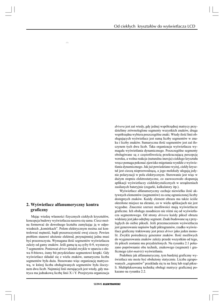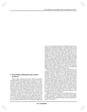 Od ciek³ych kryszta³ów do wywietlacza LCD 2. Wywietlacz alfanumeryczny kontra graficzny Maj¹c wiedzê w³asnoci fizycznych ciek³ych kryszta³ów, koncepcja budowy wywietlacza nasuwa siê sama. Ciecz mo¿na formowaæ do dowolnego kszta³tu zamykaj¹c j¹ w odpowiednich komórkach. Polem elektrycznym mo¿na za kontrolowaæ mêtnoæ, b¹d przezroczystoæ owej cieczy. Pewien problem stanowi u³o¿enie elektrod, przynajmniej jedna musi byæ przezroczysta. Wymagana iloæ segmentów wywietlacza zale¿y od gamy znaków. Jeli gam¹ t¹ s¹ cyfry 0-9, wystarczy 7 segmentów. Poniewa¿ driver dzia³a³ zwykle w oparciu o s³owa 8-bitowe, ósmy bit przydzielano segmentowi kropki. Gdy wywietlacz sk³ada³ siê z wielu znaków, sumaryczna liczba segmentów by³a du¿a. Stosowano wiêc organizacjê matrycow¹, w której liczba obs³ugiwanych segmentów by³a iloczynem dwu liczb. Najmniej linii steruj¹cych jest wtedy, gdy matryca ma jednakow¹ liczbê linii X i Y. Przejrzysta organizacja drivera jest za wtedy, gdy jednej wspó³rzêdnej matrycy przydzielimy zrównoleglone segmenty wszystkich znaków, druga wspó³rzêdna wybiera poszczególne znaki. Wtedy iloæ linii obs³uguj¹cych wywietlacz jest sum¹ liczby segmentów w znaku i liczby znaków. Sumaryczna iloæ segmentów jest za iloczynem tych dwu liczb. Taka organizacja wywietlacza wymaga³a wywietlania dynamicznego. Poszczególne segmenty obs³ugiwane s¹ z czêstotliwoci¹ przekraczaj¹c¹ percepcjê wzroku, a wolna reakcja (naturalna inercja) ciek³ego kryszta³u wrêcz pomaga pokonaæ zjawisko migotania wynik³e z wywietlania dynamicznego. Jak ju¿ powiedziano wy¿ej, ciek³y kryszta³ jest ciecz¹ nieprzewodz¹c¹, a jego moleku³y ulegaj¹ jedynie polaryzacji w polu elektrycznym. Sterowanie jest wiêc w du¿ym stopniu elektrostatyczne, co zaowocowa³o ekspansj¹ aplikacji wywietlaczy ciek³okrystalicznych w urz¹dzeniach zasilanych bateryjnie (zegarki, kalkulatory itp.). Wywietlacz alfanumeryczny cechuje niewielka iloæ aktywnych elementów (segmentów) za cenê ograniczonej liczby dostêpnych znaków. Ka¿dy element obrazu ma tak¿e cile okrelone miejsce na ekranie, co w wielu aplikacjach nie jest wygodne. Znacznie szersze mo¿liwoci maj¹ wywietlacze graficzne. Ich obs³uga zasadniczo nie ró¿ni siê od wywietlacza segmentowego. Od strony drivera ka¿dy piksel obrazu widziany jest jako odrêbny segment. Znaki budowane s¹ z przyleg³ych do siebie pikseli. Jeli przeznaczeniem wywietlacza jest generowanie napisów b¹d piktogramów, rzadko wywietlacz graficzny traktowany jest przez driver jako jeden monolit. Zwykle poredniczy generator znaków. Iloæ mo¿liwych do wygenerowania znaków zale¿y przede wszystkim od tego, ile pikseli zostanie mu przydzielonych. Na rysunku 2.1 pokazano poprównanie obu technik, znakowego (segment) i graficznego (dot-matrix) wywietlania. Podobnie jak alfanumeryczny, tym bardziej graficzny wywietlacz nie mo¿e byæ obs³u¿ony statycznie. Liczba zgrupowanych segmentów przek³ada siê tu na liniê lub rz¹d pikseli. Multipleksowan¹ technikê obs³ugi matrycy graficznej pokazano na rysunku 2.2. SERWIS ELEKTRONIKI Od ciek³ych kryszta³ów do wywietlacza LCD Segment Display (7-segment) Dot Matrix Display (5×7 matrix) Rys.2.1. Zobrazowanie informacji na wywietlaczu segmentowym i w matrycy punktów Signal Electrodes x1 x2 x3 x4 x5 x6 Scanning Electrodes x1 x2 x3 x4 x5 x6 y1 y1 y2 y2 y3 y3 y4 y4 y5 y5 y6 y6 y7 y7 Rys.2.2. Multipleksowany sposób obs³ugi matrycy dotmatrix Kolejnym k³opotliwym punktem wywietlacza ciek³okrystalicznego jest brak wiecenia. Segmenty lub piksele rozpoznawane s¹ przez ich mêtnoæ b¹d klarownoæ widoczn¹ w owietleniu zewnêtrznym. Nawet pierwsze historycznie zegarki cyfrowe posiada³y ¿aróweczkê, aby mo¿na by³o odczytaæ godzinê w ciemnym pomieszczeniu. Instrukcja obs³ugi zawiera³a informacjê o znacznie szybszym zu¿yciu baterii, gdy czêsto jest u¿ywane podwietlenie. Nie by³ to jednak backlight. SERWIS ELEKTRONIKI