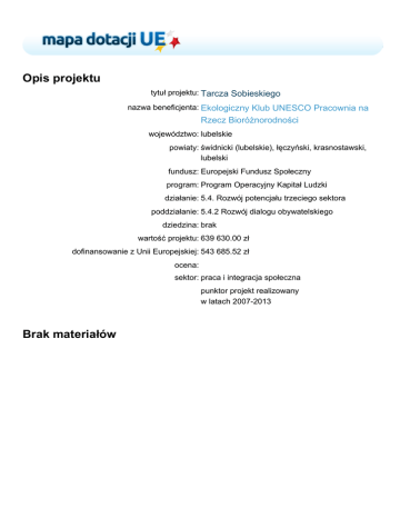 Opis projektu tytuł projektu: Tarcza Sobieskiego nazwa beneficjenta: Ekologiczny Klub UNESCO Pracownia na Rzecz Bioróżnorodności województwo: lubelskie powiaty: świdnicki (lubelskie), łęczyński, krasnostawski, lubelski fundusz: Europejski Fundusz Społeczny program: Program Operacyjny Kapitał Ludzki działanie: 5.4. Rozwój potencjału trzeciego sektora poddziałanie: 5.4.2 Rozwój dialogu obywatelskiego dziedzina: brak wartość projektu: 639 630.00 zł dofinansowanie z Unii Europejskiej: 543 685.52 zł ocena: sektor: praca i integracja społeczna punktor projekt realizowany w latach 2007-2013 Brak materiałów
