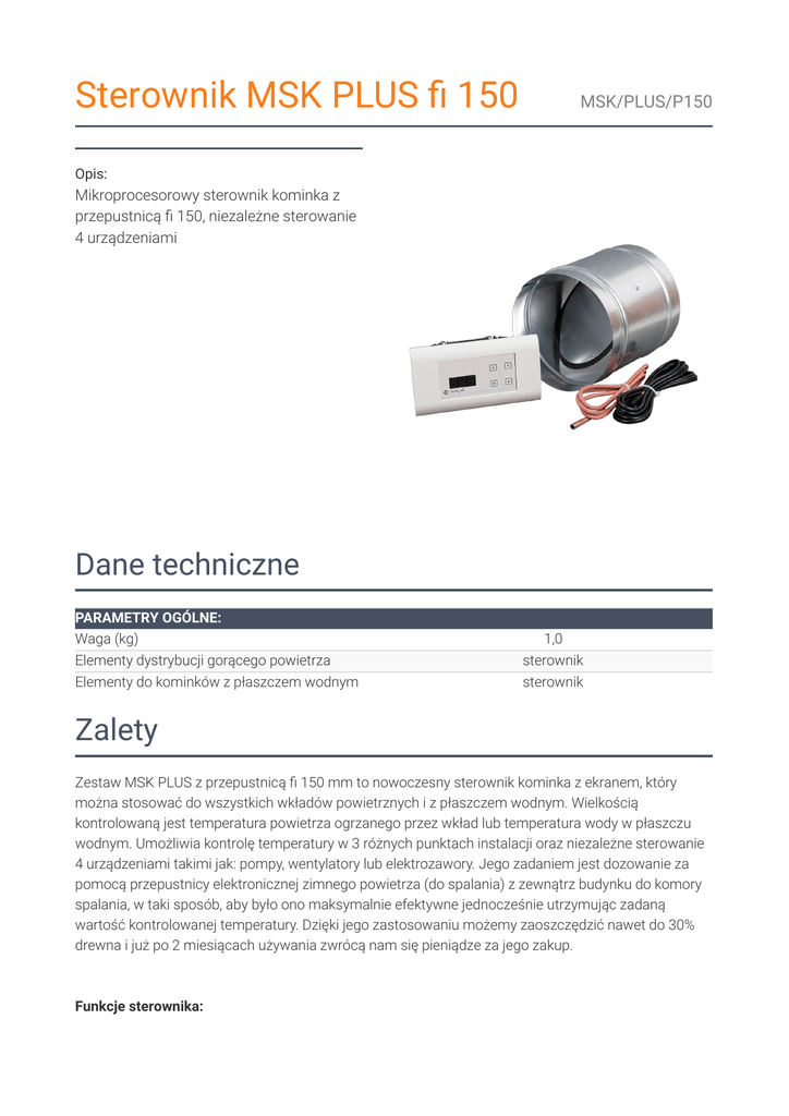 Sterownik MSK PLUS 150 MSK/PLUS/P150 Opis: Mikroprocesorowy sterownik kominka z przepustnicą 150, niezależne sterowanie 4 urządzeniami Dane techniczne PARAMETRY OGÓLNE: Waga (kg) Elementy dystrybucji gorącego powietrza Elementy do kominków z płaszczem wodnym 1,0 sterownik sterownik Zalety Zestaw MSK PLUS z przepustnicą 150 mm to nowoczesny sterownik kominka z ekranem, który można stosować do wszystkich wkładów powietrznych i z płaszczem wodnym. Wielkością kontrolowaną jest temperatura powietrza ogrzanego przez wkład lub temperatura wody w płaszczu wodnym. Umożliwia kontrolę temperatury w 3 różnych punktach instalacji oraz niezależne sterowanie 4 urządzeniami takimi jak: pompy, wentylatory lub elektrozawory. Jego zadaniem jest dozowanie za pomocą przepustnicy elektronicznej zimnego powietrza (do spalania) z zewnątrz budynku do komory spalania, w taki sposób, aby było ono maksymalnie efektywne jednocześnie utrzymując zadaną wartość kontrolowanej temperatury. Dzięki jego zastosowaniu możemy zaoszczędzić nawet do 30% drewna i już po 2 miesiącach używania zwrócą nam się pieniądze za jego zakup. Funkcje sterownika: - niezależne sterowanie czterema urządzeniami, np: pompami c.o., wentylatorami lub elektrozaworami - precyzyjne dawkowanie powietrza do spalania - zabezpieczenie przed przegrzaniem - odcięcie dopływu powietrza w przypadku zaniku zasilania - akustyczne ostrzeżenia - funkcja zapobiegania zamarznięciu wody obiegowej - funkcja rozbiegu posezonowego pomp obiegowych, gdy nie są używane poza sezonem. W skład tego zestawu wchodzi: - sterownik mikroprocesorowy - 1 czujnik temperatury z silikonowym kablem o długości 1 metr - 2 czujniki temperatury na kablach PCV o długości 1 metr - przepustnica z serwomechanizmem - kabel ze złączem do przepustnicy - zapasowy bezpiecznik T4/250V - zworka - puszka montażowa. Przepustnica jest wyposażona w specjalną uszczelkę, dzięki której odcięcie powietrza (do spalania) z zewnątrz jest całkowite. Po wygaśnięciu żaru we wkładzie sterownik automatycznie zamyka dopływ zimnego powietrza z zewnątrz, dzięki czemu nie następuje natychmiastowe wychłodzenie paleniska i mieszkania. UWAGA! W kominkach w wersji żeliwnej czujnik nie może być położony na wkładzie, ponieważ pod wpływem temperatury może się stopić. Sterowanie piecem olejowym lub gazowym w układzie z kominkiem następuje automatycznie. Jeżeli zaczniemy palić w kominku automatycznie sterowanie od pieca olejowego lub gazowego odnotuje zwiększenie temperatury w domu, a co za tym idzie nie załączy się piec olejowy lub gazowy do momentu, kiedy nie przestaniemy palić w kominku. W nocy, kiedy już będzie kończyło się drewno w kominku i zacznie spadać temperatura, automatycznie załączy się piec olejowy lub gazowy. Nie ma więc potrzeby połączenia sterownika kominka ze sterowaniem pieca olejowego lub gazowego. Gwarancja Wszystkie produkty dostępne na www.kratki.com są fabrycznie nowe, wolne od wad zycznych i prawnych oraz zostały legalnie wprowadzone na rynek polski. Producent udziela 2 lat gwarancji na sterownik. Zwrot Klient będący Konsumentem, który zawarł Umowę sprzedaży, może w terminie 14 dni odstąpić od niej bez podawania przyczyny. Bieg terminu na odstąpienie od Umowy sprzedaży rozpoczyna się od chwili objęcia Towaru w posiadanie przez Klienta lub wskazaną przez niego osobę trzecią inną niż przewoźnik. Oświadczenie można złożyć na formularzu, którego wzór został zamieszczony przez Sprzedawcę na Stronie Internetowej Sklepu pod adresem: formularz odstąpienia. Kratki.pl Marek Bal ul. W. Gombrowicza 4 26-660 Wsola/Jedlińsk www.kratki.com tel. 48 340 10 00 Data publikacji: 25.11.2016