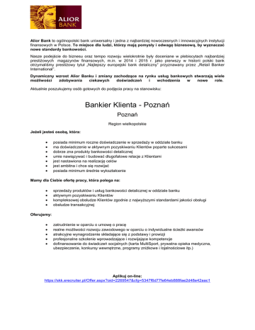 Alior Bank to ogólnopolski bank uniwersalny i jedna z najbardziej nowoczesnych i innowacyjnych instytucji finansowych w Polsce. To miejsce dla ludzi, którzy mają pomysły i odwagę biznesową, by wyznaczać nowe standardy bankowości. Nasze podejście do biznesu oraz tempo rozwoju wielokrotnie były doceniane w plebiscytach najbardziej prestiżowych magazynów finansowych, m.in. w 2014 i 2015 r. jako pierwszy w historii polski bank otrzymaliśmy prestiżowy tytuł „Najlepszy europejski bank detaliczny” przyznawany przez „Retail Banker International”. Dynamiczny wzrost Alior Banku i zmiany zachodzące na rynku usług bankowych stwarzają wiele możliwości zdobywania ciekawych doświadczeń i wchodzenia w nowe role. Aktualnie poszukujemy osób gotowych do podjęcia pracy na stanowisku: Bankier Klienta - Poznań Poznań Region wielkopolskie Jeżeli jesteś osobą, która: posiada minimum roczne doświadczenie w sprzedaży w oddziale banku ma doświadczenie w aktywnym pozyskiwaniu Klientów poparte sukcesami dobrze zna produkty bankowości detalicznej umie nawiązywać i budować długofalowe relacje z Klientami jest nastawiona na realizację celów jest ambitna i chce się rozwijać posiada minimum średnie wykształcenie Mamy dla Ciebie ofertę pracy, która polega na: sprzedaży produktów i usług bankowości detalicznej w oddziale banku aktywnym pozyskiwaniu Klientów kompleksowej obsłudze Klientów zgodnie z najwyższymi standardami jakości obsługi obsłudze transakcyjnej Oferujemy: zatrudnienie w oparciu o umowę o pracę realne możliwości rozwoju zawodowego w oparciu o indywidualne ścieżki awansów atrakcyjne wynagrodzenie składające się z podstawy i prowizji profesjonalne szkolenie wprowadzające i rozwijające kompetencje dofinansowanie do świadczeń socjalnych (karta MultiSport, prywatna opieka medyczna, ubezpieczenie, konkursy wewnętrzne, programy zniżkowe i lojalnościowe itp.) Aplikuj on-line: https://skk.erecruiter.pl/Offer.aspx?oid=2269547&cfg=5347f6d77fe64eb888fae2d48e42aac1