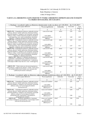 Załącznik Nr 1 do Uchwały Nr XVIII/131/16 Rady Miejskiej w Gniewie z dnia 24 lutego 2016 r. TARYFA ZA ZBIOROWE ZAOPATRZENIE W WODĘ I ZBIOROWE ODPROWADZANIE ŚCIEKÓW NA OKRES OD 01.04.2016r. DO 31.03.2017r. 1. Rodzaje i wysokość opłat za zbiorowe dostarczanie wody na okres od 1.04.2016 – do 31.03.2017 Taryfowa grupa odbiorców Wyszczególnienie Jednostka Cena netto Cena brutto /1 1 2 3 4 5 GRUPA W1 - Gospodarstwa domowe, jednostki oświaty, ochrony zdrowia i opieki społecznej, instytucje kultury, placówki handlowe i usługowe oraz instytucje i pozostali odbiorcy usług o niskim natężeniu przepływu przyłącza wodociągowego, przy sumie nominalnego strumienia objętości w zakresie od 0,00 m³/h do max 2,4m³/h GRUPA W2 - Gospodarstwa domowe, jednostki oświaty, ochrony zdrowia i opieki społecznej, instytucje kultury, placówki handlowe i usługowe oraz instytucje i pozostali odbiorcy usług o niskim natężeniu przepływu przyłącza wodociągowego, przy sumie nominalnego strumienia objętości w zakresie od 2,5 m³/h do max 5,9 m³/h, GRUPA W3 - Gospodarstwa domowe, jednostki oświaty, ochrony zdrowia i opieki społecznej, instytucje kultury, placówki handlowe i usługowe oraz instytucje i pozostali odbiorcy usług o niskim natężeniu przepływu przyłącza wodociągowego, przy sumie nominalnego strumienia objętości w zakresie od 6,0 m³/h, GRUPA W4 - Odbiorcy w lokalach mieszkalnych w budynkach wielolokalowych, lokalach użyteczności publicznej w budynkach wielolokalowych, wodomierze rozliczające źródła wody inne niż z sieci wodociągowej - cena za m3 wody zł/m3 3,65 3,94 zł 3,60 3,89 zł/m3 3,65 3,94 zł 5,47 5,91 zł/m3 3,65 3,94 zł 9,52 10,28 zł/m3 3,65 3,94 zł 1,91 2,06 zł/m3 3,65 3,94 zł - - GRUPA W5 - Woda zużyta na cele przeciwpożarowe, woda pobrana z publicznych zdrojów i studni, woda zużyta do zasilania publicznych fontann oraz zraszania ulic i publicznych terenów zielonych, - cena opłaty abonamentowej na odbiorcę - cena za m3 wody - cena opłaty abonamentowej na odbiorcę - cena za m3 wody - cena opłaty abonamentowej na odbiorcę - cena za m3 wody - cena opłaty abonamentowej na odbiorcę - cena za m3 wody - cena opłaty abonamentowej na odbiorcę 2. Rodzaje i wysokość opłat za zbiorowe odprowadzanie ściekówna okres od 1.04.2016 – do 31.03.2017 Taryfowa grupa odbiorców Wyszczególnienie 1 2 GRUPA K1 - Gospodarstwa domowe, jednostki oświaty, ochrony zdrowia i opieki społecznej, instytucje kultury, placówki handlowe i usługowe oraz instytucje i pozostali odbiorcy usług nie wytwarzających ścieków przemysłowych, - cena za m3 ścieków GRUPA K2 - Gospodarstwa domowe, jednostki oświaty, ochrony zdrowia i opieki społecznej, instytucje kultury, placówki handlowe i usługowe oraz instytucje i pozostali odbiorcy usług nie wytwarzających ścieków przemysłowych, wyposażone w przydomowe przepompownie ścieków, GRUPA K3 Podmioty gospodarcze i instytucje prowadzące działalność przemysłową i wytwarzające ścieki zaliczane do przemysłowych. - cena za m3 ścieków Jednostka 3 zł/m3 - cena opłaty abonamentowej na odbiorcę/m-c zł/m3 - cena za m3 ścieków - cena opłaty abonamentowej na odbiorcę/m-c zł/m3 5,06 5,96 zł Id: F8E7510C-913D-4948-94C9-4F6361B4FEF3. Podpisany 5,06 4,94 zł Cena brutto /1 4 4,91 zł - cena opłaty abonamentowej na odbiorcę/m-c Cena netto 5,06 5 5,30 5,46 5,34 5,46 6,44 5,46 Strona 1 3. UWAGI DO TARYFY: 1) Do ceny netto dolicza się podatek od towarów i usług (VAT) w aktualnej wysokości określonej odrębnymi przepisami. 2) Niniejszą taryfę opracowano na podstawie: a) ustawy z dnia 7 czerwca 2001 r. o zbiorowym zaopatrzeniu w wodę i zbiorowym odprowadzaniu ścieków (Dz.U. z 2015 r., poz. 139, ze zm.) b) rozporządzenia Ministra Budownictwa z dnia 28 czerwca 2006 r. w sprawie określenia taryf, wzoru wniosku o zatwierdzenie taryf oraz warunków rozliczeń za zbiorowe zaopatrzenie w wodę i zbiorowe odprowadzenie ścieków (Dz.U. z 2006 r., Nr 127, poz. 886) c) rozporządzenia Ministra Budownictwa z dnia 14 lipca 2006 r. w sprawie sposobu realizacji obowiązków dostawców ścieków przemysłowych oraz warunków wprowadzania ścieków do urządzeń kanalizacyjnych (Dz.U. z 2006 r., Nr 136, poz. 964, ze zm.), d) rozporządzenia Ministra Zdrowia dnia 13 listopada 2015 r. w sprawie jakości wody przeznaczonej do spożycia przez ludzi (Dz.U. z 2015 r., poz. 1989). 3) Rozliczenia za zbiorowe zaopatrzenie w wodę i zbiorowe odprowadzanie ścieków, prowadzone będą zgodnie z przepisami wyszczególnionymi w pkt. 2a, b, c, d, oraz zgodnie z aktualnym Regulaminem dostarczania wody i odprowadzania ścieków na terenie gminy Gniew, 4) W rozliczeniach w oparciu o wskazania wodomierza głównego, należności za opłaty abonamentowe naliczane będą wg taryfowych cen niezależnie od tego czy odbiorca usług pobierał wodę, 5) Ceny opłaty abonamentowej skalkulowano dla poszczególnych grup odbiorców usług, wyodrębniając koszty utrzymania w gotowości urządzeń wodociągowych, oraz mając na względzie ich zróżnicowanie związane ze średnicami nominalnymi eksploatowanych wodomierzy, a także inne koszty związane z utrzymaniem sieci wodociągowej, 6) W rozliczeniach z osobą korzystającą z lokalu w budynku wielolokalowym cenę opłaty skalkulowano w oparciu o koszty odczytu wodomierzy i rozliczeń należności. Preferowany okres rozliczeniowy dla wyżej wymienionych odbiorców usług wynosi sześć miesięcy, 7) W rozliczeniach w oparciu o wskazania wodomierza mierzącego ilość wody bezpowrotnie zużytej, cenę opłaty skalkulowano w oparciu o koszty odczytu wodomierzy, dokonywane łącznie z odczytem wodomierza głównego, 8) Odbiorców usług rozliczanych na podstawie przepisów dotyczących przeciętnych norm zużycia wody obowiązuje opłata abonamentowa, jak odbiorców usług wyposażonych w wodomierz DN20. Id: F8E7510C-913D-4948-94C9-4F6361B4FEF3. Podpisany Strona 2