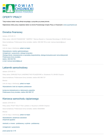 OFERTY PRACY Tutaj możesz dodać nową ofertę korzystając z przycisku po prawej stronie. Najświeższe oferty pracy znajdziesz także na stronie Powiatowego Urzędu Pracy w Chojnicach ( www.pupchojnice.pl) Doradca finansowy dodane: 2015-05-12 Pełny adres: USŁUGI FINANSOWE " MARFEX " Mariusz Barecki ul. Generała Sikorskiego 2, 89-650 Czersk Dane kontaktowe: Preferowane formy kontaktu: telefon: 606 939 763 e-mail: [email protected] Branża: Link do mapy z lokalizacją: pokaż na mapie Wykształcenie: średnie ogólnokształcące Umiejętności i uprawnienia: obsługa komputera Obsługa klienta, doświadczenie w sprzedaży bezpośredniej, obsługa komputera,exel, komunikatywność Preferowane formy kontaktu: telefon: 606 939 763 e-mail: [email protected] Lakiernik samochodowy dodane: 2015-05-12 Pełny adres: DARIUSZ FALK LAKIERNICTWO POJAZDOWE ul. Strzelecka 7A, 89-600 Chojnice Dane kontaktowe: Preferowane formy kontaktu: telefon 692 098 737 Branża: Link do mapy z lokalizacją: pokaż na mapie Wykształcenie: brak lub niepełne podstawowe konieczne doświadczenie w lakierowaniu pojazdów Preferowane formy kontaktu: telefon 692 098 737 Kierowca samochodu ciężarowego dodane: 2015-05-12 Pełny adres: PHUP "SOLO" Piotr Lubiñski ul. Wycecha 9, 89-600 Chojnice Dane kontaktowe: Preferowane formy kontaktu: telefon 500205854 Branża: Link do mapy z lokalizacją: pokaż na mapie Wykształcenie: zasadnicze zawodowe Znajomość języków: niemiecki, w mowie - podstawowy, w piśmie - podstawowy Umiejętności i uprawnienia: prawo jazdy kat. C+E doświadczenie mile widziane Preferowane formy kontaktu: telefon 500205854 Pracownik Informacji Turystycznej dodane: 2015-05-12 Pełny adres: PHU ,,MARKOWY'' BOŻENA STĘPIEÑ ul. Długa 33, 89-606 Charzykowy, Dane kontaktowe: Preferowane formy kontaktu: osobiście, telefon: 604647671 Branża: Link do mapy z lokalizacją: pokaż na mapie Wykształcenie: wyższe (w tym licencjat) Znajomość języków: angielski, w mowie - dobry, w piśmie - dobry niemiecki, w mowie - dobry, w piśmie - dobry Umiejętności i uprawnienia: obsługa kasy fiskalnej doświadczenie mile widziane Preferowane formy kontaktu: osobiście, telefon: 604647671 Handlowiec dodane: 2015-05-12 Pełny adres: Przedsiębiorstwo Handlowe "MARK" Mariusz Czapiewski ul. Powstañców Wielkopolskich 2, 89-600 Chojnice Dane kontaktowe: tel: 601 959 621 Branża: Link do mapy z lokalizacją: pokaż na mapie Wykształcenie: średnie zawodowe, techniczne Umiejętności i uprawnienia: prawo jazdy kat. B Wykształcenie min. średnie techniczne, prawo jazdy kat. B, znajomośc mechaniki maszyn, mile widziane doświadczenie. tel: 601 959 621 Pracownik I stopnia - Kasjer - Edukator Ekologiczny dodane: 2015-05-11 Pełny adres: Powiatowy Urząd Pracy w Chojnicach ul. Lichnowska 5, 89-620 Chojnice Dane kontaktowe: za pośrednictwem urzędu Branża: Link do mapy z lokalizacją: pokaż na mapie Wykształcenie:wyższe (w tym licencjat), średnie ogólnokształcące mile widziane doświadczenie w obsłudze kasy fiskalnej lub minimum 2 lata pracy na pokrewnym stanowisku z odpowiedzialnością materialną lub doświadczenie w pracy z dziećmi i młodzieżą, znajomość języka angielskiego w stopniu komunikatywnym, zainteresowania związane z nauką, ochroną środowiska lub historią powiatu chojnickiego, komunikatywność i umiejętność nawiązywania pozytywnych relacji z klientami, swoboda podczas wystąpieñ publicznych, umiejętność pracy z dziećmi i młodzieżą, wysoka kultura osobista, sumienność, gotowość do pracy popołudniami oraz w weekendy, mile widziana umiejętność obsługi programów od odróbki audio/ video, dobra organizacja pracy i skuteczność w działaniu za pośrednictwem urzędu Kierowca dodane: 2015-05-06 Pełny adres: PPUH Lahn Piotr Lahn ul. Długa 44, 89-606 Charzykowy Dane kontaktowe: Preferowane formy kontaktu: telefon: 52 3988251 e-mail: [email protected] Branża: Link do mapy z lokalizacją: pokaż na mapie Wykształcenie: zasadnicze zawodowe Umiejętności i uprawnienia: prawo jazdy kat. CE, prawo jazdy kat. C Preferowane formy kontaktu: telefon: 52 3988251 e-mail: [email protected] Pracownik porządkowy dodane: 2015-05-06 Pełny adres: BAUSTOFF + METALL COLOR SP. Z O.O. ul. Strzelecka 9, 89-600 Chojnice Dane kontaktowe: Preferowane formy kontaktu: osobiście Branża: Link do mapy z lokalizacją: pokaż na mapie Wykształcenie: zasadnicze zawodowe umiejętność malowanie i sprzątania Preferowane formy kontaktu: osobiście Tapicer dodane: 2015-05-06 Pełny adres: Czerska Fabryka Mebli sp. z o.o. ul. Szkolna 13, 89-650 Czersk, Dane kontaktowe: Preferowane formy kontaktu: telefon: 664 741 803 e-mail: [email protected] Branża: Link do mapy z lokalizacją: pokaż na mapie Wykształcenie: zasadnicze zawodowe Mile widziane doświadczenie jako tapicer Preferowane formy kontaktu: telefon: 664 741 803 e-mail: [email protected] Szwaczka dodane: 2015-05-06 Pełny adres: Czerska Fabryka Mebli sp. z o.o. ul. Szkolna 13, 89-650 Czersk Dane kontaktowe: Preferowane formy kontaktu: telefon: 664 741 803 e-mail: [email protected] Branża: Link do mapy z lokalizacją: pokaż na mapie Wykształcenie: zasadnicze zawodowe Mile widziane doświadczenie jako tapicer Preferowane formy kontaktu: telefon: 664 741 803 e-mail: [email protected] Nauczyciel matematyki dodane: 2015-05-06 Pełny adres: Gimnazjum nr 1 im. Jana Pawła II w Chojnicach ul. Młodzieżowa 44, 89-604 Chojnice Dane kontaktowe: Preferowane formy kontaktu: osobiście, telefon: 52 3974100 Branża: Link do mapy z lokalizacją: pokaż na mapie Wykształcenie: wyższe (w tym licencjat), pedagogiczne Doświadczenie zawodowe mile widziane, umiejetności interpersonalne. Preferowane formy kontaktu: osobiście, telefon: 52 3974100 Murarz dodane: 2015-05-04 Pełny adres: USŁUGI BUDOWLANE ul. Miłosza 57, 89-600 Chojnice Dane kontaktowe: Preferowane formy kontaktu: telefon: 535121124 Branża: Link do mapy z lokalizacją: pokaż na mapie W