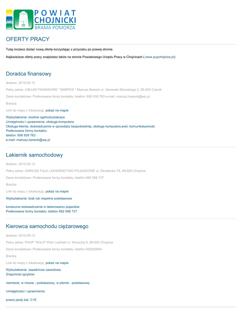 oferty pracy - Biznes Chojnice