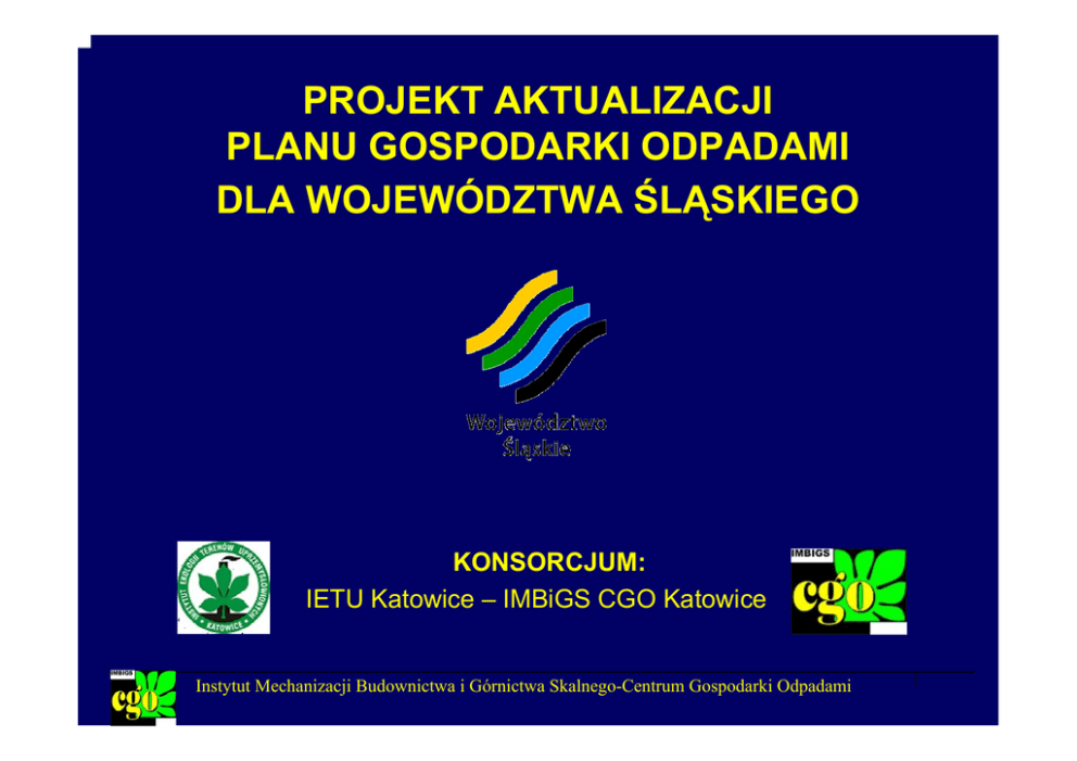 PROJEKT AKTUALIZACJI PLANU GOSPODARKI ODPADAMI DLA WOJEWÓDZTWA ŚLĄSKIEGO KONSORCJUM: IETU Katowice – IMBiGS CGO Katowice Instytut Mechanizacji Budownictwa i Górnictwa Skalnego-Centrum Gospodarki Odpadami 1 Sektor gospodarczy Ilość wytworzonych odpadów innych niż niebezpieczne i komunalne 43,0 mln Mg 9 Odzysk – 45,6 mln Mg (75% R11-R14) 9 Unieszkodliwianie – 843,0 tys. Mg (97% D1) Ilość wytworzonych odpadów niebezpiecznych 353,8 tys. Mg 9 Odzysk – 195,5 tys. Mg (73% R11-R14) 9 Unieszkodliwianie – 158,4 tys. Mg (74% D4) Instytut Mechanizacji Budownictwa i Górnictwa Skalnego-Centrum Gospodarki Odpadami 2 INSTALACJE Odpady inne niż niebezpieczne 9 Instalacje do odzysku i unieszkodliwiania – 465 9 Składowiska odpadów – 36 9 składowiska odpadów obojętnych - 2 Odpady niebezpieczne 9 Instalacje do odzysku i unieszkodliwiania – 61 9 Składowiska odpadów – 10 9 Składowiska odpadów zaw. azbest - 4 Instytut Mechanizacji Budownictwa i Górnictwa Skalnego-Centrum Gospodarki Odpadami 3 INSTALACJE Dodatkowo: • 5 instalacji do termicznego przetwarzania odpadów medycznych i weterynaryjnych, • 61 stacji demontażu pojazdów wycofanych z eksploatacji, • 4 punkty zbierania pojazdów wycofanych z eksploatacji, • 8 zakładów przetwarzania zużytego sprzętu elektrycznego i elektronicznego. Instytut Mechanizacji Budownictwa i Górnictwa Skalnego-Centrum Gospodarki Odpadami 4 Odpady niebezpieczne Rodzaj odpadu Wytwarzanie/ szacunek Odzysk PCB 4 800 Mg - W 5 149 sztuk - In 1,7 tys. Mg - In - Oleje odpadowe 570,2 Mg - W Pojazdy wycofane z eksploatacji Unieszkodliwianie Instalacje Uwagi 986,4 Mg 1 – 18 tys. Mg (oleje i ciecze z PCB) 30 czerwca 2010 r. 148,2 Mg 555,6 Mg Brak 20 % poziom zbierania 212 Mg - W 88,8 tys. Mg - S 6 658 Mg - 61 st. dem. 4 pkt. zb. 112 tys. Mg/rok Baterie i akumulatory 6,1 tys. Mg - W 6 033 Mg 41,7 Mg 3 instalacje 172 tys. Mg/rok Medyczne i weterynaryjne 2,6 tys. Mg - W - 4,5 tys. Mg 5 instalacji 9,92 tys. Mg/rok Sprzęt elektryczny i elektroniczny 657,7 Mg - W - 15,3 Mg 8 zakładów przetwarzania 30,65 tys. Mg/rok Azbest 3,1 tys. Mg - W 99 5 tys. Mg - In - 8,1 tys. Mg 4 składowiska 320 tys. m3 (16%) Pestycydy 789,8 Mg - W 10 Mg (mogilniki istn.) - 2,2 tys. Mg 1 instalacja 30 tys. Mg/rpk 4 mogilniki 2010 r. Instytut Mechanizacji Budownictwa i Górnictwa Skalnego-Centrum Gospodarki Odpadami 5 Lokalizacja instalacji do odzysku i unieszkodliwiania odpadów innych niż niebezpieczne 465 Instytut Mechanizacji Budownictwa i Górnictwa Skalnego-Centrum Gospodarki Odpadami 6 Lokalizacja instalacji do odzysku i unieszkodliwiania odpadów niebezpiecznych 61 Instytut Mechanizacji Budownictwa i Górnictwa Skalnego-Centrum Gospodarki Odpadami 7 Lokalizacja składowisk odpadów: • innych niż niebezpieczne - 36 • obojętnych – 2 • niebezpiecznych - 10 • azbestowych - 4 Instytut Mechanizacji Budownictwa i Górnictwa Skalnego-Centrum Gospodarki Odpadami 8 Lokalizacja stacji demontażu (61) i punktów zbierania (4) pojazdów wycofanych z eksploatacji Instytut Mechanizacji Budownictwa i Górnictwa Skalnego-Centrum Gospodarki Odpadami 9 Lokalizacja zakładów przetwarzania zużytego sprzętu elektrycznego i elektronicznego (8) Instytut Mechanizacji Budownictwa i Górnictwa Skalnego-Centrum Gospodarki Odpadami 10 PROGNOZY Odpady inne niż niebezpieczne 9 2008 r. - 45,6 mln Mg 9 2010 r. - 48,4 mln Mg 9 2014 r. - 54,5 mln Mg 9 2018 r. - 61,3 mln Mg Odpady niebezpieczne 9 2008 r. - 357,4 tys. Mg 9 2010 r. - 360,9 tys. Mg 9 2014 r. - 368,2 tys. Mg 9 2018 r. - 375,6 tys. Mg Instytut Mechanizacji Budownictwa i Górnictwa Skalnego-Centrum Gospodarki Odpadami 11 CELE Odpady inne niż niebezpieczne i komunalne 9 minimalizacja ilości wytwarzanych odpadów, 9 sukcesywne zwiększanie udziału odpadów poddanych procesom odzysku i unieszkodliwiania poza składowaniem. Odpady niebezpieczne 9 uszczelnienie systemu zbierania odpadów niebezpiecznych ze szczególnym uwzględnieniem selektywnego zbierania odpadów niebezpiecznych ze źródeł rozproszonych, 9 sukcesywna minimalizacja ilości powstających odpadów niebezpiecznych, 9 sukcesywne zwiększenie ilości odpadów poddawanych procesom odzysku, 9 dostosowanie funkcjonujących instalacji do wymogów BAT, 9 edukacja ekologiczna wytwórców odpadów niebezpiecznych. Instytut Mechanizacji Budownictwa i Górnictwa Skalnego-Centrum Gospodarki Odpadami 12 CELE SZCZEGÓŁOWE Odpady niebezpieczne 9 całkowite wycofanie do 30 czerwca 2010 r. z użytkowania urządzeń zawierających PCB o stężeniu powyżej 0,005%, 9 osiągnięcie 50% odzysku i 35 % recyklingu olejów odpadowych, 9 rozwój systemu zbierania baterii i akumulatorów przenośnych w celu osiągnięcia w 2012 r. poziomu zbierania w wysokości 25%, a w 2016r. – 45%, 9 wprowadzenie od 2008 r. zakazu wprowadzania do obrotu baterii i akumulatorów o zawartości Hg > 0,0005% i Cd > 0,002%, 9 ustanowienie od 2012 zakazu stosowania baterii i akumulatorów Ni-Cd, 9 utrzymanie obecnej przepustowości instalacji do termicznego unieszkodliwiania odpadów medycznych i weterynaryjnych, 9 wzrost efektywności systemu zbierania i demontażu pojazdów wycofanych z eksploatacji i osiągnięcie wymaganych ustawowo poziomów odzysku i recyklingu, 9 osiągniecie w 2008 r. poziomu zbierania ZSEE z gospodarstw domowych w wysokości 4kg/mieszkańca – w skali woj. 20,6 tys. Mg, 9 osiągnięcie wymaganych ustawowo poziomów odzysku i recyklingu ZSEE, 9 usunięcie około 40 tys. Mg odpadów zawierających azbest do 2018 r., 9 likwidacja do końca 2010 r. pozostałych na terenie woj. śląskiego 4 mogilników. Instytut Mechanizacji Budownictwa i Górnictwa Skalnego-Centrum Gospodarki Odpadami 13 KIERUNKI DZIAŁAŃ 9 Edukacja ekologiczna promująca minimalizację powstawania odpadów oraz właściwe postępowanie z nimi, 9 Promocja wdrażania technologii produkcji zapobiegających powstawaniu odpadów lub ograniczających ich ilość i zagrożenie dla środowiska, 9 Promocja wdra