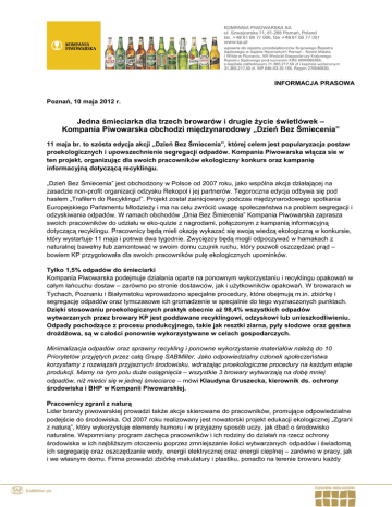 INFORMACJA PRASOWA Poznań, 10 maja 2012 r. Jedna śmieciarka dla trzech browarów i drugie życie świetlówek – Kompania Piwowarska obchodzi międzynarodowy „Dzień Bez Śmiecenia” 11 maja br. to szósta edycja akcji „Dzień Bez Śmiecenia”, której celem jest popularyzacja postaw proekologicznych i upowszechnienie segregacji odpadów. Kompania Piwowarska włącza sie w ten projekt, organizując dla swoich pracowników ekologiczny konkurs oraz kampanię informacyjną dotyczącą recyklingu. „Dzień Bez Śmiecenia” jest obchodzony w Polsce od 2007 roku, jako wspólna akcja działającej na zasadzie non-profit organizacji odzysku Rekopol i jej partnerów. Tegoroczna edycja odbywa się pod hasłem „Trafiłem do Recyklingu!”. Projekt został zainicjowany podczas międzynarodowego spotkania Europejskiego Parlamentu Młodzieży i ma na celu zwrócić uwagę społeczeństwa na problem segregacji i odzyskiwania odpadów. W ramach obchodów „Dnia Bez Śmiecenia” Kompania Piwowarska zaprasza swoich pracowników do udziału w eko-quizie z nagrodami, połączonym z kampanią informacyjną dotyczącą recyklingu. Pracownicy będą mieli okazję wykazać się swoją wiedzą ekologiczną w konkursie, który wystartuje 11 maja i potrwa dwa tygodnie. Zwycięzcy będą mogli odpoczywać w hamakach z naturalnej bawełny lub zamontować w swoim domu czujnik ruchu, który pozwoli oszczędzać prąd – bowiem KP przygotowała dla swoich pracowników pulę ekologicznych upominków. Tylko 1,5% odpadów do śmieciarki Kompania Piwowarska podejmuje działania oparte na ponownym wykorzystaniu i recyklingu opakowań w całym łańcuchu dostaw – zarówno po stronie dostawców, jak i użytkowników opakowań. W browarach w Tychach, Poznaniu i Białymstoku wprowadzono specjalne procedury, które obejmują m.in. zbiórkę i segregację odpadów oraz tymczasowe ich gromadzenie w specjalnie do tego wyznaczonych punktach. Dzięki stosowaniu proekologicznych praktyk obecnie aż 98,4% wszystkich odpadów wytwarzanych przez browary KP jest poddawane recyklingowi, odzyskowi lub unieszkodliwieniu. Odpady pochodzące z procesu produkcyjnego, takie jak resztki ziarna, pyły słodowe oraz gęstwa drożdżowa, są w całości ponownie wykorzystywane w celach gospodarczych. Minimalizacja odpadów oraz sprawny recykling i ponowne wykorzystanie materiałów należą do 10 Priorytetów przyjętych przez całą Grupę SABMiller. Jako odpowiedzialny członek społeczeństwa korzystamy z rozwiązań przyjaznych środowisku, wdrażając proekologiczne procedury na każdym etapie produkcji. Mamy na tym polu duże osiągnięcia – wszystkie 3 browary wytwarzają na dobę mniej odpadów, niż mieści się w jednej śmieciarce – mówi Klaudyna Gruszecka, kierownik ds. ochrony środowiska i BHP w Kompanii Piwowarskiej. Pracownicy zgrani z naturą Lider branży piwowarskiej prowadzi także akcje skierowane do pracowników, promujące odpowiedzialne podejście do środowiska. Od 2007 roku realizowany jest nowatorski projekt edukacji ekologicznej „Zgrani z naturą”, który wykorzystuje elementy humoru i w przyjazny sposób uczy, jak dbać o środowisko naturalne. Wspomniany program zachęca pracowników i ich rodziny do działań na rzecz ochrony środowiska w ich najbliższym otoczeniu poprzez zmniejszanie ilości wytwarzanych odpadów i świadomą ich segregację oraz oszczędzanie wody, energii elektrycznej oraz energii cieplnej – zarówno w pracy, jak i we własnym domu. Firma prowadzi zbiórkę makulatury i plastiku, ponadto na terenie browaru każdy pracownik może pozbyć się kłopotliwych odpadów, np. baterii, drobnego sprzętu elektronicznego czy płyt CD, których nie powinno się wyrzucać do zwykłych koszy na śmieci. Swoistą formą recyklingu jest wprowadzanie ubrań i dodatków do drugiego obiegu – KP cyklicznie organizuje eventy pod hasłem „Zielona szafa”. Procedury firmy wsparte inicjatywą pracowników Dobry przykład idzie z góry, ale także sami pracownicy wychodzą z pomysłami, jak chronić dobra naturalne. Do takich działań należy realizowany od stycznia br. innowacyjny projekt „Zielona logistyka: nowe życie świetlówki”, rozpoczęty z inicjatywy trzech pracowników Kompanii Piwowarskiej w Tychach. Firma prowadzi odzysk sprawnych świetlówek z likwidowanych i wycofywanych z rynku lodówek i regałów piwnych. Odzyskane w ten sposób świetlówki trafiają ponownie do obiegu – KP wykorzystuje je w remontowanych lodówkach oraz na wymiany w rynku. Rozwiązanie to niesie ze sobą oszczędności finansowe w skali roku. Przyczynia się także do ochrony środowiska poprzez zmniejszenie ilości niebezpiecznych odpadów i realizuje jeden z 10 priorytetów zrównoważonego rozwoju firmy, dlatego projekt ten został wprowadzony we wszystkich browarach KP. Szczegółowe informacje na temat priorytetów środowiskowych są dostępne w Raporcie zrównoważonego rozwoju Kompanii Piwowarskiej 2011 (http://www.kp.pl/documents/article/kp_sd_raport_2011.pdf). Do redaktora: Kompania Piwowarska – Lider branży piwowarskiej w Polsce Kompania Piwowarska jest największym przedsiębiorstwem piwowarskim w Polsce. Kilkusetletnie doświadczenia w warzeniu piwa, nowoczesne technologie i rygorystyczne przestrzeganie zasad produkcji na światowym poziomie gwarantują najwyższą jakość naszych produktów. Do portfela marek KP należą najpopularniejsze polskie piwa – m.in. Tyskie, Żubr, Lech, Dębowe Mocne, Redd's, a także międzynarodowe marki premium: Pilsner Urquell, Grolsch oraz Peroni Nastro Azzurro. Kompania Piwowarska (utworzona w 1999 roku) posiada trzy browary (w Tychach, Poznaniu i Białymstoku) oraz oddziały handlowe na terenie całego kraju. Kompania Piwowarska prowadzi także działalność społeczną oraz programy edukacyjne popularyzujące odpowiedzialność i umiar w konsumowaniu alkoholu. Wielkość sprzedaży osiągniętej przez KP w roku finansowym zakończonym 31 