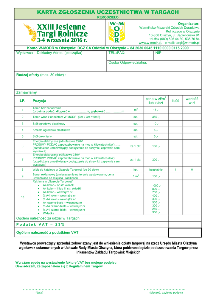 KARTA ZGŁOSZENIA UCZESTNICTWA W TARGACH RĘKODZIEŁO Organizator: Warmińsko-Mazurski Ośrodek Doradztwa Rolniczego w Olsztynie 10-356 Olsztyn, ul. Jagiellońska 91 tel./fax (089) 526 44 39, 535 76 84 www.w-modr.pl, e-mail: [email protected] Konto W-MODR w Olsztynie: BGZ SA Oddział w Olsztynie – 84 2030 0045 1110 0000 0115 2990 Wystawca – Dokładny Adres: (pieczątka) TEL./FAX: NIP Osoba Odpowiedzialna: Rodzaj oferty (max. 30 słów) : Zamawiamy LP. cena w zł/m lub zł/szt Pozycja 1 Teren bez zadaszenia (prosimy podać: długość = ……….…….m, głębokość …..…..…….m m2 15 ,- 2 Teren wraz z namiotem W-MODR (3m x 3m = 9m2) szt. 350 ,- 3 Stół ogrodowy plastikowy szt. 10 ,- 4 Krzesło ogrodowe plastikowe szt. 5 ,- 5 Stół drewniany szt. 5 ,- za 1 pkt. 150 ,- za 1 pkt. 300 ,- Wpis do katalogu w Gazecie Targowej (do 30 słów) kpl. bezpłatnie Baner reklamowy (umieszczenie na terenie wystawowym, cena uzależniona od miejsca i wielkości) Reklama w „Gazecie Targowej” • A4 kolor – IV str. okładki • A4 kolor – II lub III str. okładki • A4 kolor – wewnątrz nr • ½ A4 kolor – wewnątrz nr • ¼ A4 kolor – wewnątrz nr • A4 czarno-biała – wewnątrz nr • ½ A4 czarno-biała – wewnątrz nr • ¼ A4 czarno-biała – wewnątrz nr • Wkładka 1 m2 150 ,- 6 7 8 9 10 Energia elektryczna jednofazowa 220V PROSIMY PODAĆ zapotrzebowanie na moc w kilowatach (kW)…… (przedłużacz umożliwiający podłączenie do skrzynki, zapewnia sam wystawca) Energia elektryczna trójfazowa 380V PROSIMY PODAĆ zapotrzebowanie na moc w kilowatach (kW)…… (przedłużacz umożliwiający podłączenie do skrzynki, zapewnia sam wystawca) 2 ilość wartość w zł 1 0 1 000 ,800 ,700 ,400 ,300 ,500 ,300 ,250 ,350 ,- Ogółem należność za udział w Targach Podatek VAT – 23% Ogółem należność z podatkiem VAT Wystawca prowadzący sprzedaż zobowiązany jest do wniesienia opłaty targowej na rzecz Urzędu Miasta Olsztyna wg stawek ustanowionych w Uchwale Rady Miasta Olsztyna, która pobierana będzie podczas trwania Targów przez inkasentów Zakładu Targowisk Miejskich Wyrażam zgodę na wystawienie faktury VAT bez mojego podpisu Oświadczam, że zapoznałem się z Regulaminem Targów …………………….. (data) ……………………….. .(pieczęć, czytelny podpis) DEKLARACJA Oświadczam, iż dokonując jakiejkolwiek sprzedaży produktów podczas trwania XXIII Jesiennych Targów Rolniczych „Wszystko dla Rolnictwa” posiadam ku temu stosowne zezwolenia, koncesje (jeśli są do tego wymagane). Ponadto zobowiązuję się do udokumentowania sprzedaży w sposób wymagany przepisami prawa powszechnie obowiązującego (w tym: posiadanie kasy fiskalnej, wystawienia faktur, rachunków, książki przychodów i rozchodów). ……………………………………………………….. Data, pieczątka / podpis XXIII Jesienne Targi Rolnicze „Wszystko dla Rolnictwa” 3-4 września 2016 r., Olsztyn ul. Jagiellońska 91 Warmińsko-Mazurski Ośrodek Doradztwa Rolniczego w Olsztynie 10-356 Olsztyn, ul. Jagiellońska 91, tel./fax: 089 526 44 39 089 535 76 84, 089 526 82 29 e-mail: [email protected], www.w-modr.pl