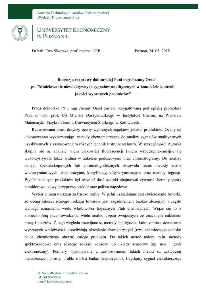 Katedra Technologii i Analizy Instrumentalnej Wydział Towaroznawstwa Dr hab. Ewa Sikorska, prof. nadzw. UEP Poznań, 24. 05. 2015 Recenzja rozprawy doktorskiej Pani mgr Joanny Orzeł pt. ”Modelowanie nieselektywnych sygnałów analitycznych w kontekście kontroli jakości wybranych produktów” Praca doktorska Pani mgr Joanny Orzeł została przygotowana pod opieką promotora Pana dr hab. prof. UŚ Michała Daszykowskiego w Instytutcie Chemii, na Wydziale Matematyki, Fizyki i Chemii, Uniwersytetu Śląskiego w Katowicach. Recenzowana praca dotyczy oceny wybranych aspektów jakości produktów. Oceny tej dokonywanno wykorzystując metody chemometryczne do analizy sygnałów analitycznych uzyskiwanych z zastosowaniem różnych technik instrumentalnych. W szczególności Autorka skupiła się na analizie widm całkowitej fluorescencji (widm wzbudzenia-emisji), ale wykorzystywała także widma w zakresie podczerwieni oraz chromatogramy. Do analizy danych spektroskopowych lub chromatograficznych stosowała różne metody analiz wielowymiarowych: eksploracyjne, klasyfikacyjne/dyskryminacyjne oraz metody regresji. Wybór badanych produktów był również dość szeroki obejmował żywność: herbaty, pasty pomidorowe, kawy, przyprawy, cukier oraz paliwa napędowe. Wybór tematu uważam za bardzo trafny. W pełni uzasadnione jest stwierdzenie Autorki, że ocena jakości różnego rodzaju towarów jest zagadnieniem bardzo złożonym i często wymaga oznaczenia wielu właściwości fizycznych i/lub chemicznych. Wiąże się to z koniecznością przeprowadzenia wielu analiz, często związanych ze znacznym nakładem pracy i kosztów. Z tego względu rozwijane są metody analityczne, które zamiast oznaczania wybranych właściwości umożliwiają określenie charakterystyki (tzw. chemicznego odcisku palca, chemicznego obrazu) całego produktu. Do takich metod należą m.in. metody spektroskopowe oraz różnego rodzaju sensory lub układy sensorów (np. nos i język elektroniczny). Pomiary wykonywane z zastosowaniem takich metod są zazwyczaj nieniszczące i proste, próbki można badać bezpośrednio. Uzyskany sygnał charakteryzuje al. Niepodległości 10, 61-875 Poznań tel. 061 856 90 58 e-mail [email protected] Katedra Technologii i Analizy Instrumentalnej Wydział Towaroznawstwa produkt, ale uzyskanie jakościowych lub ilościowych informacji o właściwościach produktu wymaga zastosowania zaawansowanych metod analizy. Takie właśnie metody stosowała w swoich badaniach Pani mgr Joanna Orzeł do rozwiązywania różnych problemów analitycznych. Formalna ocena rozprawy Rozprawę doktorską stanowi cykl sześciu publikacji. Pracę rozpoczyna wstęp oraz wprowadzenie do tematyki badań. Po tej części przedstawiony został cel pracy. Zasadniczą część pracy stanowi sześć opublikowanych artykułów w języku angielskim, każdy z nich został opatrzony krótkim wprowadzeniem w języku polskim. W pracy zamieszczone zostały również wyniki badań dotąd nieopublikowanych. Na końcu Doktorantka przedstawiła podsumowanie i wnioski oraz spis literatury, (liczący 125 pozycji), zamieściła także informacje o źródłach finansowania badań oraz własne curriculum vitae. W pracy zamieszczono także streszczenie w języku polskim i angielskim. Obowiązująca ustawa o stopniach i tytule naukowym dopuszcza przedstawienie spójnego tematycznie cyklu publikacji jako podstawy pracy doktorskiej i Pani mgr Joanna Orzeł posiadająca znaczny dorobek publikacyjny z tej możliwości skorzystała. Wszystkie artykuły składające się na rozprawę doktorską zostały opublikowane w prestiżowych czasopismach naukowych o cyrkulacji międzynarodowej, z tzw. listy filadelfijskiej (łączny IF=19,34, co daje wysoką wartość średnią ok. 3,23 na publikację). Elementem wspólnym wszystkich publikacji jest wykorzystanie metod chemometrycznych do analizy sygnałów analitycznych charakteryzujących jakość badanych próbek. Prezentowane publikacje są wieloautorskie, ale we wszystkich pierwszym Autorem jest Doktorantka. Ponadto w pracy (zgodnie z wymogami zawartymi w Rozporządzeniu Ministra Nauki i Szkolnictwa Wyższego z dnia 3 października 2014 r. w sprawie szczegółowego trybu i warunków przeprowadzania czynności w przewodzie doktorskim, w postępowaniu habilitacyjnym oraz w postępowaniu o nadanie tytułu profesora) zamieszczone są oświadczenia wszystkich współautorów określające indywidualny wkład każdego z nich w powstanie publikacji. Z przedstawionych oświadczeń wynika, że wkład Doktorantki w powstanie wszystkich publikacji był bardzo duży. al. Niepodległości 10, 61-875 Poznań tel. 061 856 90 58 e-mail [email protected] Katedra Technologii i Analizy Instrumentalnej Wydział Towaroznawstwa Merytoryczna ocena pracy Rozprawę rozpoczyna Wstęp oraz wprowadzenie do tematyki badań. Doktorantka charakteryzuje w nim sygnały analityczne otrzymywane z wykorzystaniem różnych technik eksperymentalnych oraz metody ich analizy, a także przedstawia przykłady zastosowań w ocenie jakości. Część ta byłaby bardzo interesująca, niestety znajduje się tu wiele nieprecyzyjnych sformułowań, a język jakim posługuje się Doktorantka w wielu przypadkach utrudnia lub wręcz uniemożliwia zrozumienie sensu wypowiedzi. Przytoczę tylko jeden wybrany przykład. Autorka na stronie 12 stwierdza: „Fluorescencyjne obrazy nazywane również fluorescencyjnymi widmami synchronicznymi (ang. excitation-emission fluorescence spectroscopy matrices lub fluorescence landscapes) to rodzaj pomiarów instrumentalnych, których wynikiem są dwuwymiarowe sygnały analityczne.” Jest to stwierdzenie całkowicie błędne. Widma synchroniczne fluorescencji oraz widma całkowitej fluorescencji (tzw. widma wzbudzenia-emisji) są to dwa różne rodzaje widm. Określenie „fluorescencyjne obrazy”, w polskiej terminologii nie oznacza żadnego z rodzajów widm fluorescencji. Natomiast Doktorantka posług