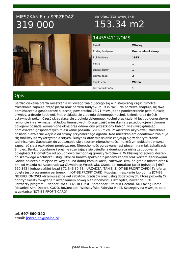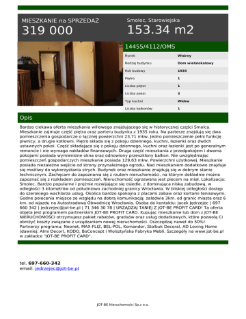 MIESZKANIE na SPRZEDAŻ 319 000 Smolec, Starowiejska 153.34 m2 14455/4112/OMS Rynek Wtórny Rodzaj budynku Dom wielolokalowy Rok budowy 1935 Piętro 1 Liczba pięter 1 Liczba pokoi 3 Typ kuchni Widna Liczba balkonów 1 Opis Bardzo ciekawa oferta mieszkania willowego znajdującego się w historycznej części Smolca. Mieszkanie zajmuje część piętra oraz parteru budynku z 1935 roku. Na parterze znajdują się dwa pomieszczenia gospodarcze o łącznej powierzchni 23,71 mkw. Jedno pomieszczenie pełni funkcję piwnicy, a drugie kotłowni. Piętro składa się z pokoju dziennego, kuchni, łazienki oraz dwóch ustawnych pokoi. Część składająca się z pokoju dziennego, kuchni oraz łazienki jest po generalnym remoncie i nie wymaga nakładów finansowych. Druga część mieszkania z przedpokojem i dwoma pokojami posiada wymienione okna oraz odnowiony przeszklony balkon. Nie uwzględniając pomieszczeń gospodarczych mieszkanie posiada 129,63 mkw. Powierzchni użytkowej. Mieszkanie posiada niezależne wejście od strony przynależnego ogrodu. Nad mieszkaniem dodatkowo znajduje się możliwy do wykorzystania strych. Budynek oraz mieszkanie znajdują się w dobrym stanie technicznym. Zachęcam do zapoznania się z rzutem nieruchomości, na którym dokładnie można zapoznać się z rozkładem pomieszczeń. Nieruchomość ogrzewana jest piecem na miał. Lokalizacja: Smolec. Bardzo popularne i prężnie rozwijające się osiedle, z dominująca niską zabudową, w odległości 3 kilometrów od południowo zachodniej granicy Wrocławia. W bliskiej odległości dostęp do szerokiego wachlarza usług. Okolica bardzo spokojna z placami zabaw oraz kortami tenisowymi. Godne polecenia miejsce ze względu na dobrą komunikacją: zaledwie 3km. od granic miasta oraz 6 km. od wjazdu na Autostradową Obwodnicę Wrocławia. Osoba do kontaktu: Jacek Jędrzejec | 697 660 342 | [email protected] | 71 346 30 78 | URZĄDZAJ TANIEJ Z JOT-BE PROFIT CARD! Ta oferta objęta jest programem partnerskim JOT-BE PROFIT CARD. Kupując mieszkanie lub dom z JOT-BE NIERUCHOMOŚCI otrzymujesz pakiet rabatów, gratisów oraz usług dodatkowych, które pozwolą Ci obniżyć koszty związane z urządzaniem nowej nieruchomości. Oszczędzaj nawet do 50%! Partnerzy programu: Neonet, MAX-FLIZ, BEL-POL, Komandor, Stolbuk Decoral, AD Loving Home (dawniej: Almi Decor), KODO, BoConcept i Wolsztyńska Fabryka Mebli. Szczegóły na www.jot-be.pl w zakładce "JOT-BE PROFIT CARD". tel. 697-660-342 email: [email protected] JOT-BE Nieruchomości Sp.z o.o. Powered by TCPDF (www.tcpdf.org)