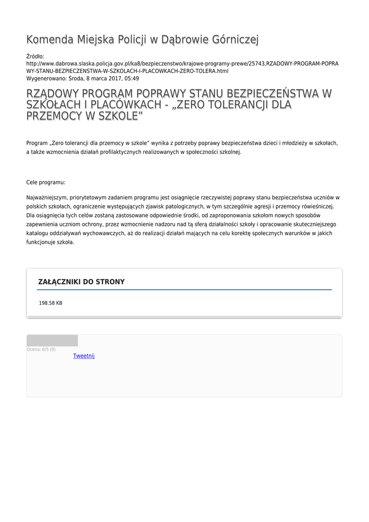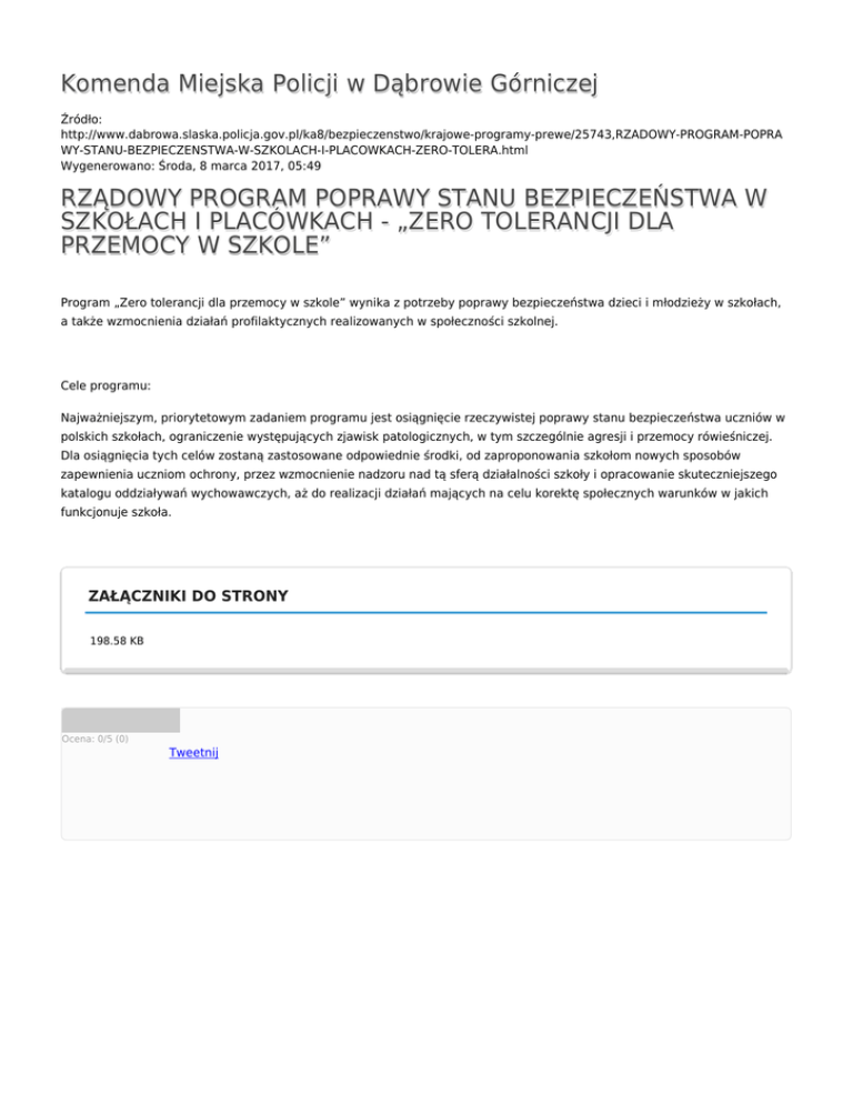 Komenda Miejska Policji w Dąbrowie Górniczej Źródło: http://www.dabrowa.slaska.policja.gov.pl/ka8/bezpieczenstwo/krajowe-programy-prewe/25743,RZADOWY-PROGRAM-POPRA WY-STANU-BEZPIECZENSTWA-W-SZKOLACH-I-PLACOWKACH-ZERO-TOLERA.html Wygenerowano: Środa, 8 marca 2017, 05:49 RZĄDOWY PROGRAM POPRAWY STANU BEZPIECZEŃSTWA W SZKOŁACH I PLACÓWKACH - „ZERO TOLERANCJI DLA PRZEMOCY W SZKOLE” Program „Zero tolerancji dla przemocy w szkole” wynika z potrzeby poprawy bezpieczeństwa dzieci i młodzieży w szkołach, a także wzmocnienia działań profilaktycznych realizowanych w społeczności szkolnej. Cele programu: Najważniejszym, priorytetowym zadaniem programu jest osiągnięcie rzeczywistej poprawy stanu bezpieczeństwa uczniów w polskich szkołach, ograniczenie występujących zjawisk patologicznych, w tym szczególnie agresji i przemocy rówieśniczej. Dla osiągnięcia tych celów zostaną zastosowane odpowiednie środki, od zaproponowania szkołom nowych sposobów zapewnienia uczniom ochrony, przez wzmocnienie nadzoru nad tą sferą działalności szkoły i opracowanie skuteczniejszego katalogu oddziaływań wychowawczych, aż do realizacji działań mających na celu korektę społecznych warunków w jakich funkcjonuje szkoła. ZAŁĄCZNIKI DO STRONY 198.58 KB Ocena: 0/5 (0) Tweetnij