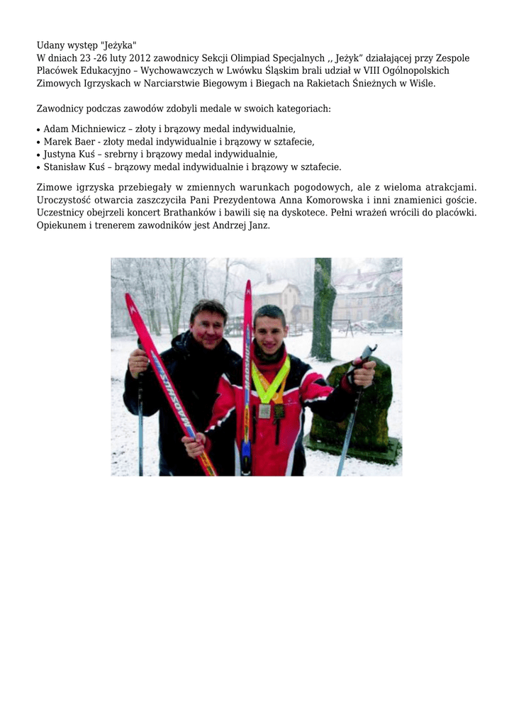 Udany występ "Jeżyka" W dniach 23 -26 luty 2012 zawodnicy Sekcji Olimpiad Specjalnych ,, Jeżyk” działającej przy Zespole Placówek Edukacyjno – Wychowawczych w Lwówku Śląskim brali udział w VIII Ogólnopolskich Zimowych Igrzyskach w Narciarstwie Biegowym i Biegach na Rakietach Śnieżnych w Wiśle. Zawodnicy podczas zawodów zdobyli medale w swoich kategoriach: ● ● ● ● Adam Michniewicz – złoty i brązowy medal indywidualnie, Marek Baer - złoty medal indywidualnie i brązowy w sztafecie, Justyna Kuś – srebrny i brązowy medal indywidualnie, Stanisław Kuś – brązowy medal indywidualnie i brązowy w sztafecie. Zimowe igrzyska przebiegały w zmiennych warunkach pogodowych, ale z wieloma atrakcjami. Uroczystość otwarcia zaszczyciła Pani Prezydentowa Anna Komorowska i inni znamienici goście. Uczestnicy obejrzeli koncert Brathanków i bawili się na dyskotece. Pełni wrażeń wrócili do placówki. Opiekunem i trenerem zawodników jest Andrzej Janz.