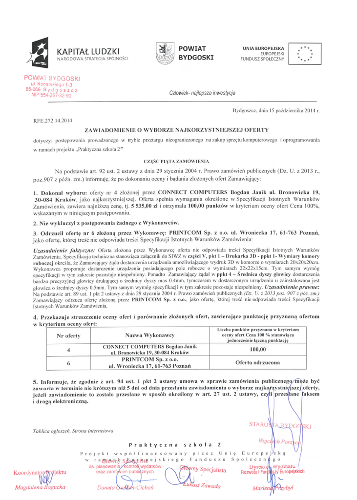POWIAT KAPITALLUDZKI UNIA EUROPEJSKA EUROPEJSKI FUNDUSZSPOtECZNY BYDGOSKI NARODOWA STRATEC1A SPOJNOSCi POWIAT BYOGOSKI ul. Konarskieg^ 1-3 85-066 B y d g o s z c z NIP 554-257-32-90 Cztowiek- najlepsza inwestycja Bydgoszcz, dnia 15 pazdzicrnika 2014 r. RFE.272.14.2014 ZAWIADOMIENIE O WYBORZE NAJKORZYSTNIEJSZEJ OFERTY dotyczy: postepowania prowadzonego w trybie przctargu nicograniczonego na zakup sprzetu komputerowego i oprogramowania w ramach projektu .,Praktyczna szkola 2" PI/VTA ZAMOVVIENIA Na podstawie art. 92 ust. 2 ustawy z dnia 29 stycznia 2004 r. Prawo zamowien publicznych (Dz. U. z 2013 r., poz.907 z pozn. zm.) informuje, ze po dokonaniu oceny i badania zlozonych ofert Zamawiajacy: 1. Dokonal wyboru: oferty nr 4 zlozonej przez CONNECT COMPUTERS Bogdan Janik ul. Bronowicka 19, 30-084 Krakow, jako najkorzystniejszej. Oferta spetnia wymagania okreslone w Specyfikacji Istotnych Warunkow Zamowienia, zawiera najnizsz^ cene, tj. 5 535,00 zl i otrzymata 100,00 punktow w kryterium oceny ofert Cena 100%, wskazanym w niniejszym postepowaniu. 2. Nie wykluczyl z postepowania zadnego z Wykonawcow. 3. Odrzucil ofert? nr 6 zlozonq przez Wykonawc?: PRINTCOM Sp. z o.o. ul. Wroniecka 17, 61-763 Poznari, jako oferte, ktorej tresc nie odpowiada tresci Specyfikacji Istotnych Warunkow Zamowienia: Uzasadnienie faktyczne: Oferta zlozona przez Wvkonawct; oferta nie odpowiada tresci Specyfikacji Istotnych Warunkow Zamowienia. Specyfikacja techniczna stanowiaca zalacznik do SIWZ w czesci V, pkt 1 - Drukarka 3D - ppkt 1- Wymiary komory roboczej okresla, ze Zamawiajacy zada dostarczenia urzadzenia umozliwiajacego wydruk 3D w komorze o wymiarach 20x20x20cm. Wykonawca proponuje dostarczenie urzadzenia posiadajacego pole robocze o wymiarach 22x22xl5cm. Tym samym wymog Specyfikacji w tym zakresie pozostaje niespclniony. Ponadto Zamawiajacy zada! w ppkt 4 - Srednica dyszy glowicy dostarczenia bardzo precyzyjnej glowicy drukujacej o srednicy dyszy max 0.4mm, tymczasem w dostarczonym urzadzeniu u zainstalowana jest glowica o srednicy dyszy 0.5mm. Tym samym wymog Specyfikacji w tym zakresie pozostaje niespelniony. Uzasadnienie prawne: Na podstawie art. 89 ust. 1 pkt 2 ustawy z dnia 29 stycznia 2004 r. Prawo zamowien publicznych (Dz. U. z 2013 poz. 907 z poz. zm.) Zamawiajacy odrzuca ofert? ziozona przez PRINTCOM Sp. z o.o., jako oferte. ktorej tresc nie odpowiada tresci Specyfikacji Istotnych Warunkow Zamowienia. 4. Przekazuje streszczenie oceny ofert i porownanie zlozonych ofert, zawierajijce punktacj^ przyznan^ ofertom w kryterium oceny ofert: Liczba punktow przyznana \ kryterium oceny ofert Cena 100 % stanowiaca Nazwa Wykonawcy Nr oferty jednoczesnie laeznq punktacj? CONNECT COMPUTERS Bogdan Janik 4 100,00 ul. Bronowicka 19,30-084 Krakow PRINTCOM Sp.z o.o. Oferta odrzucona 6 ul. Wroniecka 17, 61-763 Poznan 5. Informuje, ze zgodnie z art. 94 ust. 1 pkt 2 ustawy umowa w sprawie zamowienia publicznego/nToze bye zawarta w tcrminie nie krotszym niz 5 dni od dnia przeslania zawiadomienia o wyborze najkoi*zystnifljszej!oferty, jezeli zawiadomienie to zostalo przeslane w sposob okreslony w art. 27 ust. 2 ustawy, cz> aksem i drogi} elektronicznq. Tablica ogtoszen, Strona Internetowa P r a k t y c z n a P r o j e k t w Magdalena Bogucka s z k o t a w s p o l f i n a n s o w a n y p r z e z 2 U n i ? r a (jyi^ufrib SiSi^HliFliSt.*? e j s k i e g o F u n d u s z u ds planowania./kontroH.wydatkbw QI6ivnv <^n Danitta Cx, -Cichoh • Zawada E S p o t e c z n f t g o OyreiaJl|Wyoziatu \n publi^znych Marlenl f \