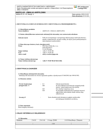 KARTA CHARAKTERYSTYKI SUBSTANCJI / MIESZANINY Karta Charakterystyki zosta a sporz dzona zgodnie z Za cznikiem I do Rozporz dzenia (WE) nr 453/2010. AKRYLUX - EMALIA AKRYLOWA MSDS PL 01 / PL Wersja 5 Data wydruku 2010-12-23 Data aktualizacji 17-11-10 1. IDENTYFIKACJA SUBSTANCJI/MIESZANINY I IDENTYFIKACJA PRZEDSI BIORSTWA 1.1 Identyfikator produktu Nazwa handlowa : AKRYLUX - EMALIA AKRYLOWA 1.2 Istotne zidentyfikowane zastosowania substancji lub mieszaniny oraz zastosowania odradzane : Zalecane u ycie Farby do wewn trznego i zewn trznego dekoracyjnego malowania drewna i metalu w budownictwie, na bazie wodnej, do u ycia, przez profesjonalnych i indywidualnych u ytkowników 1.3 Dane dotycz ce dostawcy karty charakterystyki : PPG Deco Polska Sp. z o.o. Firma ul.Kwidzy ska 8 51-416 Wroc aw : +(48) 71 78 80 700 Numer telefonu : +(48) 71 78 80 702 FAX : [email protected] Adres e-mail 1.4 Numer telefonu alarmowego Numer telefonu alarmowego : +(48) 71 78 80 700 (07:00-15:00) 2. IDENTYFIKACJA ZAGRO E 2.1 Klasyfikacja substancji lub mieszaniny Substancja lub mieszanina nie stwarza zagro enia zgodnie z dyrektywami 67/548/EWG lub 1999/45/WE. 2.2 Elementy etykiety : Zwroty bezpiecznego post powania - S S2 S46 Chroni przed dzie mi. W razie po kni cia niezw ocznie zasi gnij porady lekarza - poka opakowanie lub etykiet . Nie wdycha rozpylonej cieczy W przypadku niedostatecznej wentylacji stosowa odpowiednie indywidualne rodki ochrony dróg oddechowych. S23 S38 : Zwrot(y) P Karta charakterystyki dostepna na danie u ytkownika prowadz cego dzia alno zawodow . 2.3 Inne zagro enia Brak dost pnej informacji. 3. SK AD I INFORMACJA O SK ADNIKACH 3.2 Mieszaniny Sk adniki Nr EC Nr CAS Uwaga DSD 1/10 CLP Klasyfikacja St enie KARTA CHARAKTERYSTYKI SUBSTANCJI / MIESZANINY Karta Charakterystyki zosta a sporz dzona zgodnie z Za cznikiem I do Rozporz dzenia (WE) nr 453/2010. AKRYLUX - EMALIA AKRYLOWA MSDS PL 01 / PL Wersja 5 Data wydruku 2010-12-23 Data aktualizacji 17-11-10 nonylofenol oksyetylowany glikol dietylenowy 68412-54-4 203-872-2 Klasyfikacja N; R51/53 Xn; R22 Xi; R41 >=0.10 - <1.00% 111-46-6 Xn; R22 4; H302 >=1.00 - <2.50% nonylofenol oksyetylowany 68412-54-4 N; R51/53 Xn; R22 Xi; R41 >=0.10 - <1.00% sodium salt of polyoxyethylene nonylphenyl (branched) ether phosphates 68954-84-7 Xi; R38, R41 N; R51/53 >=0.10 - <1.00% * Lista Kandydacka Substancji o Du ym Znaczeniu dla Autoryzacji Producent wyrobu deklaruje, e dla zwrotów R niewymienionych w punkcie 3 ca kowita zawarto przekracza warto ci granicznych. substancji nie Je eli pojawia si wiele substancji o jednakowych identyfikatorach, to jednak ró ni si one w asno ciami niebezpiecze stwa np. punkt zap onu. 4. PIERWSZA POMOC 4.1 Opis rodków pierwszej pomocy : Porady ogólne Kontakt z oczami : Kontakt przez skór : Wdychanie : Po kni cie : W przypadku utrzymuj cych si objawów lub jakichkolwiek w tpliwo ci zasi gn porady medycznej. Nigdy nie podawa niczego doustnie osobie nieprzytomnej. Przep ukiwa otwarte oczy obficie czyst , wie wod przynajmniej przez 10 minut. Usun szk a kontaktowe. Zasi gn porady medycznej. Natychmiast zdj ska one ubranie. Przemy skór wod z myd em. NIE STOSOWA rozpuszczalników lub rozcie czalników. Wynie na wie e powietrze. Zapewni poszkodowanemu ciep o i spokój. W przypadku nieregularnego lub zatrzymanego oddechu zastosowa sztuczne oddychanie. Osobie nieprzytomnej zapewni pozycj bezpieczn - "boczn ustalon " i zasi gn porady medycznej. W razie przypadkowego po kni cia niezw ocznie zapewni opiek medyczn . Pozostawi w spokoju. NIE prowokowa wymiotów. 4.2 Najwa niejsze ostre i opó nione objawy oraz skutki nara enia W przypadku awarii lub je eli le si poczujesz, niezw ocznie zasi gnij porady lekarza - je eli to mo liwe, poka etykiet Przedstawi lekarzowi do czon Kart Charakterystyki produktu. 4.3 Wskazanie natychmiastowej opieki lekarskiej i potrzebnego specjalnego traktowania Nieprzytomnej osobie nigdy nie podawa nic doustnie. Leczy objawowo 2/10 KARTA CHARAKTERYSTYKI SUBSTANCJI / MIESZANINY Karta Charakterystyki zosta a sporz dzona zgodnie z Za cznikiem I do Rozporz dzenia (WE) nr 453/2010. AKRYLUX - EMALIA AKRYLOWA MSDS PL 01 / PL Wersja 5 Data wydruku 2010-12-23 Data aktualizacji 17-11-10 5. POST POWANIE W PRZYPADKU PO ARU 5.1 rodki ga nicze Odpowiednie rodki ga nicze rodki ga nicze, które nie mog by u yte ze wzgl dów bezpiecze stwa : : Niepalny Nie dotyczy. 5.2 Szczególne zagro enia zwi zane z substancj lub mieszanin : Ch odzi zamkni te zbiorniki nara one na ogie poprzez zraszanie wod . Nie Specjalne zagro enia podczas dopu ci do przedostania si wody z gaszenia po aru do sieci wodnej lub zwalczania po aru kanalizacji. 5.3 Informacje dla stra y po arnej : rodki ochrony indywidualnej stra aków. Nie dotyczy. 6. POST POWANIE W PRZYPADKU NIEZAMIERZONEGO UWOLNIENIA DO RODOWISKA 6.1 Indywidualne rodki ostro no ci, wyposa enie ochronne i procedury w sytuacjach kryzysowych : Stosowa rodki ochrony indywidualnej. Zapewni wentylacj . Sprawd rodki ochrony indywidualnej rodki ochronne w pkt. 7 i 8. Materia mo e powodowa lisko powierzchni. 6.2 Zabezpieczenie rodowiska Zabezpieczenie rodowiska : Stara si , aby nie dopu ci do przedostania si materia u do sieci wodnej lub kanalizacji. W przypadku ska enia produktem rzek, jezior lub cieków powiadomi odpowiednie w adze. 6.3 Metody i materia y zapobiegaj ce rozprzestrzenianiu si ska enia i s u ce do czyszczenia ska enia : Czy ci detergentami. Unika rozpuszczalników. Zebra wyciek w niepalny Metody oczyszczania materia absorbuj cy (ziemia, piasek, ziemia okrzemkowa, wermikulit) i umie ci w zbiorniku do utylizacji zgodnie z lokalnymi/krajowymi przepisami (patrz pkt. 13). : Sprawd w pkt. 15 specyficzne uregulowania krajowe. Porady dodatkowe 6.4 Odniesienie do innych sekcji Informacje o rodkach ochrony indywidualnej w pkt. 8. 7. POST POWANIE Z SUBSTANCJ /PREPARATEM I JEJ/JEGO MAGAZYNOWANIE 7.1 rodki ostro no ci dotycz ce bezpiecznego obchodzenia si z substancjami i mieszaninami : Unika przekraczania dopu