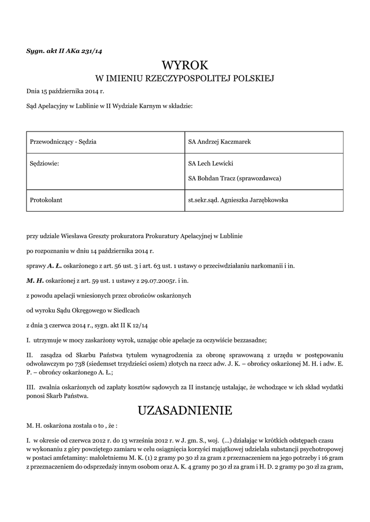 Sygn. akt II AKa 231/14 WYROK W IMIENIU RZECZYPOSPOLITEJ POLSKIEJ Dnia 15 października 2014 r. Sąd Apelacyjny w Lublinie w II Wydziale Karnym w składzie: Przewodniczący - Sędzia SA Andrzej Kaczmarek Sędziowie: SA Lech Lewicki SA Bohdan Tracz (sprawozdawca) Protokolant st.sekr.sąd. Agnieszka Jarzębkowska przy udziale Wiesława Greszty prokuratora Prokuratury Apelacyjnej w Lublinie po rozpoznaniu w dniu 14 października 2014 r. sprawy A. Ł. oskarżonego z art. 56 ust. 3 i art. 63 ust. 1 ustawy o przeciwdziałaniu narkomanii i in. M. H. oskarżonej z art. 59 ust. 1 ustawy z 29.07.2005r. i in. z powodu apelacji wniesionych przez obrońców oskarżonych od wyroku Sądu Okręgowego w Siedlcach z dnia 3 czerwca 2014 r., sygn. akt II K 12/14 I. utrzymuje w mocy zaskarżony wyrok, uznając obie apelacje za oczywiście bezzasadne; II. zasądza od Skarbu Państwa tytułem wynagrodzenia za obronę sprawowaną z urzędu w postępowaniu odwoławczym po 738 (siedemset trzydzieści osiem) złotych na rzecz adw. J. K. – obrońcy oskarżonej M. H. i adw. E. P. – obrońcy oskarżonego A. Ł.; III. zwalnia oskarżonych od zapłaty kosztów sądowych za II instancję ustalając, że wchodzące w ich skład wydatki ponosi Skarb Państwa. UZASADNIENIE M. H. oskarżona została o to , że : I. w okresie od czerwca 2012 r. do 13 września 2012 r. w J. gm. S., woj. (...) działając w krótkich odstępach czasu w wykonaniu z góry powziętego zamiaru w celu osiągnięcia korzyści majątkowej udzielała substancji psychotropowej w postaci amfetaminy: małoletniemu M. K. (1) 2 gramy po 30 zł za gram z przeznaczeniem na jego potrzeby i 16 gram z przeznaczeniem do odsprzedaży innym osobom oraz A. K. 4 gramy po 30 zł za gram i H. D. 2 gramy po 30 zł za gram, tj. o czyn z art. 59 ust. 1 ustawy z dnia 29.07.2005 r. o przeciwdziałaniu narkomanii (Dz. U. 124 z 2012 r. t. j.) w zb. z art. 59 ust. 2 ustawy (…) w zb. z art. 58 ust. 2 ustawy (…) w zw. z art. 12 kk w zw. z art. 11§2 kk II. w okresie od czerwca 2012 r. do 13 września 2012 r. w J. gm. S. woj. (...) wbrew przepisom ustawy posiadała znaczną ilość substancji psychotropowej w postaci amfetaminy o wadze nie mniejszej niż 132,73 grama oraz środek odurzający w postaci konopi innych niż włókniste tj. o czyn z art. 62 ust. 2 ustawy z dnia 29.07.2005 r. o przeciwdziałaniu narkomanii (Dz. U. 124 z 2012 r. t. j.) III. w okresie od lipca 2012 r. do 13 września 2012 r. w J. gm. S. woj. (...) wbrew przepisom ustawy działając wspólnie i w porozumieniu z ustaloną osobą uprawiała konopie inne niż włókniste w ilości 6 roślin tj. o czyn z art. 63 ust. 1 ustawy z dnia 29.07.2005 r. o przeciwdziałaniu narkomanii (Dz. U. 124 z 2012 r. t. j.) A. Ł. oskarżony został o to, że: IV. w okresie od czerwca 2012 r. do 13 września 2012 r. w J. gm. S. pow. (...) woj. (...) wbrew przepisom ustawy wprowadzał do obrotu znaczną ilość substancji psychotropowej w postaci amfetaminy o wadze około 100 gram tj. o czyn z art. 56 ust. 3 ustawy z 29 lipca 2005 r. o przeciwdziałaniu narkomanii (t. j. Dz. U. 124 z 2012 r.) V. w okresie od lipca 2012 r. do 13 września 2012 r. w J. gm. S. pow. (...) woj. (...) wbrew przepisom ustawy wspólnie i w porozumieniu z ustaloną osobą uprawiał konopie inne niż włókniste w ilości 5 sztuk roślin tj. o czyn z art. 63 ust. 1 ustawy z 29 lipca 2005 r. o przeciwdziałaniu narkomanii (t. j. Dz. U. 124 z 2012 r.) M. K. (1) oskarżony został o to, że: VI. w okresie od czerwca 2012 r. do 13 września 2012 r. w S. woj. (...) działając w krótkich odstępach czasu, w wykonaniu z góry powziętego zamiaru, w celu osiągnięcia korzyści majątkowej udzielił substancji psychotropowej w postaci amfetaminy następującym osobom: - A. S., W. K. i M. K. (2) częstując ich a następnie 4-krotnie sprzedając im w ilości łącznie 16 gram amfetaminy po 30 zł za gram; oraz udzielał środka odurzającego w postaci konopi innych niż włókniste - P. S., A. S. częstując ich kilka razy tzw. marihuaną, tj. o czyn z art. 59 ust. 1 ustawy z dnia 29.07.2005 r. o przeciwdziałaniu narkomanii (Dz. U. 124 z 2012 r. t. j.) w zb. z art. 58 ust. 1 ustawy (…) w zw. z art. 11§2 kk w zw. z art. 12 kk Sąd Okręgowy w Siedlcach wyrokiem z dnia 3 czerwca 2014 roku I. oskarżoną M. H. uznał za winną tego, że w okresie od około połowy lipca 2012 r. do 13 września 2012 r. w J. gm. S., woj. (...) działając w krótkich odstępach czasu w wykonaniu z góry powziętego zamiaru w celu osiągnięcia korzyści majątkowej udzieliła substancji psychotropowej w postaci amfetaminy małoletniemu M. K. (1) w łącznej ilości 18 g po 30 zł za gram oraz A. K. w łącznej ilości 4 g po 30 zł za gram, co stanowi zbrodnię z art. 59 ust. 1 w zb. z art. 59 ust. 2 ustawy z dnia 29 lipca 2005 roku o przeciwdziałaniu narkomanii (j.t. Dz. U. 124 z 2012 r. ze zm.) w zw. z art. 11 § 2 kk w zw. z art. 12 kk i za czyn ten na podstawie tych przepisów skazał ją i na podstawie art. 59 ust. 2 cyt. ustawy o przeciwdziałaniu narkomanii w zw. z art. 11 § 3 kk wymierzył jej karę 3 (trzech) lat pozbawienia wolności; II. na podstawie art. 45 § 1 kk w związku z tym czynem orzekł wobec niej środek karny przepadku korzyści majątkowej w kwocie 660 (sześćset sześćdziesiąt) złotych; III. oskarżoną M. H. w ramach czynu, zarzuconego jej w pkt II uznał za winną tego, że w okresie od około połowy lipca 2012 r. do 13 września 2012 r. w J. gm. S. woj. (...) wbrew przepisom ustawy posiadała znaczną ilość substancji psychotropowej w postaci amfetaminy o wadze 90 g, co stanowi występek z art. 62 ust. 2 ustawy z dnia 29 lipca 2005 roku o przeciwdziałaniu narkomanii (j.t. Dz. U. 124 z 2012 r. ze zm.) i za czyn ten na podstawie tego przepisu skazał ją i wymierzył jej karę 1 (jednego) roku i 6 (sześciu) miesięcy pozbawienia wolności; IV. oskarżoną M. H. uniewinnił od popełnienia czynu, zarzuconego jej w pkt III stwierdzają