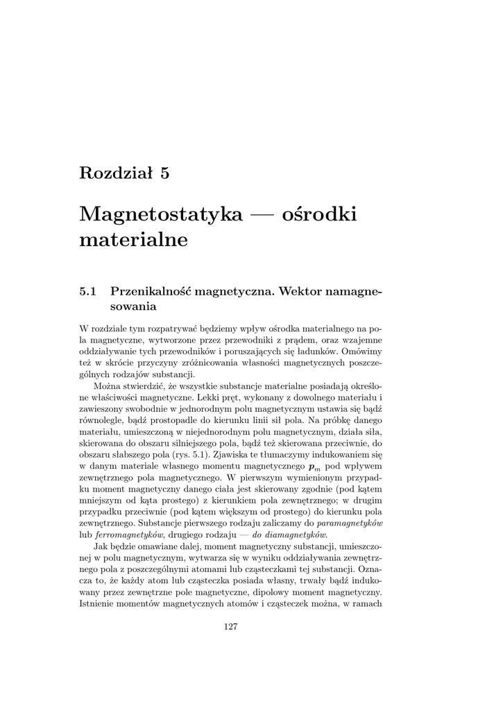 Rozdział 5 Magnetostatyka — ośrodki materialne 5.1 Przenikalność magnetyczna. Wektor namagnesowania W rozdziale tym rozpatrywać będziemy wpływ ośrodka materialnego na pola magnetyczne, wytworzone przez przewodniki z prądem, oraz wzajemne oddziaływanie tych przewodników i poruszających się ładunków. Omówimy też w skrócie przyczyny zróżnicowania własności magnetycznych poszczególnych rodzajów substancji. Można stwierdzić, że wszystkie substancje materialne posiadają określone właściwości magnetyczne. Lekki pręt, wykonany z dowolnego materiału i zawieszony swobodnie w jednorodnym polu magnetycznym ustawia się bądź równolegle, bądź prostopadle do kierunku linii sił pola. Na próbkę danego materiału, umieszczoną w niejednorodnym polu magnetycznym, działa siła, skierowana do obszaru silniejszego pola, bądź też skierowana przeciwnie, do obszaru słabszego pola (rys. 5.1). Zjawiska te tłumaczymy indukowaniem się w danym materiale własnego momentu magnetycznego pm pod wpływem zewnętrznego pola magnetycznego. W pierwszym wymienionym przypadku moment magnetyczny danego ciała jest skierowany zgodnie (pod kątem mniejszym od kąta prostego) z kierunkiem pola zewnętrznego; w drugim przypadku przeciwnie (pod kątem większym od prostego) do kierunku pola zewnętrznego. Substancje pierwszego rodzaju zaliczamy do paramagnetyków lub ferromagnetyków, drugiego rodzaju — do diamagnetyków. Jak będzie omawiane dalej, moment magnetyczny substancji, umieszczonej w polu magnetycznym, wytwarza się w wyniku oddziaływania zewnętrznego pola z poszczególnymi atomami lub cząsteczkami tej substancji. Oznacza to, że każdy atom lub cząsteczka posiada własny, trwały bądź indukowany przez zewnętrzne pole magnetyczne, dipolowy moment magnetyczny. Istnienie momentów magnetycznych atomów i cząsteczek można, w ramach 127 128 Magnetostatyka — ośrodki materialne Rysunek 5.1: półklasycznej teorii Bohra, tłumaczyć ruchem elektronów po zamkniętych orbitach wokół jąder atomów. Tego rodzaju ruch elektronu jest równoważny zamkniętemu obwodowi z prądem, który posiada określony moment magnetyczny. Takie mikroprądy, płynące w atomach lub cząsteczkach, nazywamy prądami molekularnymi. Hipotezę istnienia prądów molekularnych wysunął po raz pierwszy w XIX wieku A. Ampère. Można stwierdzić, że wartość indukcji pola magnetycznego, wytworzonego w danym punkcie przestrzeni przez przewodnik z prądem lub trwały magnes zależy, przy niezmienionych innych warunkach, od rodzaju ośrodka. Związek między wartością indukcji pola magnetycznego B w danej substancji i indukcji pola magnetycznego B 0 w próżni ma postać: B = µB 0 . (5.1) gdzie współczynnik µ nazywa się względną przenikalnością magnetyczną substancji i charakteryzuje jej własności magnetyczne. Podany wzór jest spełniony z dobrą dokładnością w przypadku paramagnetyków i diamagnetyków. W przypadku ferromagnetyków związek między B i B 0 nie jest, ściśle mówiąc, jednoznaczny. Dla paramagnetyków wartość µ jest nieco większa od jedności, dla diamagnetyków nieco mniejsza od jedności. Można przyjąć umownie, że w przypadku ferromagnetyków µ 1. Wygodniej jest posługiwać się, zamiast przenikalności magnetycznej, pojęciem podatności magnetycznej χm danej substancji, zdefiniowanej zależnością: χm = µ − 1. (5.2) Wówczas dla paramagnetyków χm > 0, dla diamagnetyków χm < 0, przy czym w obu przypadkach |χm | 1. Przenikalność magnetyczna. Wektor namagnesowania 129 Ze względu na małe wartości podatności para- i diamagnetyków pomiar tej wielkości na podstawie wartości pola magnetycznego, wytworzonego np. przez przewodnik z prądem, umieszczony w dany ośrodku, byłby bardzo kłopotliwy. W praktyce wyznacza się podatność magnetyczną danego materiału, mierząc siłę, działającą na wykonaną z niego próbkę umieszczoną w polu magnetycznym. Jeżeli ciało o momencie dipolowym pm jest umieszczone w niejednorodnym polu magnetycznym to, jak można prosto wykazać, działa nań siła: F = pm dB . dx (5.3) Natomiast indukowany przez zewnętrzne pole moment magnetyczny próbki, mającej kształt kulki o promieniu r, jest równy: pm = χm V B 4πχm r3 B = , µ0 µ 3µ0 µ (5.4) gdzie V jest objętością kulki (wzór ten wynika ze wzorów, podanych dalej w tym i następnym podrozdziałach). Powyższe wzory umożliwiają wyznaczenie podatności magnetycznej danego materiału. Zmiana wartości indukcji pola magnetycznego w ośrodku materialnym w porównaniu z jej wartością w próżni w przypadku gdy źródło pola magnetycznego, np. przewodnik z prądem, pozostaje niezmienione, tłumaczy się uporządkowaniem kierunków momentów dipolowych atomów lub cząsteczek ośrodka i wytworzeniem w nim własnego pola magnetycznego. Pod wpływem zewnętrznego pola powstaje określone namagnesowanie ośrodka, analogicznie do polaryzacji dielektryków w polu elektrycznym. Podamy obecnie bardziej szczegółowy opis tego zjawiska. Rysunek 5.2: 130 Magnetostatyka — ośrodki materialne Rysunek 5.3: Załóżmy, że w obszar jednorodnego zewnętrznego pola magnetycznego o indukcji B 0 został wprowadzony paramagnetyk (w przypadku diamagnetyka zmieni się kierunek momentów magnetycznych atomów; podane wzory pozostaną słuszne). Przyjmiemy, że ma on kształt kołowego walca o przekroju S i długości l (rys. 5.2). Powstające w paramagnetyku wewnętrzne pole magnetyczne B 0 , związane z uporządkowaniem momentów magnetycznych jego atomów wzdłuż linii sił zewnętrznego pola, sumuje się z zewnętrznym polem magnetycznym B 0 , dając wypadkowe pole B: B = B0 + B0. (5.5) W dowolnym przekroju S walca, prostopadłym do jego osi, wszystkie prądy molekularne kompensują się wzajemnie. Wyjątek stanowią prądy płynące po powierzchni walca (rys. 5.3). Wytwarzają one wewnątrz walca pole, którego indukcję magnetyczną B 0 można o