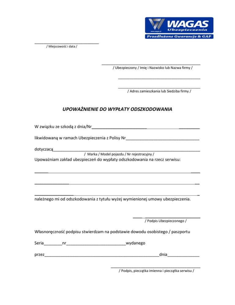 ____________________________ / Miejscowość i data / ___________________________________________ / Ubezpieczony / Imię i Nazwisko lub Nazwa firmy / ___________________________________________ ___________________________________________ / Adres zamieszkania lub Siedziba firmy / UPOWAŻNIENIE DO WYPŁATY ODSZKODOWANIA W związku ze szkodą z dnia/Nr________________________ _________ likwidowaną w ramach Ubezpieczenia z Polisy Nr________________________________ dotyczacą________________________________________________________________ / Marka / Model pojazdu / Nr rejestracyjny / Upoważniam zakład ubezpieczeń do wypłaty odszkodowania na rzecz serwisu: ______ ____ _______________ __ _________________ należnego mi od odszkodowania z tytułu wyżej wymienionej umowy ubezpieczenia. _ ____ ________________________ / Podpis Ubezpieczonego / Własnoręczność podpisu stwierdzam na podstawie dowodu osobistego / paszportu Seria________nr__________________________wydanego przez__________________________________________________dnia______________ _______________________________________ / Podpis, pieczątka imienna i pieczątka serwisu /
