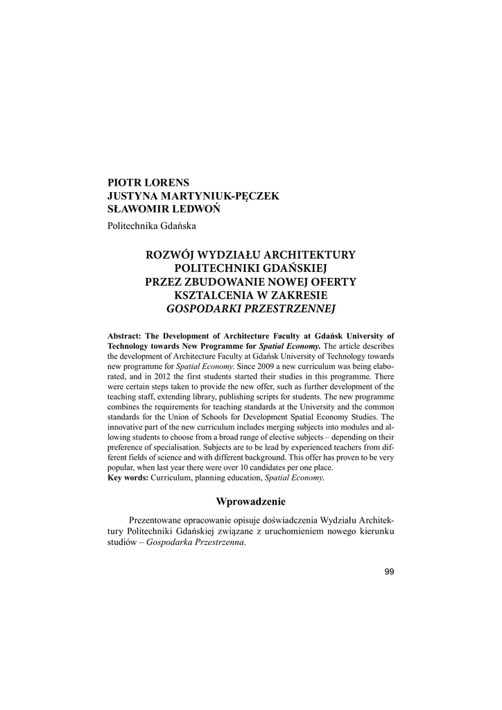 PIOTR LORENS JUSTYNA MARTYNIUK-PĘCZEK SŁAWOMIR LEDWOŃ Politechnika Gdańska ROZWÓJ WYDZIAŁU ARCHITEKTURY POLITECHNIKI GDAŃSKIEJ PRZEZ ZBUDOWANIE NOWEJ OFERTY KSZTALCENIA W ZAKRESIE GOSPODARKI PRZESTRZENNEJ Abstract: The Development of Architecture Faculty at Gdańsk University of Technology towards New Programme for Spatial Economy. The article describes the development of Architecture Faculty at Gdańsk University of Technology towards new programme for Spatial Economy. Since 2009 a new curriculum was being elaborated, and in 2012 the first students started their studies in this programme. There were certain steps taken to provide the new offer, such as further development of the teaching staff, extending library, publishing scripts for students. The new programme combines the requirements for teaching standards at the University and the common standards for the Union of Schools for Development Spatial Economy Studies. The innovative part of the new curriculum includes merging subjects into modules and allowing students to choose from a broad range of elective subjects – depending on their preference of specialisation. Subjects are to be lead by experienced teachers from different fields of science and with different background. This offer has proven to be very popular, when last year there were over 10 candidates per one place. Key words: Curriculum, planning education, Spatial Economy. Wprowadzenie Prezentowane opracowanie opisuje doświadczenia Wydziału Architektury Politechniki Gdańskiej związane z uruchomieniem nowego kierunku studiów – Gospodarka Przestrzenna. 99 Do przygotowania programu kierunku Gospodarka Przestrzenna bezpośrednio przyczynił się projekt „Rozwój Wydziału Architektury Politechniki Gdańskiej poprzez zbudowanie nowej oferty kształcenia w zakresie gospodarki przestrzennej”. Projekt ten jest realizowany w ramach Programu Operacyjnego Kapitał Ludzki (Priorytet IV, Działanie 4.1, Poddziałanie 4.1.1 „Wzmocnienie potencjału dydaktycznego uczelni”, Numer konkursu 2/ POKL/4.1.1/2008) od 01 stycznia 2009 do 31 grudnia 2014 r. Jest on współfinansowany przez Unię Europejską w ramach Europejskiego Funduszu Społecznego na podstawie umowy o dofinansowanie nr: UDA-POKL 04.01.0100-237/08-00 z 27.03.2009. Najważniejszymi osobami zaangażowanymi w zarządzenie projektem są Główny Koordynator dr hab. inż. arch. Piotr Lorens, prof. PG oraz Koordynator pomocniczy – dr inż. arch. Justyna Martyniuk-Pęczek. W skład zespołu administracyjnego wchodzą także Wojciech Nowik, Michał Ajdacki i Marzena Stosik. 1. Najważniejsze działania Głównym celem przedsięwzięcia jest rozwój Wydziału Architektury przez wielopłaszczyznowe kształcenie w szeroko rozumianym temacie planowania i gospodarki przestrzennej zarówno na poziomie inżynieryjnym, jak i magisterskim (I i II stopień). Odpowiedzią na potrzeby płynące z rynku jest również dodatkowo zaplanowany II stopień nowego kierunku prowadzony w całości w języku angielskim co jest przedsięwzięciem unikatowym na skalę Europy Środkowo-Wschodniej. Dodatkowo w ramach Projektu zostaną uruchomione nowe kierunki studiów podyplomowych. Studenci otrzymają ofertę praktyk i staży oraz możliwość skorzystania z zajęć wyrównawczych z matematyki. Odbiorcami rezultatów Projektu będą również nauczyciele akademiccy, którzy dzięki kursom, szkoleniom, konferencjom i stażom w najlepszych ośrodkach światowych podniosą jakość swojego warsztatu dydaktycznego i naukowego. Główne cele projektu to: 1. Opracowanie nowego kierunku studiów dziennych inżynierskich i magisterskich Gospodarka Przestrzenna. 2. Opracowanie i uruchomienie studiów podyplomowych „Rewitalizacja architektoniczno-urbanistyczna obszarów miejskich” oraz „Zarządzanie rozwojem przestrzennym miast”. 3. Przeszkolenie w ramach studiów podyplomowych 300 osób. 100 4. Zapewnienie studentom studiów dziennych 3-miesięcznych staży. 5. Podniesienie umiejętności dydaktycznych nauczycieli akademickich w tematyce nowo opracowywanych kierunków. Ponadto, projekt przyczyni się do: 1. Doposażenia biblioteki w fachową literaturę przez zakup ponad 500 pozycji książkowych. 2. Wydanie 6 skryptów na temat współczesnej urbanistyki, które będą dostępne za darmo dla uczestników studiów. Dotychczas wydano pod redakcją Lorensa i Martyniuk-Pęczek cztery skrypty: Wybrane zagadnienia rewitalizacji miast, Wybrane zagadnienia przestrzeni publicznych, Zarządzanie rozwojem przestrzennym miast oraz Planowanie i realizacja przedsięwzięć urbanistycznych. Zgodnie z założeniami projektu, jego beneficjentami mają być: 1. W zakresie przygotowywanego nowego kierunku studiów I stopnia odbiorcami ostatecznymi będą absolwenci szkół ponadgimnazjalnych oraz studenci, którzy ukończyli lub studiują inny kierunek studiów. 2. Odbiorcami studiów magisterskich (II stopnia) w języku angielskim będą głównie absolwenci studiów geograficznych, ekonomicznych, architektonicznych i innych inżynierskich I stopnia. 3. Beneficjentami studiów podyplomowych będą przede wszystkim absolwenci studiów architektonicznych zainteresowanych wykonywaniem zawodu urbanisty (samorządowcy, przedstawiciele sektora prywatnego itp.). 4. W zakresie 3-miesięcznych staży odbiorcami będą studenci studiów dziennych. 5. Kadra dydaktyczna Wydziału Architektury weźmie udział w realizacji kursów, szkoleń oraz wyjazdów studialnych. W efekcie powyższych działań, w roku akademickim 2012/2013 na Wydziale Architektury Politechniki Gdańskiej został otwarty kierunek studiów Gospodarka Przestrzenna. 2. Opis programu studiów na kierunku Gospodarka Przestrzenna 2.1. Podstawy – założenia Szczegółowy program studiów był przygotowywany przez zespół od 2010 r., a następnie przeprojektowany w ok. sześć miesięcy w latach 2011 i 2012. Pierwotna wersja programu bazowała na standardach kształcenia, wy101 nikających z Rozp