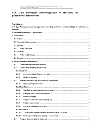 PROGRAM FUNKCJONALNO-UŻYTKOWY „MODERNIZACJA ZAKŁADU PRODUKCJI WODY W TYM: - ZMIANA NAPOWIETRZANIA (AERATORY) - MODERNIZACJA FILTRÓW PODWÓJNA FILTRACJA, LAMPA UV ORAZ ZASILANIE ENERGETYCZNE WRAZ ZE STEROWANIEM” II-A. Opis Wymagań zamawiającego w stosunku do przedmiotu zamówienia Spis treści II-A. Opis Wymagań zamawiającego w stosunku do przedmiotu zamówienia Błąd! Nie zdefiniowano zakładki. 1 Podstawowe założenia i wymagania .................................................................................................. 3 2 Zakres robót ......................................................................................................................................... 3 2.1 Projekt ........................................................................................................................................... 3 2.2 Pozostała Dokumentacja .............................................................................................................. 3 2.3 Budowa ......................................................................................................................................... 4 2.4 Próby Końcowe ....................................................................................................................... 4 2.5 Szkolenie ....................................................................................................................................... 4 2.6 Próby eksploatacyjne ............................................................................................................. 4 2.7 Serwis ............................................................................................................................................ 4 3 Wymagania dla projektowania ........................................................................................................... 5 3.1 Zakres dokumentacji projektowej ......................................................................................... 5 3.2 Format dokumentacji projektowej ........................................................................................ 5 3.2.1 Wydruki .................................................................................................................................. 5 3.2.2. Dokumentacja w formie cyfrowej .................................................................................. 6 3.2.3. Liczba egzemplarzy ......................................................................................................... 6 3.3 Wymagania dotyczące dokumentacji projektowej ............................................................... 6 3.3.1. Wymagania podstawowe ............................................................................................... 6 3.3.2 Projektanci ............................................................................................................................. 7 3.3.3. Trwałość projektowanych elementów........................................................................... 7 3.3.4. Inwentaryzacja stanu istniejącego ................................................................................. 7 3.3.5. Projekt wstępny .............................................................................................................. 7 3.3.6. Projekt budowlany (Jeśli wymagany) ............................................................................ 8 3.3.7. Projekt wykonawczy ....................................................................................................... 8 3.3.8. Dokumentacja powykonawcza .................................................................................... 11 3.3.9 Instrukcje ............................................................................................................................. 11 3.3.9.1. Dokumentacje Techniczno - Ruchowe (DTR) Urządzeń ........................................... 11 3.3.9.2 Instrukcje obsługi, eksploatacji i konserwacji .............................................................. 11 3.4 Przegląd dokumentacji projektowej .................................................................................... 13 1 PROGRAM FUNKCJONALNO-UŻYTKOWY „MODERNIZACJA ZAKŁADU PRODUKCJI WODY W TYM: - ZMIANA NAPOWIETRZANIA (AERATORY) - MODERNIZACJA FILTRÓW PODWÓJNA FILTRACJA, LAMPA UV ORAZ ZASILANIE ENERGETYCZNE WRAZ ZE STEROWANIEM” 3.5 Nadzory autorskie ................................................................................................................. 13 3.6 Przepisy związane ................................................................................................................. 13 4 Wymagania dla rozwiązań techniczno-technologicznych ................................................................ 13 4.1 Zabudowa i zagospodarowanie terenu................................................................................ 13 4.2 Obiekty inżynieryjno-technologiczne................................................................................... 13 4.3 Budynki ....................................................................................................................................... 14 4.3.1. Instalacje wodociągowe zimnej i ciepłej wody ............................................................ 14 4.3.2. Kanalizacja ściekowa i deszczowa ................................................................................ 15 4.3.3. Instalacja ogrzewcza ..................................................................................................... 15 4.3.4. Wentylacja .......................................................................................................................... 15 4.3.5. Osuszanie powietrza........................................................................................................... 15 4.4 5 Wymagania w zakresie bezpieczeństwa obiektów ............................................................. 16 Wymagania dla ro