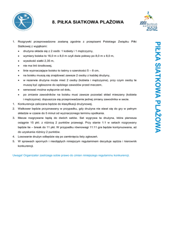 8. PIŁKA SIATKOWA PLAŻOWA Siatkowej z wyjątkami: drużyna składa się z 2 osób: 1 kobiety i 1 mężczyzny, wymiary boiska to 16,0 m x 8,0 m czyli dwie połowy po 8,0 m x 8,0 m, wysokość siatki 2,35 m, nie ma linii środkowej, linie wyznaczające boisko to taśmy o szerokości 5 – 8 cm, na boisku muszą się znajdować zawsze 2 osoby z każdej drużyny, w rezerwie drużyna może mieć 2 osoby (kobieta i mężczyzna), przy czym osoby te muszą być zgłoszone do sędziego zawodów przed meczem, serwować można wyłącznie od dołu, po zmianie zawodników na boisku musi zawsze pozostać skład mieszany (kobieta i mężczyzna); dopuszcza się przeprowadzenie jednej zmiany zawodnika w secie. 1. Konkurencja zaliczana będzie do klasyfikacji drużynowej. 2. Walkower będzie przyznawany w przypadku, gdy drużyna nie stawi się do gry w pełnym składzie w czasie do 5 minut od wyznaczonego terminu spotkania. 3. Mecze rozgrywane będą do dwóch setów. Set wygrywa ta drużyna, która pierwsza osiągnie 15 pkt. z różnicą 2 punktów przewagi. Przy stanie 1:1 w setach rozgrywany będzie tie – break do 11 pkt. W przypadku równowagi 11:11 gra będzie kontynuowana, aż do uzyskania różnicy 2 punktów. 4. Losowanie drużyn odbędzie się po zamknięciu listy zgłoszeń. 5. W sprawach spornych i nieobjętych niniejszym regulaminem decyduje sędzia i kierownik konkurencji. Uwaga! Organizator zastrzega sobie prawo do zmian niniejszego regulaminu konkurencji. PIŁKA SIATKOWA PLAŻOWA 1. Rozgrywki przeprowadzone zostaną zgodnie z przepisami Polskiego Związku Piłki