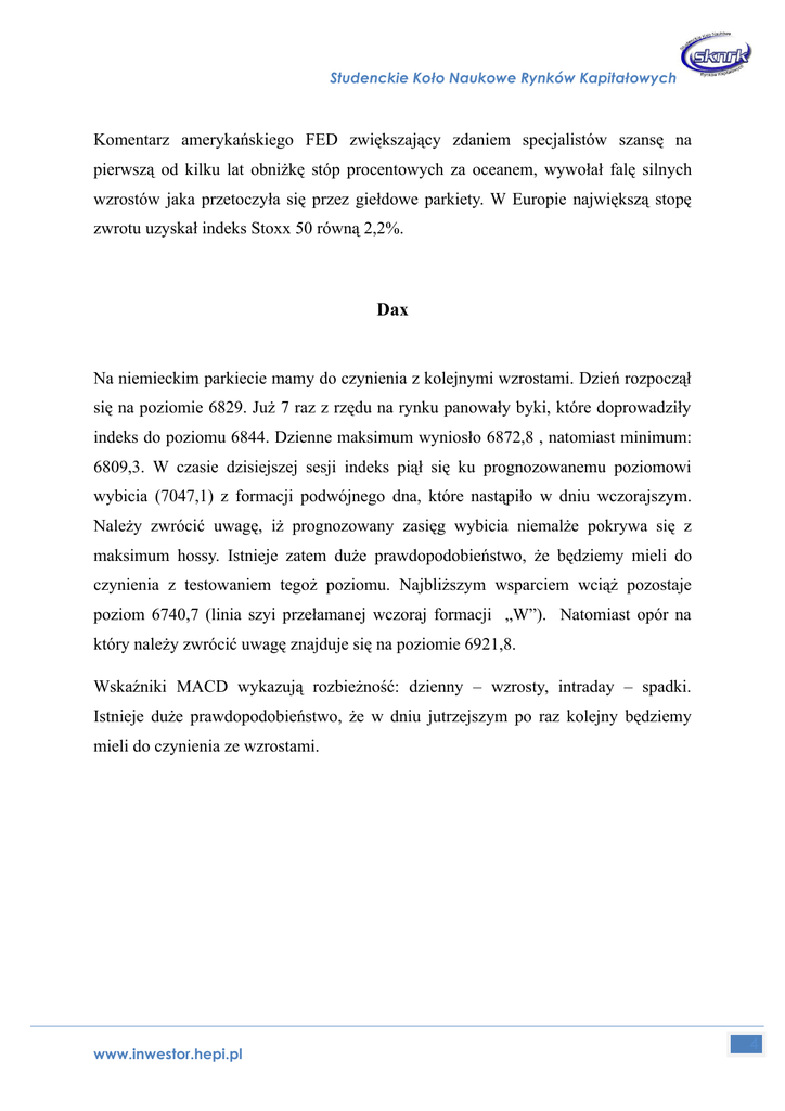 Studenckie Koło Naukowe Rynków Kapitałowych Komentarz amerykańskiego FED zwiększający zdaniem specjalistów szansę na pierwszą od kilku lat obniżkę stóp procentowych za oceanem, wywołał falę silnych wzrostów jaka przetoczyła się przez giełdowe parkiety. W Europie największą stopę zwrotu uzyskał indeks Stoxx 50 równą 2,2%. Dax Na niemieckim parkiecie mamy do czynienia z kolejnymi wzrostami. Dzień rozpoczął się na poziomie 6829. Już 7 raz z rzędu na rynku panowały byki, które doprowadziły indeks do poziomu 6844. Dzienne maksimum wyniosło 6872,8 , natomiast minimum: 6809,3. W czasie dzisiejszej sesji indeks piął się ku prognozowanemu poziomowi wybicia (7047,1) z formacji podwójnego dna, które nastąpiło w dniu wczorajszym. Należy zwrócić uwagę, iż prognozowany zasięg wybicia niemalże pokrywa się z maksimum hossy. Istnieje zatem duże prawdopodobieństwo, że będziemy mieli do czynienia z testowaniem tegoż poziomu. Najbliższym wsparciem wciąż pozostaje poziom 6740,7 (linia szyi przełamanej wczoraj formacji „W”). Natomiast opór na który należy zwrócić uwagę znajduje się na poziomie 6921,8. Wskaźniki MACD wykazują rozbieżność: dzienny – wzrosty, intraday – spadki. Istnieje duże prawdopodobieństwo, że w dniu jutrzejszym po raz kolejny będziemy mieli do czynienia ze wzrostami. www.inwestor.hepi.pl 4 Studenckie Koło Naukowe Rynków Kapitałowych www.inwestor.hepi.pl 4 Studenckie Koło Naukowe Rynków Kapitałowych Stoxx50 W dniu dzisiejszym w Eurolandzie miało miejsce ogłoszenie danych dotyczących zamówień przemysłowych. Informacje, które dotarły świadczą o panującej tam dobrej koniunkturze, a mianowicie dynamika zamówień w przemyśle wyniosła 12% i okazała się wyższa od prognozy (10,1%). Zapewne przyczyniło się to do dzisiejszych wzrostów. Indeks 50 największych spółek Europy rozpoczął dzień 57 punktów powyżej ceny zamknięcia z dnia wczorajszego (z poziomu 4144,5) tworząc bardzo dużą luke wzrostową. Sesję rozpoczął ponad ważnym poziomem oporu z dnia wczorajszego 4109,5 i do końca dnia popyt utrzymał go ponad nim. Opór ten okazał się równocześnie linią szyi ukształtowanej w ostatnim czasie formacji podwójnego dna. Prognozowany minimalny zasięg wybicia z ukształtowanej dzisiaj formacji podwójnego dna wynosi 191,7 punkty (do poziomu 4301,2). Należy jednakże nadal mieć na uwadze poziom 4109,5 który w czasie jutrzejszych notowań będzie bardzo ważnym wsparciem dla indeksu. Na rynku zwyciężyły byki odnotowując zwyżki a tym samym kontynuując dobrą passę z ubiegłego tygodnia. Ostatecznie indeks zatrzymał się na poziomie 4167,5. Stopa zwrotu wyniosła aż 2,2 %, zatem był to bardzo udany dzień dla inwestorów. Wskaźniki MACD wykazują zbieżność: wzrosty. Istnieje duże prawdopodobieństwo, że w dniu jutrzejszym indeks nadal będzie zwyżkował zbliżając się do średnioterminowej linii trendu wzrostowego, która została przełamana pod koniec lutego. W czasie jutrzejszych notowań szczególną uwagę należy zwrócić na poziom 4079,4 (który jest początkiem drugiej luki wzrostowej), który będzie dla nas bardzo ważnym wsparciem. www.inwestor.hepi.pl 4 Studenckie Koło Naukowe Rynków Kapitałowych Formacja podwójnego dna jest formacją odwrócenia trendu spadkowego na wzrostowy, która została opisana we wczorajszym komentarzu. www.inwestor.hepi.pl 4 Studenckie Koło Naukowe Rynków Kapitałowych Obligacje: dane z godziny 20:00 Dzisiejszy dzień na rynku obligacji upłynął pod znakiem zwyżek rentowności. W przypadku bonu skarbowego o 3 miesięcznym terminie wykupu spadek nastąpił o 13 punktów bazowych w stosunku do sytuacji w ubiegłym miesiącu. Jeśli chodzi o poziom dochodowości w dniu dzisiejszym: dochodowość wzrosła o 9 punktów bazowych w stosunku do dnia wczorajszego, co ostudziło zapał inwestorów liczących na dalsze spadki ich rentowności. Największy spadek rentowności zanotowano na obligacjach o dwuletnim terminie wykupu – wyniósł on 23 punkty bazowe w stosunku do sytuacji jaka miała miejsce w ubiegłym miesiącu. Z kolei porównując rentowność w dniu dzisiejszym z wczorajszą zanotowany został jej wzrost 6 punktów bazowych. www.inwestor.hepi.pl 4 Studenckie Koło Naukowe Rynków Kapitałowych Drugimi, co do atrakcyjności obligacjami są te o 3 letnim terminie wykupu. Zanotowano w ich przypadku spadek rentowności o 21 punktów bazowych w stosunku do ostatniego miesiąca. Od dnia wczorajszego również nastąpił wzrost ich rentowności o 5 punktów bazowych. Obligacje 10-cio letnie również od miesiąca odnotowywały spadki dochodowości. Wyjątek stanowi dzień dzisiejszy, kiedy to nastąpił wzrost ich dochodowości o 5 punktów bazowych. Graficzny obraz danych tabelarycznych przedstawiają poniższe wykresy: www.inwestor.hepi.pl 4 Studenckie Koło Naukowe Rynków Kapitałowych www.inwestor.hepi.pl 4 Studenckie Koło Naukowe Rynków Kapitałowych Obserwując krzywą dochodowości w dalszym ciągu zauważalne jest jej opadanie. Na całej krzywej dochodowości zauważalny jest skokowy wzrost dochodowości, który zapewne spowodowany jest dyskontowaniem wczorajszej decyzji FED w sprawie pozostawienia krótkoterminowej stopy procentowej w USA na dotychczasowym poziomie (5,25%). Do najbardziej atrakcyjnych obligacji nadal należą te z przedziału 2 – 5 lat, gdzie od pewnego czasu odnotowuje się największe spadki ich rentowności (23 punktowy spadek - obligacje 2 letnie, 21 punktowy spadek – obligacje 3 letnie oraz 18 punktowy spadek – obligacje 5 letnie). www.inwestor.hepi.pl 4 Studenckie Koło Naukowe Rynków Kapitałowych Kontrakty terminowe FRA 11x12 dane z godziny 20:30 Krótkoterminowa stopa procentowa wynosząca obecnie w USA 525 punktów bazowych jest wyższa od kontraktów terminowych FRA 11x12 w dniu dzisiejszym o 51 punkty bazowe. Oznacza to korzystną sytuację dla tych, którzy zarabiają