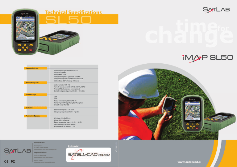 Dane techniczne System operacyjny: Windows CE 6.0 Procesor: 833 Mhz Pamięć RAM : 1 GB Pamięć wewnętrzna typu Flash : 512 MB Pamięć zewnętrzna: karta MicroSD do 32 GB Wyświetlacz : 3.5’’ kolorowy, dotykowy Wewnętrzny GPS Liczba kanałów GPS - 12 Formaty poprawek SBAS (WAAS, EGNOS, MSAS) Antena GPS wbudowana (wewnętrzna) Dokładność pozycji punktu (SBAS) : 1-5 metrów Komunikacja USB Wi-Fi Moduł wewnętrzny GSM/GPRS 3G Gniazdo karty MicroSD Zasilanie Bateria wewnętrzna 7.4V Li-on Czas pracy na jednej baterii > 7 godzin Wymiary : 14 x 8 x 3.5 cm Waga : 360 g (z baterią) Zakres temperatur pracy : -10 C0 - + 60 C0 Pyłoszczelność i wodoszczelność Wytrzymałość na upadek : 1.5 m Datavägen 21B SE-436 32 ASKIM,SWEDEN [email protected] | www.satlabgps.com Dystrybutor www.satellcad.pl Headquarters: Jičín, CZECH REPUBLIC [email protected] | www.satlab.cz Ankara, TURKEY [email protected] | www.satlab.com.tr www.satellcad.pl