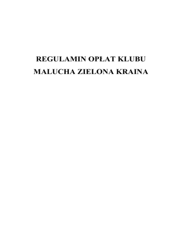 REGULAMIN OPŁAT KLUBU MALUCHA ZIELONA KRAINA OPŁATY Z TYTUŁU CZESNEGO §1 Pobyt Dziecka w Klubie Malucha jest odpłatny. §2 Przyjęcie dzieci do Klubu Malucha Zielona Kraina odbywa się na podstawie złożonych dokumentów rekrutacyjnych oraz wpłacie wpisowego w wysokości 500 zł (słownie: pięćset złotych 00/100). §3 Płatności w Klubie Malucha Zielona Kraina dokonuje się w oparciu o następujące pakiety godzinowe, które należy zadeklarować w Umowie przyjęcia dziecka do Klubu Malucha Zielona Kraina: 1. W grupie żłobkowej: - pakiet brązowy – 120 godzin w miesiącu kalendarzowym (okresie rozliczeniowym) w kwocie 1000 zł (słownie: tysiąc złotych 00/100) bez wyżywienia; - pakiet srebrny – 160 godzin w miesiącu kalendarzowym w kwocie 1200 zł (słownie: tysiąc dwieście złotych 00/100) bez wyżywienia; - pakiet złoty – pakiet nielimitowany godzinowo w miesiącu kalendarzowym w kwocie 1400 zł (słownie: tysiąc czterysta złotych) bez wyżywienia. 2. W grupie przedszkolnej: - pakiet przedszkolny – pobyt dziecka do godz. 18.00 w kwocie 1500 zł (słownie: tysiąc pięćset złotych 00/100) bez wyżywienia. * Pakiety obowiązują w godzinach pracy placówki tj. od 7.00 do 18.00. §4 Jeden okres rozliczeniowy równy jest jednemu miesiącu kalendarzowemu. §5 Zmiany pakietu można dokonać wyłącznie w formie pisemnej. §6 1. W przypadku przekroczenia w danym miesiącu (okresie rozliczeniowym) ilości godzin wykupionego pakietu należy dopłacić kwotę wyrównującą, odpowiadającą poszczególnym pakietom w zależności od ilości wykorzystanych godzin. 2. W przypadku niewykorzystania godzin z danego pakietu Klub Malucha Zielona Kraina NIE zwraca kwoty za niewykorzystane godziny. 3. Niewykorzystane godziny NIE przechodzą na poczet kolejnego miesiąca (okresu rozliczeniowego). §7 W ramach opłaty – czesnego Klub Malucha zapewnia: 1. Całodzienną opiekę w godz. 7.00 - 18.00 w zależności od wybranego pakietu 2. Ubezpieczenie NNW. 3. Realizację programu opiekuńczo-wychowawczo-dydaktycznego Klubu Malucha Zielona Kraina. 4. Opiekę psychologa i logopedy. 5. Pomoce dydaktyczne, plastyczne, techniczne. 6. Środki czystości, artykuły higieniczne (mokre chusteczki – PAMPERS), kremy pielęgnacyjne zgodnie ze wskazówkami Rodziców, pastę do zębów dla każdego dziecka). 7. Świeżą pościel (każde Dziecko otrzymuje swój zestaw pościeli oraz swoje łóżko). 8. Nocniczki. 9. Organizację imprez okolicznościowych, dni tematycznych, spotkań z ciekawymi ludźmi, wycieczki (w grupie przedszkolnej). §8 1. W przypadku ponad 10-dniowej nieobecności dziecka w Klubie Malucha, w danym okresie rozliczeniowym, spowodowanej chorobą oraz poświadczonej zaświadczeniem lekarskim, czesne wynosi 80% czesnego podstawowego zadeklarowanego w umowie (nieobecność dotyczy następujących po sobie kolejno dni roboczych w danym okresie rozliczeniowym. Za okres rozliczeniowy rozumie się okres od pierwszego do ostatniego dnia danego miesiąca). 2. W przypadku nieobecności dziecka powyżej 1-go miesiąca kalendarzowego czesne wynosi 50% czesnego podstawowego zadeklarowanego w umowie. Zgłoszenia nieobecności należy dokonać w formie pisemnej minimum 1 miesiąc wcześniej przed planowaną nieobecnością. §9 1. Opłat z tytułu czesnego należy dokonywać do 5 dnia każdego miesiąca (okresu rozliczeniowego) przelewem na konto: Bank Zachodni WBK S.A. 53 1090 1870 0000 0001 2953 9362 Tytułem: „Imię i nazwisko dziecka – czesne za miesiąc/rok” 2. Za termin zapłaty uważa się datę wpływu środków na powyższy rachunek bankowy. OPŁATY Z TYTUŁU WYŻYWIENIA § 10 1. Klub Malucha zapewnia dodatkowo płatnych 5 posiłków dziennie: śniadanie, przekąskę, dwudaniowy obiad (zupę, II danie), podwieczorek. 2. Wysokość opłat poszczególnych posiłków przedstawia się następująco: - śniadanie – 3 zł; - dwudaniowy obiad – 8 zł; - jedno danie (zupa lub II danie) – 5,50 zł; - podwieczorek – 3 zł; - stawka żywieniowa za cały dzień – 14 zł. 3. Przekąski w postaci owoców/warzyw podawane są dzieciom na koszt Klubu Malucha Zielona Kraina. § 11 1. Wysokość kwoty wyżywienia w danym miesiącu (okresie rozliczeniowym) wyliczana jest na podstawie wykorzystanych posiłków w danym miesiącu i płatna jest pod koniec miesiąca, którego dotyczy. § 12 1. Opłat z tytułu wyżywienia należy dokonywać do 05 dnia każdego miesiąca (okresu rozliczeniowego) wraz z czesnym za dany miesiąc (okres rozliczeniowy) przelewem na konto: Bank Zachodni WBK S.A. 53 1090 1870 0000 0001 2953 9362 Tytułem: „Imię i nazwisko dziecka – wyżywienie za miesiąc/rok” 2. Za termin zapłaty uważa się datę wpływu środków na powyższy rachunek bankowy. § 13 W razie planowej nieobecności dziecka w Klubie Malucha Rodzic jest zobowiązany powiadomić nauczyciela/opiekuna do godz. 8.50. W przypadku uprzedniego zgłoszenia nieobecności dziecka w Klubie Malucha rodzicom/opiekunom przysługuje zwrot stawki żywieniowej za każdy dzień nieobecności (o ile dziecko korzysta z wyżywienia zapewnianego przez Klub Malucha). § 14 Chęć wykupienia obiadów oraz podwieczorków należy potwierdzić drogą telefoniczną/smsową, mailową bądź osobiście do godziny 8.50, natomiast śniadania do godziny 18.00 dzień wcześniej.