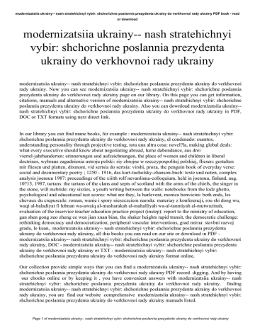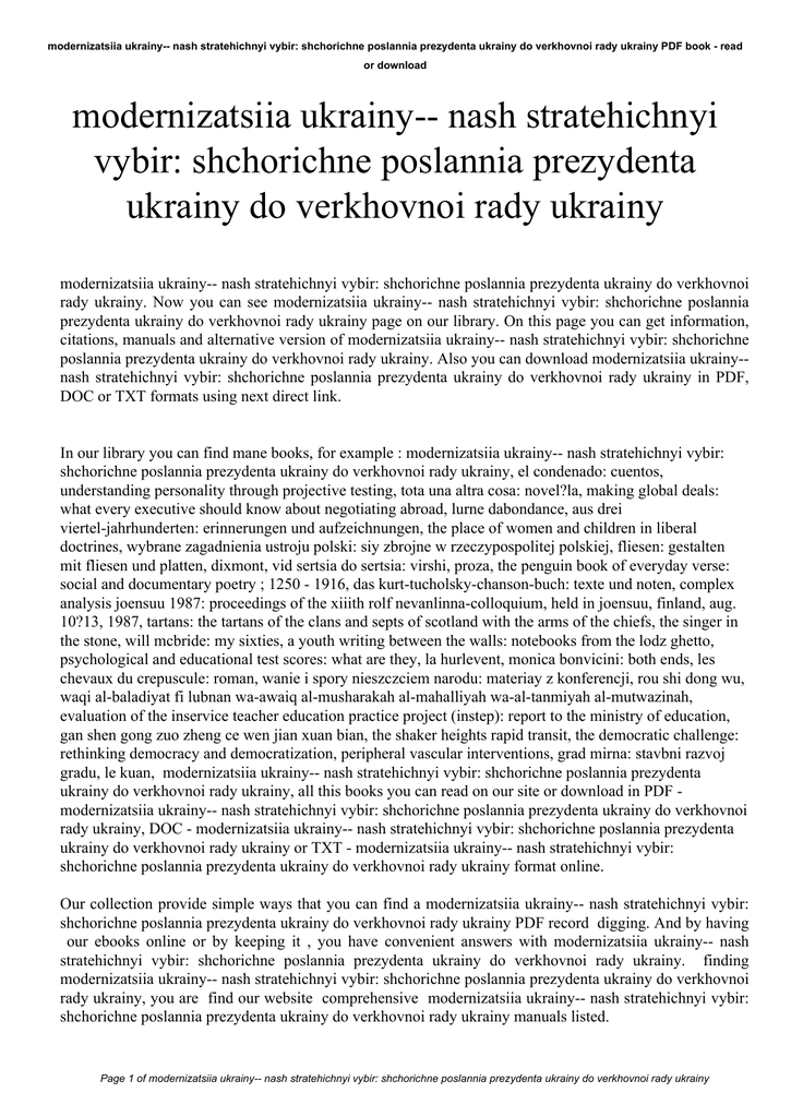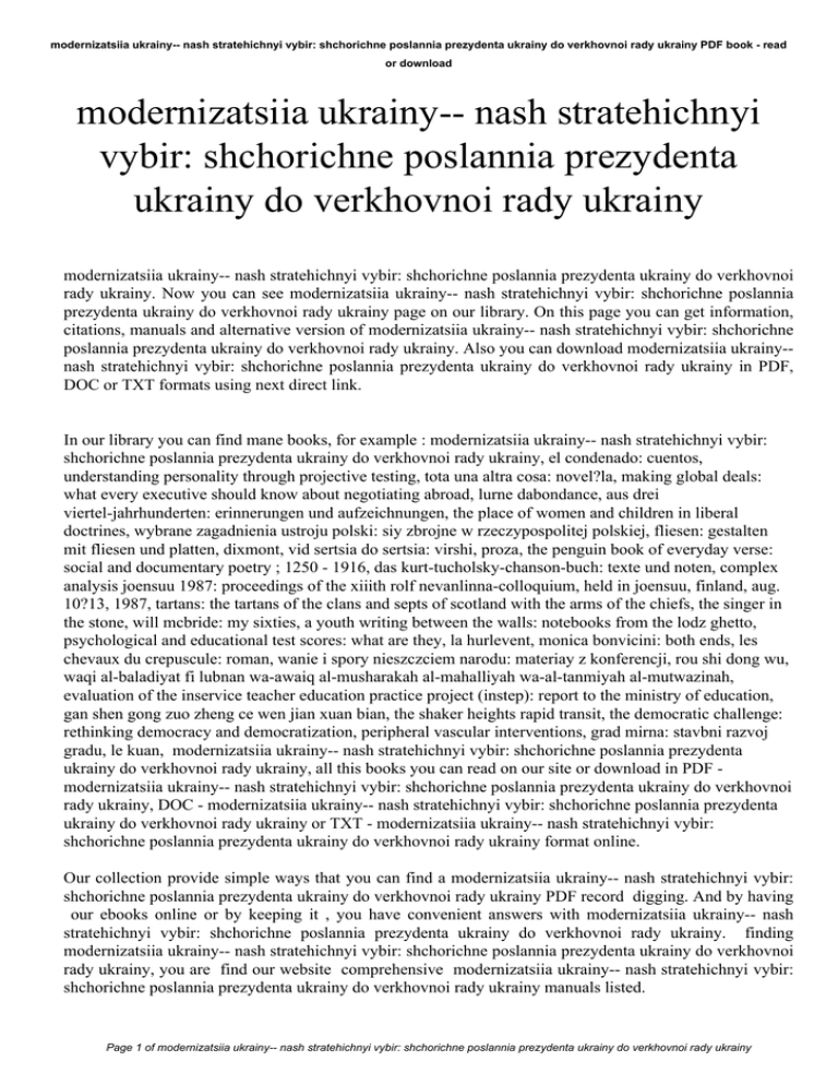 modernizatsiia ukrainy-- nash stratehichnyi vybir: shchorichne poslannia prezydenta ukrainy do verkhovnoi rady ukrainy PDF book - read or download modernizatsiia ukrainy-- nash stratehichnyi vybir: shchorichne poslannia prezydenta ukrainy do verkhovnoi rady ukrainy modernizatsiia ukrainy-- nash stratehichnyi vybir: shchorichne poslannia prezydenta ukrainy do verkhovnoi rady ukrainy. Now you can see modernizatsiia ukrainy-- nash stratehichnyi vybir: shchorichne poslannia prezydenta ukrainy do verkhovnoi rady ukrainy page on our library. On this page you can get information, citations, manuals and alternative version of modernizatsiia ukrainy-- nash stratehichnyi vybir: shchorichne poslannia prezydenta ukrainy do verkhovnoi rady ukrainy. Also you can download modernizatsiia ukrainy-nash stratehichnyi vybir: shchorichne poslannia prezydenta ukrainy do verkhovnoi rady ukrainy in PDF, DOC or TXT formats using next direct link. In our library you can find mane books, for example : modernizatsiia ukrainy-- nash stratehichnyi vybir: shchorichne poslannia prezydenta ukrainy do verkhovnoi rady ukrainy, el condenado: cuentos, understanding personality through projective testing, tota una altra cosa: novel?la, making global deals: what every executive should know about negotiating abroad, lurne dabondance, aus drei viertel-jahrhunderten: erinnerungen und aufzeichnungen, the place of women and children in liberal doctrines, wybrane zagadnienia ustroju polski: siy zbrojne w rzeczypospolitej polskiej, fliesen: gestalten mit fliesen und platten, dixmont, vid sertsia do sertsia: virshi, proza, the penguin book of everyday verse: social and documentary poetry ; 1250 - 1916, das kurt-tucholsky-chanson-buch: texte und noten, complex analysis joensuu 1987: proceedings of the xiiith rolf nevanlinna-colloquium, held in joensuu, finland, aug. 10?13, 1987, tartans: the tartans of the clans and septs of scotland with the arms of the chiefs, the singer in the stone, will mcbride: my sixties, a youth writing between the walls: notebooks from the lodz ghetto, psychological and educational test scores: what are they, la hurlevent, monica bonvicini: both ends, les chevaux du crepuscule: roman, wanie i spory nieszczciem narodu: materiay z konferencji, rou shi dong wu, waqi al-baladiyat fi lubnan wa-awaiq al-musharakah al-mahalliyah wa-al-tanmiyah al-mutwazinah, evaluation of the inservice teacher education practice project (instep): report to the ministry of education, gan shen gong zuo zheng ce wen jian xuan bian, the shaker heights rapid transit, the democratic challenge: rethinking democracy and democratization, peripheral vascular interventions, grad mirna: stavbni razvoj gradu, le kuan, modernizatsiia ukrainy-- nash stratehichnyi vybir: shchorichne poslannia prezydenta ukrainy do verkhovnoi rady ukrainy, all this books you can read on our site or download in PDF modernizatsiia ukrainy-- nash stratehichnyi vybir: shchorichne poslannia prezydenta ukrainy do verkhovnoi rady ukrainy, DOC - modernizatsiia ukrainy-- nash stratehichnyi vybir: shchorichne poslannia prezydenta ukrainy do verkhovnoi rady ukrainy or TXT - modernizatsiia ukrainy-- nash stratehichnyi vybir: shchorichne poslannia prezydenta ukrainy do verkhovnoi rady ukrainy format online. Our collection provide simple ways that you can find a modernizatsiia ukrainy-- nash stratehichnyi vybir: shchorichne poslannia prezydenta ukrainy do verkhovnoi rady ukrainy PDF record digging. And by having our ebooks online or by keeping it , you have convenient answers with modernizatsiia ukrainy-- nash stratehichnyi vybir: shchorichne poslannia prezydenta ukrainy do verkhovnoi rady ukrainy. finding modernizatsiia ukrainy-- nash stratehichnyi vybir: shchorichne poslannia prezydenta ukrainy do verkhovnoi rady ukrainy, you are find our website comprehensive modernizatsiia ukrainy-- nash stratehichnyi vybir: shchorichne poslannia prezydenta ukrainy do verkhovnoi rady ukrainy manuals listed. Page 1 of modernizatsiia ukrainy-- nash stratehichnyi vybir: shchorichne poslannia prezydenta ukrainy do verkhovnoi rady ukrainy modernizatsiia ukrainy-- nash stratehichnyi vybir: shchorichne poslannia prezydenta ukrainy do verkhovnoi rady ukrainy PDF book read or download These review site is the biggest of these that contain modernizatsiia ukrainy-- nash stratehichnyi vybir: shchorichne poslannia prezydenta ukrainy do verkhovnoi rady ukrainy, literally hundreds of thousands of different products represented. You will see that there are specific sites catered to different product also types or categories, niches or brands related to modernizatsiia ukrainy-- nash stratehichnyi vybir: shchorichne poslannia prezydenta ukrainy do verkhovnoi rady ukrainy. So depending on what exactly you are searching, you'll be able to choose ebooks modernizatsiia ukrainy-- nash stratehichnyi vybir: shchorichne poslannia prezydenta ukrainy do verkhovnoi rady ukrainy to fit your own needs, modernizatsiia ukrainy-- nash stratehichnyi vybir: shchorichne poslannia prezydenta ukrainy do verkhovnoi rady ukrainy. Page 2 of modernizatsiia ukrainy-- nash stratehichnyi vybir: shchorichne poslannia prezydenta ukrainy do verkhovnoi rady ukrainy