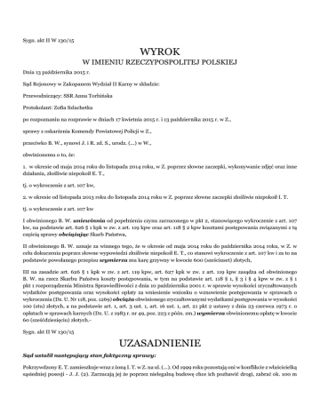 Sygn. akt II W 130/15 WYROK W IMIENIU RZECZYPOSPOLITEJ POLSKIEJ Dnia 13 października 2015 r. Sąd Rejonowy w Zakopanem Wydział II Karny w składzie: Przewodniczący: SSR Anna Torbińska Protokolant: Zofia Szlachetka po rozpoznaniu na rozprawie w dniach 17 kwietnia 2015 r. i 13 października 2015 r. w Z., sprawy z oskarżenia Komendy Powiatowej Policji w Z., przeciwko B. W., synowi J. i R. zd. S., urodz. (...) w W., obwinionemu o to, że: 1. w okresie od maja 2014 roku do listopada 2014 roku, w Z. poprzez słowne zaczepki, wykonywanie zdjęć oraz inne działania, złośliwie niepokoił E. T., tj. o wykroczenie z art. 107 kw, 2. w okresie od listopada 2013 roku do listopada 2014 roku w Z. poprzez słowne zaczepki złośliwie niepokoił I. T. tj. o wykroczenie z art. 107 kw I obwinionego B. W. uniewinnia od popełnienia czynu zarzuconego w pkt 2, stanowiącego wykroczenie z art. 107 kw, na podstawie art. 626 § 1 kpk w zw. z art. 119 kpw oraz art. 118 § 2 kpw kosztami postępowania związanymi z tą częścią sprawy obciążając Skarb Państwa, II obwinionego B. W. uznaje za winnego tego, że w okresie od maja 2014 roku do października 2014 roku, w Z. w celu dokuczenia poprzez słowne wypowiedzi złośliwie niepokoił E. T., co stanowi wykroczenie z art. 107 kw i za to na podstawie powołanego przepisu wymierza mu karę grzywny w kwocie 600 (sześciuset) złotych, III na zasadzie art. 626 § 1 kpk w zw. z art. 119 kpw, art. 627 kpk w zw. z art. 119 kpw zasądza od obwinionego B. W. na rzecz Skarbu Państwa koszty postępowania, w tym na podstawie art. 118 § 1, § 3 i § 4 kpw w zw. z § 1 pkt 1 rozporządzenia Ministra Sprawiedliwości z dnia 10 października 2001 r. w sprawie wysokości zryczałtowanych wydatków postępowania oraz wysokości opłaty za wniesienie wniosku o wznowienie postępowania w sprawach o wykroczenia (Dz. U. Nr 118, poz. 1269) obciąża obwinionego zryczałtowanymi wydatkami postępowania w wysokości 100 (stu) złotych, a na podstawie art. 1, art. 3 ust. 1, art. 16 ust. 1, art. 21 pkt 2 ustawy z dnia 23 czerwca 1973 r. o opłatach w sprawach karnych (Dz. U. z 1983 r. nr 49, poz. 223 z późn. zm.) wymierza obwinionemu opłatę w kwocie 60 (sześćdziesięciu) złotych.Sygn. akt II W 130/15 UZASADNIENIE Sąd ustalił następujący stan faktyczny sprawy: Pokrzywdzony E. T. zamieszkuje wraz z żoną I. T. w Z. na ul. (...). Od 1999 roku pozostają oni w konflikcie z właścicielką sąsiedniej posesji - J. J. (2). Zarzucają jej że poprzez nielegalną budowę chce ich pozbawić drogi, zabrać ok. 100 m należącego do nich terenu, burzy ich ogrodzenie. Rezultatem tego konfliktu są kolejne sprawy sądowe, których ilość według E. T. sięga już kilkudziesięciu. Obwiniony B. W. oraz jego żona M. W. pozostają w bardzo dobrych relacjach z J. J. (2), wedle jakiej są „przyjaciółmi domu”. B. W. często ją odwiedza, wstępuje do niej po odwiezieniu syna do szkoły, doradza przy budowie, a gdy ta przebywa poza Z. dogląda jej nieruchomości - ma klucze od bramy. W okresie ostatnich lat, w tym od maja 2014r. do października 2014r., kiedy to doszło do zgłoszenia zawiadomienia o popełnionym wykroczeniu, po jakim nie miały już miejsca podobne zdarzenia, obwiniony widząc E. T. zaczepiał go, co jakiś czas, zwracając się do niego słowami „kogo dzisiaj zakapowałeś”, „idziesz znowu kogoś zakapować”. Pokrzywdzony zaczepiany był tymi słowami gdy szedł w kierunku swego domu, na moście przy ul. (...) i gdy znajdował się na swojej posesji. Na przełomie maja i czerwca 2014 r. udał się do Urzędu Miasta Z.. Gdy wychodził z budynku spotkał obwinionego B. W. - ten spytał „znowu byłeś kogoś zakapować”. W dniu 25 września 2014 r. E. T. był na ul. (...) w Z., w siedzibie straży miejskiej. Wychodząc stamtąd zauważył obwinionego, który w okolice znajdującego się naprzeciwko sądu przyjechał samochodem marki M.. Ten wysiadł z auta, szybkim krokiem podszedł do niego i zwrócił się słowami „byłeś znowu kogoś zakapować”. Powiedział mu, by przestał go zaczepiać - zrobił to na tyle głośno, że słyszała go osoba sprzedająca w pobliskim kiosku, do którego szedł kupić gazety. W dniu 27 września 2014r., w godzinach południowych pokrzywdzony E. T. wrócił do domu. W tym czasie na sąsiedniej posesji przebywali J. J. (2) oraz B. W.. Obwiniony na widok pokrzywdzonego podszedł do ogrodzenia i zaczął robić miny - wykrzywiać twarz, wykonywać ruchy ramionami. W pewnym momencie zwracając się do J. J. (2) spytał „czy słyszałaś co on powiedział”, na co ta odparła „tak słyszałam i wszystko potwierdzę w sądzie”, mimo że E. T. niczego nie mówił. W październiku 2014r., podczas zajścia związanego z budową muru przez J. J. (2) w poprzek ulicy, obecny na miejscu obwiniony aparatem fotograficznym otrzymanym od J. J. (2) wykonywał zdjęcia. Aparat kierował w stronę gdzie stał E. T.. Gdy wszyscy się rozjechali zwrócił się do niego słowami „będziesz siedział” (dowód: zeznania świadków E. T. - k. 36-37, I. T. - k. 37-39, E. K. - k. 39-40 i Z. H. - k. 66-67, częściowo J. J. (2) - k. 59-60 oraz częściowo wyjaśnienia obwinionego B. W. - k. 34-35) Obwiniony B. W. wyrokiem Sądu Rejonowego w Zakopanem z dnia 20 maja 2014 r. - sygn. II W 1749/13, który uprawomocnił się z dniem 26 sierpnia 2014r. został skazany za wykroczenie z art. 107 kw - złośliwie niepokojenie w celu dokuczenia K. D. i W. D., na karę grzywny w kwocie 500 zł. B. W. nie leczy się psychiatrycznie, ani neurologicznie. Posiada wyuczony zawód inżyniera. Pozostaje na emeryturze - pobiera świadczenia emerytalne w kwocie około 1.100 zł brutto miesięcznie. Jest właścicielem mieszkania usytuowanego w W., którego - jak podał - obecnie nie wynajmuje. Odmówił podania swego stanu majątkowego. Jego żona M. W. prowadzi szkołę językową. Wynajmuje należące do niej dwa apartamenty usytuowane w Z.. N