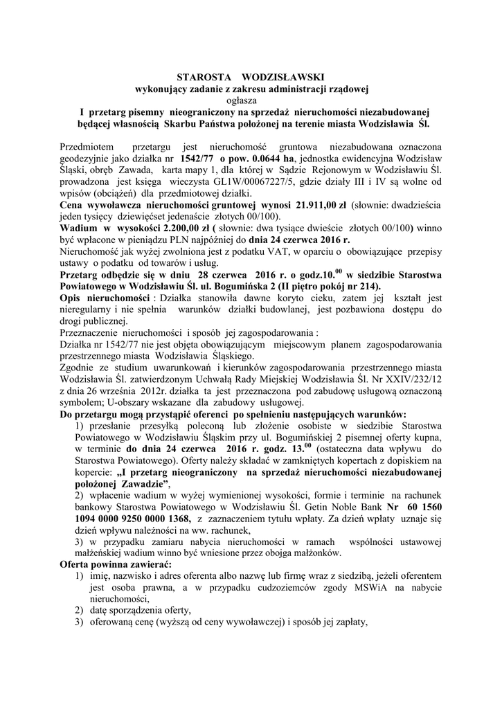 STAROSTA WODZISŁAWSKI wykonujący zadanie z zakresu administracji rządowej ogłasza I przetarg pisemny nieograniczony na sprzedaż nieruchomości niezabudowanej będącej własnością Skarbu Państwa położonej na terenie miasta Wodzisławia Śl. Przedmiotem przetargu jest nieruchomość gruntowa niezabudowana oznaczona geodezyjnie jako działka nr 1542/77 o pow. 0.0644 ha, jednostka ewidencyjna Wodzisław Śląski, obręb Zawada, karta mapy 1, dla której w Sądzie Rejonowym w Wodzisławiu Śl. prowadzona jest księga wieczysta GL1W/00067227/5, gdzie działy III i IV są wolne od wpisów (obciążeń) dla przedmiotowej działki. Cena wywoławcza nieruchomości gruntowej wynosi 21.911,00 zł (słownie: dwadzieścia jeden tysięcy dziewięćset jedenaście złotych 00/100). Wadium w wysokości 2.200,00 zł ( słownie: dwa tysiące dwieście złotych 00/100) winno być wpłacone w pieniądzu PLN najpóźniej do dnia 24 czerwca 2016 r. Nieruchomość jak wyżej zwolniona jest z podatku VAT, w oparciu o obowiązujące przepisy ustawy o podatku od towarów i usług. Przetarg odbędzie się w dniu 28 czerwca 2016 r. o godz.10.00 w siedzibie Starostwa Powiatowego w Wodzisławiu Śl. ul. Bogumińska 2 (II piętro pokój nr 214). Opis nieruchomości : Działka stanowiła dawne koryto cieku, zatem jej kształt jest nieregularny i nie spełnia warunków działki budowlanej, jest pozbawiona dostępu do drogi publicznej. Przeznaczenie nieruchomości i sposób jej zagospodarowania : Działka nr 1542/77 nie jest objęta obowiązującym miejscowym planem zagospodarowania przestrzennego miasta Wodzisławia Śląskiego. Zgodnie ze studium uwarunkowań i kierunków zagospodarowania przestrzennego miasta Wodzisławia Śl. zatwierdzonym Uchwałą Rady Miejskiej Wodzisławia Śl. Nr XXIV/232/12 z dnia 26 września 2012r. działka ta jest przeznaczona pod zabudowę usługową oznaczoną symbolem; U-obszary wskazane dla zabudowy usługowej. Do przetargu mogą przystąpić oferenci po spełnieniu następujących warunków: 1) przesłanie przesyłką poleconą lub złożenie osobiste w siedzibie Starostwa Powiatowego w Wodzisławiu Śląskim przy ul. Bogumińskiej 2 pisemnej oferty kupna, w terminie do dnia 24 czerwca 2016 r. godz. 13.00 (ostateczna data wpływu do Starostwa Powiatowego). Oferty należy składać w zamkniętych kopertach z dopiskiem na kopercie: „I przetarg nieograniczony na sprzedaż nieruchomości niezabudowanej położonej Zawadzie”, 2) wpłacenie wadium w wyżej wymienionej wysokości, formie i terminie na rachunek bankowy Starostwa Powiatowego w Wodzisławiu Śl. Getin Noble Bank Nr 60 1560 1094 0000 9250 0000 1368, z zaznaczeniem tytułu wpłaty. Za dzień wpłaty uznaje się dzień wpływu należności na ww. rachunek, 3) w przypadku zamiaru nabycia nieruchomości w ramach wspólności ustawowej małżeńskiej wadium winno być wniesione przez obojga małżonków. Oferta powinna zawierać: 1) imię, nazwisko i adres oferenta albo nazwę lub firmę wraz z siedzibą, jeżeli oferentem jest osoba prawna, a w przypadku cudzoziemców zgody MSWiA na nabycie nieruchomości, 2) datę sporządzenia oferty, 3) oferowaną cenę (wyższą od ceny wywoławczej) i sposób jej zapłaty, 4) kopię dowodu wniesienia wadium lub dowodu stanowiącego podstawę do zwolnienia z tego obowiązku, w przypadku osób wymienionych w §5 Rozporządzenia Rady Ministrów z dnia 14 września 2004 r. w sprawie sposobu i trybu przeprowadzania przetargów oraz rokowań na zbycie nieruchomości (Dz.U. Nr 207, poz. 2108, ze zm.), 5) numer rachunku bankowego oferenta, 6) podpis oferenta: - w przypadku osoby będącej w małżeńskiej wspólności majątkowej podpisy obydwu małżonków, - w przypadku osób prawnych podpisy osób reprezentujących, zgodnie z wpisem do właściwego rejestru, 7) zobowiązanie do pokrycia wszelkich opłat notarialnych i sądowych związanych z przeniesieniem prawa własności nieruchomości oraz zobowiązanie do zapłaty zaoferowanej ceny, pomniejszonej o wpłacone wadium, najpóźniej do dnia zawarcia umowy, 8) proponowany sposób zagospodarowania nieruchomości, 9) oświadczenie, że oferent zapoznał się z warunkami przetargu w ogłoszeniu i przyjmuje je bez zastrzeżeń. Zasady przeprowadzenia przetargu: 1) część jawna przetargu odbędzie się w dniu 28 czerwca 2016 r. o godz. 1000 w siedzibie Starostwa Powiatowego w Wodzisławiu Śl. przy ul. Bogumińskiej 2; o wyborze oferty lub zamknięciu przetargu bez dokonania wyboru oferty, uczestnicy zostaną powiadomieni w formie pisemnej, 2) oferty złożone po terminie lub brak w ofercie dowodu wpłaty wadium albo dowodu będącego podstawą do zwolnienia z tego obowiązku (zgodnie z zapisem pkt 4 zawartości oferty) nie będą rozpatrywane, 3) wadium przepada w razie uchylenia się oferenta, który przetarg wygrał, od zawarcia notarialnej umowy kupna na warunkach określonych w ofercie albo nie uiszczenia całości ceny przed zawarciem tejże umowy; wadium złożone przez oferentów, których oferty nie zostaną przyjęte, zostanie zwrócone w terminie 3 dni od dnia rozstrzygnięcia przetargu; oferentowi, którego oferta została przyjęta wadium zostanie zaliczone na poczet ceny nabycia. Miejsce wywieszenia i publikacji ogłoszenia: strona internetowa Starostwa www.powiatwodzislawski.pl; (ogłoszenia) i www.bip.powiatwodzislawski.pl (w zakładce komunikaty, ogłoszenia, obwieszczenia) oraz tablica ogłoszeń w siedzibie Starostwa Powiatowego w Wodzisławiu Śl. ul. Bogumińska 2 i Urzędu Miasta w Wodzisławiu Śl. Osoby zainteresowane mogą zapoznać się z informacjami o przedmiocie sprzedaży od poniedziałku do piątku w godz. od 8.00-14.00 osobiście w Wydziale Gospodarki Nieruchomościami Starostwa Powiatowego w Wodzisławiu Śląskim ul. Bogumińska 2 lub telefonicznie pod nr (32) 4539759. Zastrzega się prawo odwołania przetargu z ważnych powodów oraz zamknięcia przetargu bez wybrania którejkolwiek z ofert.