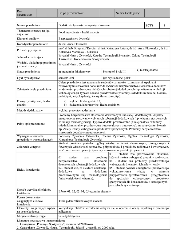 Rok akademicki: Grupa przedmiotów: Nazwa przedmiotu: Dodatki do żywności – aspekty zdrowotne Tłumaczenie nazwy na jęz. angielski: Kierunek studiów: Koordynator przedmiotu: Prowadzący zajęcia: Jednostka realizująca: Numer katalogowy: ECTS 1 Food ingredients – health aspects Bezpieczeństwo żywności dr inż. Anna Florowska prof. dr hab. Krzysztof Krygier, dr inż. Katarzyna Ratusz, dr inż. Anna Florowska , dr inż. Katarzyna Marciniak - Łukasiak Wydział Nauk o Żywności, Katedra Technologii Żywności, Zakład Technologii Tłuszczów i Koncentratów Spożywczych Wydział, dla którego przedmiot Wydział Nauk o Żywności jest realizowany: b) stopień I rok III c) niestacjonarne Status przedmiotu: a) przedmiot fakultatywny Cykl dydaktyczny: semestr letni jęz. wykładowy: polski Celem przedmiotu jest zapoznanie studentów z szeroko rozumianymi aspektami zdrowotnymi stosowania dodatków do żywności: bezpieczeństwo stosowania dodatków, właściwości prozdrowotne niektórych substancji dodatkowych (np. witaminy w funkcji technologicznej), typowe dodatki prozdrowotne (witaminy, składniki mineralne, błonnik, prebiotyki, antyoksydanty, kwasy tłuszczowe, itp.). Założenia i cele przedmiotu: Formy dydaktyczne, liczba godzin: Metody dydaktyczne: Pełny opis przedmiotu: Wymagania formalne (przedmioty wprowadzające): Założenia wstępne: Efekty kształcenia: a) wykład: liczba godzin 15; b) ćwiczenia laboratoryjne: liczba godzin 0; wykład, prezentacja, dyskusja Problemy bezpieczeństwa stosowania dozwolonych substancji dodatkowych. Aspekty prozdrowotne stosowanie wybranych substancji dodatkowych (np. witamin stosowanych w funkcji technologicznej). Typowe dodatki prozdrowotne (funkcjonalne): witaminy, składniki mineralne, prozdrowotne tłuszcze (kwasy tłuszczowe), antyoksydanty, błonnik itp. Zalety i wady wzbogacania produktów spożywczych. Problemy bezpieczeństwa stosowania dodatków prozdrowotnych. Podstawy Żywienia Człowieka, Chemia Żywności, Ogólna Technologia Żywności, Kierunkowe Technologie Żywności Student powinien posiadać ogólną wiedzę na temat chemicznych, biologicznych i fizycznych właściwości surowców, półproduktów i produktów roślinnych i zwierzęcych, znać podstawowe operacje i procesy stosowane w produkcji żywności 03 - student zna prozdrowotne składniki, 01 student zna problemy którymi można wzbogacać produkty spożywcze. bezpieczeństwa stosowania 04 - student zna problemy prozdrowotnego dozwolonych substancji dodatkowych. wzbogacania żywności, ich zalety i wady. 02 - student wie, że niektóre substancje 05 – student posiada umiejętności praktycznego dodatkowe są dodatkami wykorzystywania wiedzy w zakresie prozdrowotnymi (np. technologiczne przygotowania (przetwarzania i przygotowania funkcje niektórych witamin). do spożycia) wzbogaconych produktów spożywczych dla konsumentów o szczególnych potrzebach żywieniowych. Sposób weryfikacji efektów Efekty 01, 02, 03, 04, 05 egzamin pisemny kształcenia: Forma dokumentacji osiągniętych efektów Treść pytań zaliczeniowych z oceną kształcenia: Elementy i wagi mające wpływ Weryfikacja efektów kształcenia odbywa się w oparciu o ocenę uzyskaną z pisemnego na ocenę końcową: zaliczenia Miejsce realizacji zajęć: Sala dydaktyczna Literatura podstawowa i uzupełniająca: 1. Czasopismo „Przemysł Spożywczy”, roczniki od 2000 roku. 2. Czasopismo „Żywność. Nauka. Technologia. Jakość” , roczniki od 2000 roku. UWAGI: Dodaj tekst Wskaźniki ilościowe charakteryzujące moduł/przedmiot: Szacunkowa sumaryczna liczba godzin pracy studenta (kontaktowych i pracy własnej) niezbędna dla osiągnięcia zakładanych efektów kształcenia - na tej podstawie należy wypełnić pole ECTS: Łączna liczba punktów ECTS, którą student uzyskuje na zajęciach wymagających bezpośredniego udziału nauczycieli akademickich: Łączna liczba punktów ECTS, którą student uzyskuje w ramach zajęć o charakterze praktycznym, takich jak zajęcia laboratoryjne, projektowe, itp.: 25 h 1 ECTS 0 ECTS Tabela zgodności kierunkowych efektów kształcenia efektami przedmiotu: Nr /symbol efektu 01 02 03 04 05 Wymienione w wierszu efekty kształcenia: Student zna problemy bezpieczeństwa stosowania dozwolonych substancji dodatkowych. Student wie, że niektóre substancje dodatkowe są dodatkami prozdrowotnymi (np. technologiczne funkcje niektórych witamin). Student zna prozdrowotne składniki, którymi można wzbogacać produkty spożywcze. Student zna problemy prozdrowotnego wzbogacania żywności, ich zalety i wady. Student posiada umiejętności praktycznego wykorzystywania wiedzy w zakresie przygotowania (przetwarzania i przygotowania do spożycia) wzbogaconych produktów spożywczych dla konsumentów o szczególnych potrzebach żywieniowych. Odniesienie do efektów dla programu kształcenia na kierunku K_W04 K_U16 K_K01 K_W04 K_U16 K_K03 K_W04 K_U16 K_K01 K_W06 K_U17 K_K01 K_W06 K_U16 K_K03