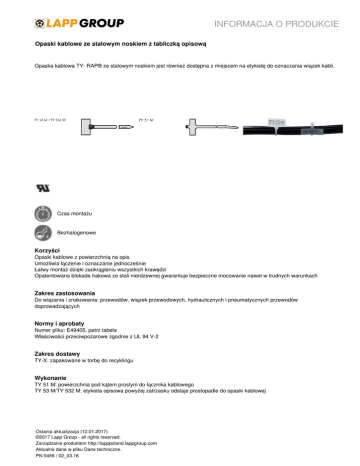 INFORMACJA O PRODUKCIE Opaski kablowe ze stalowym noskiem z tabliczką opisową Opaska kablowa TY- RAP® ze stalowym noskiem jest również dostępna z miejscem na etykietę do oznaczania wiązek kabli. Czas montażu Bezhalogenowe Korzyści Opaski kablowe z powierzchnią na opis Umożliwia łączenie i oznaczanie jednocześnie Łatwy montaż dzięki zaokrągleniu wszystkich krawędzi Opatentowana blokada hakowa ze stali nierdzewnej gwarantuje bezpieczne mocowanie nawet w trudnych warunkach Zakres zastosowania Do wiązania i znakowania: przewodów, wiązek przewodowych, hydraulicznych i pneumatycznych przewodów doprowadzających Normy i aprobaty Numer pliku: E49405, patrz tabela Właściwości przeciwpożarowe zgodnie z UL 94 V-2 Zakres dostawy TY-X: zapakowane w torbę do recyklingu Wykonanie TY 51 M: powierzchnia pod kątem prostym do łącznika kablowego TY 53 M/TY 532 M: etykieta opisowa powyżej zatrzasku odstaje prostopadle do opaski kablowej Ostania aktualizacja (12.01.2017) ©2017 Lapp Group - all rights reserved. Zarządzanie produktem http://lapppoland.lappgroup.com Aktualne dane w pliku Dane techniczne. PN 0456 / 02_03.16 INFORMACJA O PRODUKCIE Opaski kablowe ze stalowym noskiem z tabliczką opisową Dane techniczne Klasyfikacja: ETIM 5.0 Class-ID: EC000046 Opis klasy ETIM 5.0:Opaska kablowa Kolor: Kolory naturalne Materiał: Poliamid 6.6 Bezhalogenowy, bez silikonu Zakres temperatury: Od -40°C do +85°C Wskazówka TY-RAP® jest zastrzeżoną marką ABB Mniejsze opakowania na zamówienie Fotografie nie mogą być używane do wymiarowania oraz nie stanowią szczegółowego odwzorowania przedstawionych produktów. * Podane ceny to ceny netto bez podatku VAT i dodatkowych opłat. Sprzedaż klientom biznesowym. Ostania aktualizacja (12.01.2017) ©2017 Lapp Group - all rights reserved. Zarządzanie produktem http://lapppoland.lappgroup.com Aktualne dane w pliku Dane techniczne. PN 0456 / 02_03.16 Powered by TCPDF (www.tcpdf.org) Opis produktu Certyfikat UL Długość x szerokość [mm] Średnica wiązki [mm] Powierzchnia do opisu Wytrzymałość na rozciąganie [N] TY 51 M Tak 92 x 2,4 10 - 16 25 x 8 80 61715840 TY 46 MD Tak 184 x 4,8 9,5 - 45 30 x 24 220 Podwójny 61715880 TY 46 MT Tak 184 x 4,8 9,5 - 45 46 x 24 220 Potrójny 61715920 TY 46 MF Tak 184 x 4,8 9,5 - 45 63 x 24 220 Poczwórny 61715780 TY 546 M Tak 184 x 4,8 9,5 - 45 13 x 24 220 61715950 TY 548 M Tak 360 x 4,8 19 - 102 13 x 54 220 Etykieta prostopadła 61716020 Etykieta równoległa Etykieta odstająca prostopadle 61716080 TY 53 M Tak 102 x 2,4 2 - 16 21 x 9 80 61716560 TY 532 M Tak 212 x 2,4 2 - 51 21 x 9 80 Opaski kablowe ze stalowym noskiem z tabliczką opisową Ostania aktualizacja (12.01.2017) ©2017 Lapp Group - all rights reserved. Zarządzanie produktem http://lapppoland.lappgroup.com Aktualne dane w pliku Dane techniczne. PN 0456 / 02_03.16 INFORMACJA O PRODUKCIE Powered by TCPDF (www.tcpdf.org) Numer katalogowy