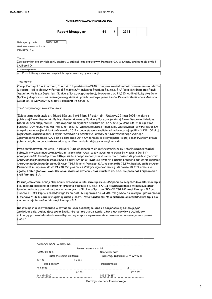 PAMAPOL S.A. RB 50 2015 KOMISJA NADZORU FINANSOWEGO Raport bieżący nr 50 / 2015 2015-10-12 Data sporządzenia: Skróc ona nazwa emitenta PAMAPOL S.A. Temat Zawiadomienie o zmniejszeniu udziału w ogólnej liczbie głosów w Pamapol S.A. w związku z rejestracją emisji akcji serii D Podstawa prawna Art. 70 pkt 1 Ustawy o oferc ie - nabyc ie lub zbycie znac znego pakietu akcji Treść raportu: Zarząd Pamapol S.A. informuje, że w dniu 12 października 2015 r. otrzymał zawiadomienie o zmniejszeniu udziału w ogólnej liczbie głosów w Pamapol S.A. przez Amerykanka Struktura Sp. z o.o. SKA (bezpośrednio) oraz Pawła Szataniak, Mariusza Szataniak i Struktura Sp. z o.o. (pośrednio), do poziomu do 71,33% ogólnej liczby głosów w Spółce tj. do poziomu wskazanego w wyjaśnieniu przedstawionym przez Panów Pawła Szataniak oraz Mariusza Szataniak, zacytowanym w raporcie bieżącym nr 38/2015. Treść otrzymanego zawiadomienia: "Działając na podstawie art. 69, art. 69a ust. 1 pkt 3 i art. 87 ust. 4 pkt 1 Ustawy z 29 lipca 2005 r. o ofercie publicznej Paweł Szataniak, Mariusz Szataniak wraz ze Struktura Sp. z o.o. (w której Paweł Szataniak i Mariusz Szataniak posiadają po 50% udziałów) oraz Amerykanka Struktura Sp. z o.o. SKA (w której Struktura Sp. z o.o. posiada 100% głosów na walnym zgromadzeniu) zawiadamiają o zmniejszeniu zaangażowania w Pamapol S.A. w wyniku rejestracji w dniu 9 października 2015 r. podwyższenia kapitału zakładowego tej spółki o 3.321.100 akcji zwykłych na okaziciela serii D, wyemitowanych na podstawie uchwały nr 5 Nadzwyczajnego Walnego Zgromadzenia Pamapol S.A. z dnia 5 listopada 2014 r. w ramach subskrypcji zamkniętej z zachowaniem prawa poboru dotychczasowych akcjonariuszy, w której zawiadamiający nie wzięli udziału. Przed zarejestrowaniem emisji akcji serii D (po dokonaniu w dniu 28 września 2015 r. zbycia wszystkich akcji nabytych w wezwaniu, o czym zawiadamiający informowali w zawiadomieniu z dnia 28 września 2015 r.) Amerykanka Struktura Sp. z o.o. SKA posiadała bezpośrednio, Struktura Sp. z o.o. posiadała pośrednio (poprzez Amerykanka Struktura Sp. z o.o. SKA), a Paweł Szataniak i Mariusz Szataniak łącznie posiadali pośrednio (poprzez Amerykanka Struktura Sp. z o.o. SKA) 24.786.750 akcji Pamapol S.A., co stanowiło 78,87% kapitału zakładowego Pamapol S.A. i uprawniało do 24.786.750 głosów na Walnym Zgromadzeniu tj. stanowiło 78,87% udziału w ogólnej liczbie głosów. Paweł Szataniak i Mariusz Szataniak oraz Struktura Sp. z o.o. nie posiadali bezpośrednio akcji Pamapol S.A. Po zarejestrowaniu emisji akcji serii D Amerykanka Struktura Sp. z o.o. SKA posiada bezpośrednio, Struktura Sp. z o.o. posiada pośrednio (poprzez Amerykanka Struktura Sp. z o.o. SKA), a Paweł Szataniak i Mariusz Szataniak łącznie posiadają pośrednio (poprzez Amerykanka Struktura Sp. z o.o. SKA) 24.786.750 akcji Pamapol S.A., co stanowi 71,33% kapitału zakładowego Pamapol S.A. i uprawnia do 24.786.750 głosów na Walnym Zgromadzeniu tj. stanowi 71,33% udziału w ogólnej liczbie głosów. Paweł Szataniak i Mariusz Szataniak oraz Struktura Sp. z o.o. nie posiadają bezpośrednio akcji Pamapol S.A. Nie istnieją inne niż wskazane w zawiadomieniu podmioty zależne od akcjonariuszy dokonujących zawiadomienie, posiadające akcje Spółki. Nie istnieje osoba trzecia, z którą którykolwiek z podmiotów dokonujących zawiadomienia zawarłby umowę w sprawie przekazania uprawnienia do wykonywania prawa głosu." PAMAPOL SPÓŁKA AKCYJNA (pełna nazwa emitenta) PAMAPOL S.A. Spożywc zy (spo) (skróc ona nazwa emitenta) 97-438 (sektor wg. klasyfikac ji GPW w W-wie) Rusiec (kod poc ztowy) (miejscowość) Wieluńska 2 (ulica) 043 6766020 (numer) 043 6766887 Komisja Nadzoru Finansowego 1 PAMAPOL S.A. RB 50 2015 (telefon) (fax) [email protected] www.pamapol.com.pl (e-mail) (www) 832-176-16-81 730365765 (NIP) (REGON) PODPISY OSÓB REPREZENTUJĄCYCH SPÓŁKĘ Data Imię i Nazwisko Stanowisko/Funkc ja Podpis 2015-10-12 Krzysztof Półgrabia Wic eprezes Zarządu Krzysztof Półgrabia Komisja Nadzoru Finansowego 2