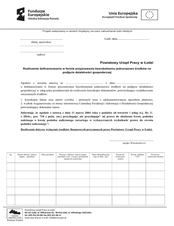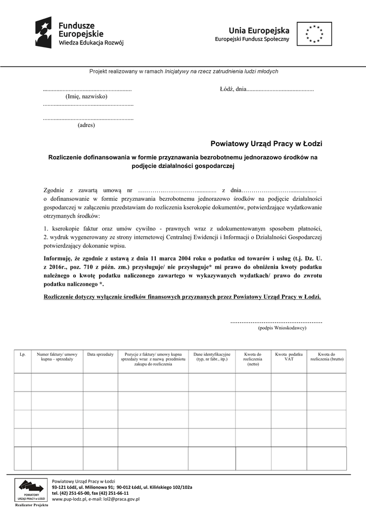 …....................................................... (Imię, nazwisko) ........................................................... Łódź, dnia............................................ ........................................................... (adres) Powiatowy Urząd Pracy w Łodzi Rozliczenie dofinansowania w formie przyznawania bezrobotnemu jednorazowo środków na podjęcie działalności gospodarczej Zgodnie z zawartą umową nr ………….….…………............. z dnia……………………................. o dofinansowanie w formie przyznawania bezrobotnemu jednorazowo środków na podjęcie działalności gospodarczej w załączeniu przedstawiam do rozliczenia kserokopie dokumentów, potwierdzające wydatkowanie otrzymanych środków: 1. kserokopie faktur oraz umów cywilno - prawnych wraz z udokumentowanym sposobem płatności, 2. wydruk wygenerowany ze strony internetowej Centralnej Ewidencji i Informacji o Działalności Gospodarczej potwierdzający dokonanie wpisu. Informuję, że zgodnie z ustawą z dnia 11 marca 2004 roku o podatku od towarów i usług (t.j. Dz. U. z 2016r., poz. 710 z późn. zm.) przysługuje/ nie przysługuje* mi prawo do obniżenia kwoty podatku należnego o kwotę podatku naliczonego zawartego w wykazywanych wydatkach/ prawo do zwrotu podatku naliczonego *. Rozliczenie dotyczy wyłącznie środków finansowych przyznanych przez Powiatowy Urząd Pracy w Łodzi. .................................................. (podpis Wnioskodawcy) Lp. Numer faktury/ umowy kupna – sprzedaży Data sprzedaży Pozycje z faktury/ umowy kupna sprzedaży wraz z nazwą przedmiotu zakupu do rozliczenia Powiatowy Urząd Pracy w Łodzi 93-121 Łódź, ul. Milionowa 91; 90-012 Łódź, ul. Kilińskiego 102/102a tel. (42) 251-65-00, fax (42) 251-66-11 www.pup-lodz.pl, e-mail: [email protected] Realizator Projektu Dane identyfikacyjne (typ, nr fabr., itp.) Kwota do rozliczenia (netto) Kwota podatku VAT Kwota do rozliczenia (brutto) RAZEM: Oświadczam, iż ww. faktury, umowy kupna sprzedaży nie posłużyły do rozliczenia innego przedsięwzięcia finansowanego ze środków publicznych. Świadomy odpowiedzialności karnej przewidzianej w art. 233 § 1 ustawy z dnia 06 czerwca 1997 roku – Kodeks Karny (t.j. Dz. U. 2016r. poz. 1137) za składanie nieprawdziwych danych oświadczam, że informacje zawarte w niniejszym rozliczeniu są zgodne z prawdą. ........................................................ (podpis Wnioskodawcy) Sprawdzono pod względem merytorycznym,formalnym i rachunkowym. ………………………………. (data i podpis pracownika) POUCZENIE!!! 1. Podstawą rozliczenia środków są faktury oraz umowy cywilno - prawne (umowy kupna - sprzedaży) wraz z udokumentowanym sposobem płatności, wystawione od momentu podpisania umowy, 2. Dokumenty zakupu wystawione poza granicami RP muszą być dostarczone do rozliczenia wraz z tłumaczeniem sporządzonym przez tłumacza przysięgłego,koszt tłumacza przysięgłego nie będzie kosztem kwalifikowanym. 3. Koszty poniesione w walucie obcej zostaną przeliczone na złote, według kursu średniego ogłoszonego przez Narodowy Bank Polski ,zgodnie z obowiązującymi przepisami. 4. W przypadku zapłaty gotówkowej na dokumencie powinna być adnotacja „zapłacono” lub „zapłacono gotówką” lub powinien być dostarczony osobny dowód zapłaty. W przypadku zapłaty przelewem lub kartą płatniczą należy dostarczyć potwierdzenie dokonania zapłaty (w sytuacji gdy na przelewie nie widnieje numer dokumentu za który dokonano płatności lub czego zapłata dotyczy należy ponadto przedłożyć zamówienia, faktury proforma, numery aukcji internetowych), 5. Dokumenty potwierdzające zapłatę w formie przelewu na konto bądź dokonane gotówkowo z odroczonym terminem płatności muszą mieć dołączone potwierdzenia zapłaty, 6. Wartość zakupionego sprzętu / rzeczy używanych na umowę kupna - sprzedaży musi być niższa od wartości rynkowej sprzętu fabrycznie nowego, ale jednocześnie wartość każdego zakupionego sprzętu/ rzeczy musi przekraczać 1.000,00 złotych, 7. Honorowane będą tylko umowy kupna - sprzedaży mające wszystkie znamiona umowy cywilno - prawnej, z dołączonym dowodem zapłaty podatku od czynności cywilno – prawnych oraz dowodem uiszczenia należności za zakupione towary. 8. Umowy cywilno - prawne powinny zawierać oznaczenie numeru identyfikacyjnego zakupionego przedmiotu, 9. W przypadku zakupu samochodu należy przedłożyć oryginał i kserokopie dowodu rejestracyjnego pojazdu zarejestrowanego na osobę która otrzymała środki na podjęcie działalności gospodarczej 10.W przypadku zwrotu niewydatkowanej kwoty przyznanego dofinansowania do rozliczenia należy dołączyć dowód wpłaty przedmiotowej kwoty na konto Urzędu. *niepotrzebne skreślić