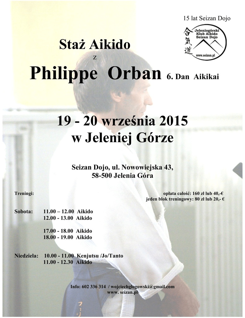 15 lat Seizan Dojo Staż Aikido z Philippe Orban 6. Dan Aikikai 19 - 20 września 2015 w Jeleniej Górze Seizan Dojo, ul. Nowowiejska 43, 58-500 Jelenia Góra opłata całość: 160 zł lub 40,-€ jeden blok treningowy: 80 zł lub 20,- € Treningi: Sobota: 11.00 – 12.00 Aikido 12.00 - 13.00 Aikido 17.00 - 18.00 Aikido 18.00 - 19.00 Aikido Niedziela: 10.00 - 11.00 Kenjutsu /Jo/Tanto 11.00 - 12.30 Aikido Info: 602 336 314 / [email protected] www. seizan.pl