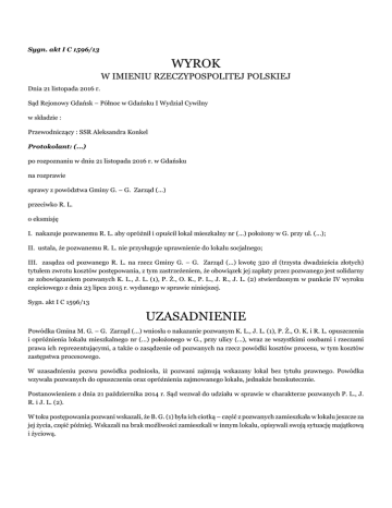 Sygn. akt I C 1596/13 WYROK W IMIENIU RZECZYPOSPOLITEJ POLSKIEJ Dnia 21 listopada 2016 r. Sąd Rejonowy Gdańsk – Północ w Gdańsku I Wydział Cywilny w składzie : Przewodniczący : SSR Aleksandra Konkel Protokolant: (...) po rozpoznaniu w dniu 21 listopada 2016 r. w Gdańsku na rozprawie sprawy z powództwa Gminy G. – G. Zarząd (...) przeciwko R. L. o eksmisję I. nakazuje pozwanemu R. L. aby opróżnił i opuścił lokal mieszkalny nr (...) położony w G. przy ul. (...); II. ustala, że pozwanemu R. L. nie przysługuje uprawnienie do lokalu socjalnego; III. zasądza od pozwanego R. L. na rzecz Gminy G. – G. Zarząd (...) kwotę 320 zł (trzysta dwadzieścia złotych) tytułem zwrotu kosztów postępowania, z tym zastrzeżeniem, że obowiązek jej zapłaty przez pozwanego jest solidarny ze zobowiązaniem pozwanych K. L., J. L. (1), P. Ż., O. K., P. L., J. R., J. L. (2) stwierdzonym w punkcie IV wyroku częściowego z dnia 23 lipca 2015 r. wydanego w sprawie niniejszej. Sygn. akt I C 1596/13 UZASADNIENIE Powódka Gmina M. G. – G. Zarząd (...) wniosła o nakazanie pozwanym K. L., J. L. (1), P. Ż., O. K. i R. L. opuszczenia i opróżnienia lokalu mieszkalnego nr (...) położonego w G., przy ulicy (...), wraz ze wszystkimi osobami i rzeczami prawa ich reprezentującymi, a także o zasądzenie od pozwanych na rzecz powódki kosztów procesu, w tym kosztów zastępstwa procesowego. W uzasadnieniu pozwu powódka podniosła, iż pozwani zajmują wskazany lokal bez tytułu prawnego. Powódka wzywała pozwanych do opuszczenia oraz opróżnienia zajmowanego lokalu, jednakże bezskutecznie. Postanowieniem z dnia 21 października 2014 r. Sąd wezwał do udziału w sprawie w charakterze pozwanych P. L., J. R. i J. L. (2). W toku postępowania pozwani wskazali, że B. G. (1) była ich ciotką – część z pozwanych zamieszkała w lokalu jeszcze za jej życia, część później. Wskazali na brak możliwości zamieszkali w innym lokalu, opisywali swoją sytuację majątkową i życiową. W dniu 23 lipca 2015 r. Sąd wydał wyrok częściowy (zaoczny w stosunku do J. L. (1), P. Ż., O. K.), w którym nakazał pozwanym K. L., J. L. (1), P. Ż., O. K., P. L., J. R. i J. L. (2) aby opróżnili i opuścili lokal mieszkalny ustalając równocześnie, iż pozwanym tym przysługuje uprawnienie do otrzymania lokalu socjalnego. Sąd ustalił następujący stan faktyczny: Lokal mieszkalny nr (...) położony przy ulicy (...) w G. stanowi własność powoda – Gminy G. Zarządu (...). /bezsporne/ Najemcą przedmiotowego lokalu była B. G. (2), ciotka pozwanej K. L.. Pozwana od dzieciństwa zamieszkiwała wraz z ciotką, która wzięła ją na wychowanie. Dzieci K. L., w tym pozwany R. L., wraz z B. G. (2) i matką mieszkały w spornym lokalu. /bezsporne, nadto: umowa najmu – k. 5-6v; przesłuchanie pozwanej K. L., k.97 (protokół elektroniczny) Z uwagi na zadłużenie w płatnościach za lokal w kwocie przekraczającej trzy pełne okresy płatności, pismem z 10 listopada 2005 r. umowa najmu została wypowiedziana B. G. (2), po uprzednim uprzedzeniu o zamiarze wypowiedzenia i wyznaczeniu miesięcznego terminu na spłatę zadłużenia. /bezsporne, nadto dowód: wypowiedzenie umowy – k. 7, uprzedzenie o zamiarze wypowiedzenia – k. 8/ Pozwani zajmują przedmiotowy lokal bez tytułu prawnego, nie opuścili go do chwili obecnej. /bezsporne/ Pozwany R. L. nie korzystał z pomocy społecznej. Nie figurował i nie figuruje w ewidencji osób bezrobotnych lub poszukujących pracy. /dowód: informacja z (...), k. 40, 109-110, informacja z PUP, k. 39, 107/ Pozwany R. L. ma 36 lat, jest kawalerem, nie ma nikogo na utrzymaniu. Aktualnie przebywa w (...)w S., zaś przewidywany termin jego opuszczenia to sierpień 2017 r. Nie posiada żadnego majątku, ma zadłużenie z tytułu kredytu na kwotę ok. 16-17.000 zł. Jest diabetykiem, musi stale przyjmować insulinę. /dowód: zeznania R. L. – k. 207/ Wysokość należności związanych z korzystaniem z lokalu nr (...) przy ul. (...) w G., obowiązująca od stycznia 2008 r. wynosiła 570,48 zł. /dowód: zawiadomienie o zmianie wysokości odszkodowania za bezumowne korzystanie z lokalu – w aktach lokalu/ Sąd zważył, co następuje: Stan faktyczny w sprawie jest w istocie bezsporny. Sąd ustalił okoliczności mające znaczenie dla rozstrzygnięcia sprawy na podstawie załączonych dokumentów oraz przesłuchania pozwanych. Wskazać należy, iż dokumentów tych żadna ze stron nie kwestionowała. Zeznania złożone przez pozwanych Sąd uznał za wiarygodne i również na nich oparł na nich swoje ustalenia. Wobec rozstrzygnięcia żądania pozwu co do pozostałych pozwanych wyrokiem częściowym z dnia 23 lipca 2015 r., w niniejszym wyroku Sąd rozstrzygnął żądanie odnośnie pozwanego R. L.. Powództwo zasługiwało na uwzględnienie. Strona pozwana nie kwestionowała prawidłowości wypowiedzenia stosunku najmu, zatem była to okoliczność bezsporna. Tym niemniej, zdaniem Sądu, wypowiedzenie było skuteczne i dokonane zostało z zachowaniem trybu przewidzianego w art. 11 ust. 2 pkt 2 ustawy z z dnia 21 czerwca 2001 r. o ochronie praw lokatorów, mieszkaniowym zasobie gminy i o zmianie Kodeksu cywilnego. W momencie uprzedzenia o zamiarze wypowiedzenia umowy najmu zaległość przekraczała trzykrotność czynszu i opłat eksploatacyjnych. Mimo upływu zakreślonego terminu, pozwani nie uregulowali zadłużenia. Jakkolwiek z akt lokalowych nie wynika wysokość miesięcznej należności z tytułu opłat za najem obowiązująca w dacie dokonania uprzedzenia, wysokość opłat w roku 2008 (570,48 zł) pozwala poczynić założenie, że opłaty obowiązujące trzy lata wcześniej nie były wyższe, zatem kwota zadłużenia na dzień uprzedzenia o zamiarze wypowiedzenia przekraczała trzykrotność miesięcznych należności. Podstawę prawną żądania pozwu stanowił przepis art. 222 §1 kc, zgodnie z którym właściciel rzeczy może żądać od 