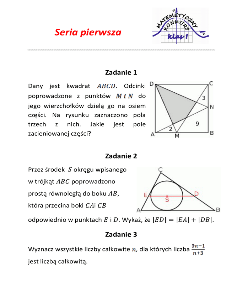 Seria pierwsza Zadanie 1 Dany jest kwadrat poprowadzone z punktów . Odcinki do jego wierzchołków dzielą go na osiem części. Na rysunku zaznaczono pola trzech z nich. Jakie jest pole zacieniowanej części? Przez środek w trójkąt Zadanie 2 okręgu wpisanego poprowadzono prostą równoległą do boku która przecina boki i odpowiednio w punktach , i . Wykaż, że Zadanie 3 Wyznacz wszystkie liczby całkowite , dla których liczba jest liczbą całkowitą. Obwód trójkąta Zadanie 4 jest równy 8. Oblicz obwód trójkąta o wierzchołkach będących środkami środkowych trójkąta Uwaga: środkowa trójkąta to odcinek łączący wierzchołek trójkąta ze środkiem przeciwległego boku. Zadanie 5 Dane są 2 koła styczne zewnętrznie o promieniach 12 i 3 oraz o środkach Do tych kół poprowadzono wspólną styczną, która jest styczna do tych okręgów w punktach odpowiednio Oblicz pole trójkąta punktem przecięcia się prostych i . gdzie Uwagi: jest za bezbłędne rozwiązanie każdego z zadań można uzyskać 5 punktów, każde zadanie musi być rozwiązane na oddzielnej kartce formatu A4, aby wziąć udział w konkursie należy rozwiązać choć jedno zadanie, rozwiązania zadań każdy składa u swego nauczyciela matematyki, termin oddawania zadań pierwszej serii mija 23.10.2015. r.