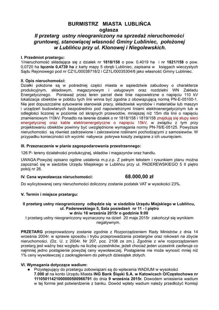 BURMISTRZ MIASTA LUBLIŃCA ogłasza II przetarg ustny nieograniczony na sprzedaż nieruchomości gruntowej, stanowiącej własność Gminy Lubliniec, położonej w Lublińcu przy ul. Klonowej i Niegolewskich. I. Przedmiot przetargu: 1/nieruchomość składająca się z działek nr 1818/158 o pow. 0,4019 ha i nr 1821/158 o pow. 0,0720 ha łącznie 0,4739 ha z karty mapy 5 obręb Lubliniec, zapisana w księgach wieczystych Sądu Rejonowego pod nr CZ1L/00038718/2 i CZ1L/00035304/6 jako własność Gminy Lubliniec. II. Opis nieruchomości: Działki położone są w pośredniej części miasta w sąsiedztwie zabudowy o charakterze produkcyjnym, składowym, magazynowym i usługowym oraz rozdzielni WN Zakładu Energetycznego. Ponieważ przez teren parcel dwie linie napowietrzne o napięciu 110 kV lokalizacja obiektów w pobliżu tych linii winna być zgodna z obowiązującą normą PN-E-05100-1. Nie jest dopuszczalne sytuowanie stanowisk pracy, składowisk wyrobów i materiałów lub maszyn i urządzeń budowlanych bezpośrednio pod napowietrznymi liniami elektroenergetycznym lub w odległości liczonej w poziomie od skrajnych przewodów, mniejszej niż 15m dla linii o napięciu znamieniowym 110kV. Ponadto na terenie działek o nr 1818/158 i 1819/158 znajdują się słupy sieci energetycznej oraz kable elektroenergetyczne o napięciu 15kV, w związku z tym przy projektowaniu obiektów powinny być uwzględnione wymagania normy PN-76/E-05125. Powyższe nieruchomości są również zadrzewione i zakrzewione roślinami pochodzącymi z samosiewów. W przypadku konieczności ich wycinki nabywca pokrywa koszty związane z ich usunięciem. III. Przeznaczenie w planie zagospodarowania przestrzennego: 126 P- tereny działalności produkcyjnej, składów i magazynów oraz handlu. UWAGA:Powyżej opisano ogólne ustalenia m.p.z.p. Z pełnym tekstem i rysunkiem planu można zapoznać się w siedzibie Urzędu Miejskiego w Lublińcu przy ul. PADEREWSKIEGO 5 II piętro pokój nr 26. IV. Cena wywoławcza nieruchomości: 68.000,00 zł Do wylicytowanej ceny nieruchomości doliczony zostanie podatek VAT w wysokości 23%. v. Termin i miejsce przetargu: II przetarg ustny nieograniczony odbędzie się w siedzibie Urzędu Miejskiego w Lublińcu, ul. Paderewskiego 5, Sala posiedzeń nr 11 - I piętro w dniu 16 września 2015r o godzinie 9:00 I przetarg ustny nieograniczony wyznaczony na dzień 20 maja 2015r zakończył się wynikiem negatywnym. PRZETARG przeprowadzony zostanie zgodnie z Rozporządzeniem Rady Ministrów z dnia 14 września 2004r. w sprawie sposobu i trybu przeprowadzania przetargów oraz rokowań na zbycie nieruchomości. (Dz. U. z 2004r. Nr 207, poz. 2108 ze zm.). Zgodnie z w/w rozporządzeniem przetarg jest ważny bez względu na liczbę uczestników, jeżeli chociaż jeden uczestnik zaoferuje co najmniej jedno postąpienie powyżej ceny wywoławczej. Postąpienie nie może wynosić mniej niż 1% ceny wywoławczej z zaokrągleniem do pełnych dziesiątek złotych. VI. Wymagania dotyczące wadium: z Przystępujący do przetargu zobowiązani są do wpłacenia WADIUM w wysokości 7.000 zł na konto Urzędu Miasta ING Bank Śląski S.A. w Katowicach O/Częstochowa nr 11105011421000000500966791 do dnia 9 września 2015r. Dowodem wniesienia wadium w tej formie jest potwierdzenie z banku. Dowód wpłaty wadium należy przedłożyć Komisji Przetargowej przed otwarciem przetargu. Datą dokonania wpłaty wadium w pieniądzu jest data wpływu kwoty na rachunek bankowy Gminy. WADIUM: z wpłacone przez oferenta, który przetarg wygra zostanie zaliczone na poczet ceny sprzedaży, z wpłacone przez oferenta, który przetargu nie wygra, zostanie zwrócone po rozstrzygnięciu przetargu, z przepada na rzecz Urzędu Miejskiego w Lublińcu, jeżeli osoba ustalona jako nabywca nieruchomości nie przystąpi bez usprawiedliwienia do zawarcia umowy w miejscu i terminie podanym w zawiadomieniu, VII. Informacje ogólne: z W przetargu mogą brać udział osoby fizyczne lub prawne, które wniosą wadium w wyznaczonym terminie oraz przedłożą Komisji Przetargowej w dniu przetargu następujące dokumenty: 1/osoby fizyczne - dokument potwierdzający tożsamość (dowód osobisty), 2/osoby prawne – aktualny odpis z właściwego dla danego podmiotu rejestru, 3/pełnomocnicy- dokument potwierdzający tożsamość i notarialnie poświadczone pełnomocnictwo o ile uprawnienia do działania w imieniu osób prawnych nie wynikają z innych dokumentów, 4/w przypadku osób fizycznych prowadzących działalność w formie Spółki Cywilnej- umowę spółki oraz stosowne dokumenty do działania w imieniu spółki, 5/osoby prowadzące działalność gospodarczą - elektroniczny wypis z Centralnej Ewidencji i Informacji Działalności Gospodarczej [www.firma..gov.pl] 6/w przypadku osób fizycznych pozostających w związku małżeńskim, w którym obowiązuje ustrój ustawowej wspólności majątkowej w przetargu uczestniczą oboje małżonkowie lub jedno z małżonków, jeżeli posiada pisemne upoważnienie do dokonania określonej czynności prawnej, z Koszty sporządzenia umowy notarialnej oraz opłaty sądowe związane z dokonaniem wpisów w księdze wieczystej ponosi nabywca, z Burmistrz ma prawo odwołania przetargu z ważnych powodów. z Nabywca przejmuje nieruchomość w stanie istniejącym, z Wylicytowana cena nieruchomości nie obejmuje kosztów związanych z okazaniem przebiegu granic. Nabywca we własnym zakresie i na własny koszt może zlecić okazanie lub odtworzenie granic, z Wpłata ceny osiągniętej w przetargu musi być dokonana przed spisaniem umowy notarialnej, tak aby w dniu spisania umowy kwota była zaksięgowana na koncie Urzędu. z Cudzoziemcy w przypadku wygrania przetargu zobowiązani są przed zawarciem umowy notarialnej uzyskać zgodę Ministra Spraw Wewnętrznych i Administracji na nabycie nieruchomości w przypadkach, gdy zgoda taka jest wymagana. Informacji związanych ze zbyciem wyżej opisanej nieruchomo