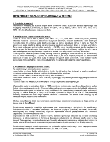 PROJEKT BUDOWLANY BUDOWY ZESPOŁU BOISK SPORTOWYCH WRAZ Z BUDYNKIEM ZAPLECZA SPORTOWEGO ORAZ NIEZBĘDNĄ INFRASTRUKTURĄ TECHNICZNĄ 48-210 Biała, ul. Tysiąclecia; działka nr 1361/1, 1361/2, 1361/3, 1361/4, 1370, 1371, 1372, 1373, 1375, 1391 km.21, obręb Biała OPIS PROJEKTU ZAGOSPODAROWANIA TERENU 1.Przedmiot inwestycji. Przedmiotem inwestycji jest budowa zespołu boisk sportowych wraz z budynkiem zaplecza sportowego oraz niezbędną infrastrukturą techniczną, na działce nr 1361/1, 1361/2, 1361/3, 1361/4, 1370, 1371, 1372, 1373, 1375, 1391, km.21 położonej w miejscowości Biała. 2.Istniejący stan zagospodarowania terenu. Działki nr 1361/1, 1361/2, 1361/3, 1361/4, 1370, 1371, 1372, 1373, 1375, 1391,– zwane dalej działką, stanowią własność inwestora i obecnie są zabudowane budynkami szkolnymi, boiskami sportowymi. Teren działki jest niemalże płaski. W centralnej części działki przebiega wał ziemny powodując różnicę w trenie ok. 75cm. W południowej części działki ta różnica jest zniwelowana łagodnym nachyleniem działki w kierunku wschodnim. Teren płaski usytuowany jest na średniej wysokości ~+232,95m n.p.m. Na działce znajduje się sieć kanalizacyjna sanitarna oraz sieć kanalizacyjna deszczowa. Od strony wschodniej w ulicy Lipowej znajduje się zabudowana sieć wodociągowa, przeciwpożarowego zaopatrzenia w wodę oraz odrębna sieć kanalizacji deszczowej. Działka posiada także bezpośredni dostęp do drogi publicznej gminnej od strony zachodniej (ul. Stare Miasto) oraz od strony wschodniej (ul. Lipowa). Na działce znajdują się także miejsca postojowe dla samochodów osobowych w ilości ok.~20szt. które służą do obsługi istniejących boisk sportowych. Teren okoliczny działki stanowią od strony zachodniej i wschodniej zabudowania mieszkalne jednorodzinne oraz drogi publiczne. 3.Projektowane zagospodarowanie terenu. Na przedmiotowym terenie planuje się wykonać: -nowe boiska sportowe (boisko wielofunkcyjne, boisko do piłki nożnej, kort tenisowy) w pełni wyposażone i ogrodzone w miejscu gdzie aktualnie znajdują się istniejące boiska asfaltowe, -nowy budynek zaplecza przeznaczony do obsługi boisk sportowych, -nowy układ utwardzeń terenu z kostki brukowej zapewniający odpowiednią komunikację pomiędzy boiskami sportowym, -wykonać niezbędna infrastruktura techniczną do obsługi budynku oraz boisk sportowych. W zachodniej części w sąsiedztwie działki nr 1365 znajduje się istniejący plac utwardzony, który obecnie spełnia funkcję miejsc parkingowych na ok.~20 samochodów osobowych przeznaczonych do obsługi boisk istniejących. Postanowiono wykorzystać to miejsce bez zmian projektowych dla zapewnienia wymaganych miejsc postojowych (wg m.p.z.p. miasta Biała jest to 10m.p. na 100 miejsc użytkowych – R8,par.32, ust.1,okt.17). Dla planowanej inwestycji zabezpieczona ilość miejsc spełnia założenia z naddatkiem. Na terenie działki znajdują się też istniejące miejsca przeznaczone dla rowerów. Obsługa komunikacyjna działki zapewniona jest przez istniejące połączenie komunikacyjne z drogą gminną (ul. Lipowa oraz ul. Stare Miasto) Przedmiotowa inwestycja przewiduje wykonywanie prac przyłączeniowych niezbędnych do prawidłowego funkcjonowania obiektu kompleksu sportowego. Na wykonane przyłącza (kanalizacji sanitarnej, deszczowej, wodociągowej oraz energii elektrycznej) uzyskano odpowiednie warunki przyłączeniowe oraz dokonano uzgodnienia z właściwym zarządcą sieci. Odprowadzenie wód opadowych z dachu budynku zaplecza sportowego odbywać się poprzez kanalizację deszczową z odprowadzeniem do kanalizacji deszczowej zabudowanej na istniejącej działce oraz w ulicy Lipowej. Wody opadowe z terenów utwardzonych (chodniki) odprowadzone zostaną na istniejący teren zielony na działce własnej. Ukształtowanie terenu zapobiega przedostawaniu się wód opadowych na działkę sąsiednią. Przedmiotowa inwestycja została opracowana na podstawie zapisów miejscowego planu zagospodarowania przestrzennego miasta Biała (Uchwała nr XXV/284/09 z dnia 31.08.2009r.). MT PROJEKT Tomasz Rojek ul. Armii Ludowej 8/4, 48-210 Biała tel.: 510 354 014 e-mail: [email protected] PROJEKT BUDOWLANY BUDOWY ZESPOŁU BOISK SPORTOWYCH WRAZ Z BUDYNKIEM ZAPLECZA SPORTOWEGO ORAZ NIEZBĘDNĄ INFRASTRUKTURĄ TECHNICZNĄ 48-210 Biała, ul. Tysiąclecia; działka nr 1361/1, 1361/2, 1361/3, 1361/4, 1370, 1371, 1372, 1373, 1375, 1391 km.21, obręb Biała Teren na której znajduje się planowana inwestycja oznaczony jest jako UO – teren usług edukacji i wychowania. Podstawowe parametry nowej zabudowy wg powyższej ustawy: -Przeznaczenie podstawowe – usługi sportu, rekreacja, terenowe urządzenia sportu i rekreacji. Inwestycja spełnia założenia planu miejscowego. -Teren biologicznie czynny – min 20% powierzchni działki Teren biologicznie czynny po zmianach wyniesie ok.26,42% powierzchni działek -Wskaźnik wielkości zabudowy –do 35% powierzchni działki. Wskaźnik zabudowy po zmianach w zagospodarowaniu terenu wyniesie 24,53% -Wysokość - do 4 kondygnacji nadziemnych w tym poddasze użytkowe oraz do 15m do kalenicy dachu Budynek zaplecza posiada jedną kondygnacje użytkową oraz mieści się w przedziale wysokości do 15m. -Geometria dachu – do 35stopni. Przedmiotowa inwestycja posiada dach dwuspadowy, symetryczny o nachyleniu 20stopni. 4.Zestawienie powierzchni poszczególnych części zagospodarowania działki Tabela zestawienia powierzchni działek nr 1361/1, 1361/2, 1361/3, 1361/4, 1371, 1372, 1373, 1375, STAN ISTNIEJĄCY Parametr STAN PROJEKTOWANY [m2] % [m2] % 19 914,00 100,0 19 914,00 100,0 Powierzchnia zabudowy 4 629,00 23,24 4 885,09 24,53 -budynki szkolne 4 629,00 23,24 4 629,00 23,24 0,00 0,00 256,09 1,29 Powierzchnie utwardzone 9 158,00 46,00 9 766,91 49,05 Powierzchnie biologicznie czynne 6 127,00 30,76 5 262,00 26,42 Powierzchnia działek -budynek zaplecza sportowego 5. Dane informujące czy d